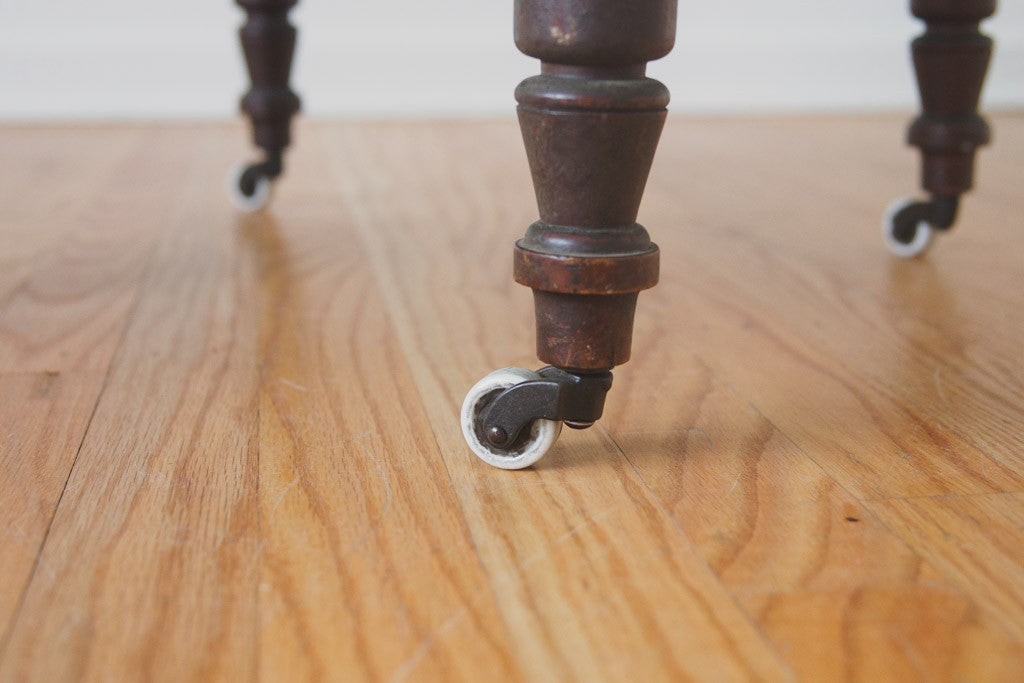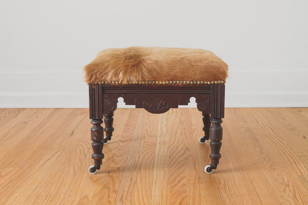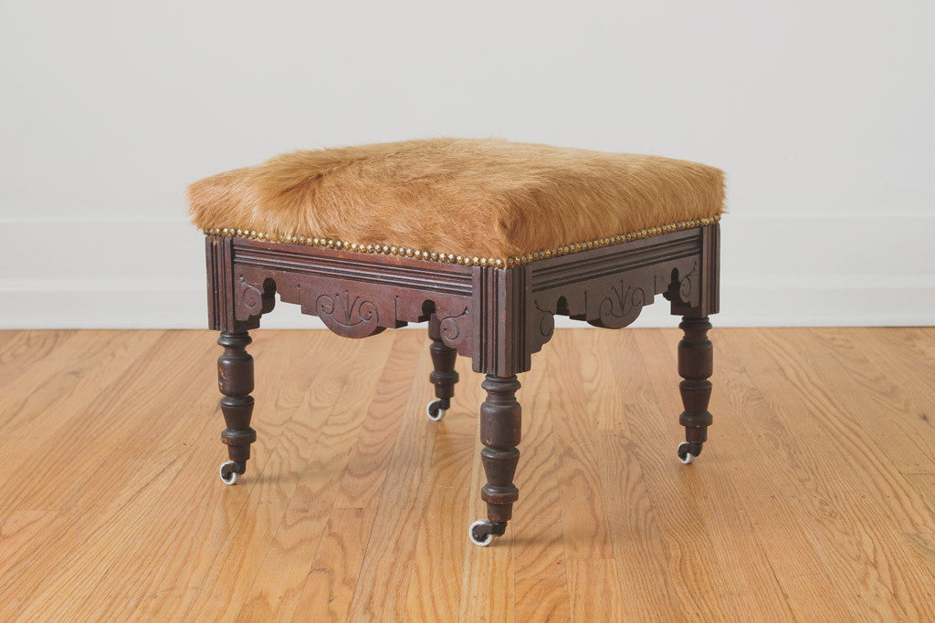 This vintage dark wood Eastlake era ottoman is upholstered in tan deer hide with a carved frame and white ceramic wheels. It's in good shape with age related wear. See pictures for detailed condition.