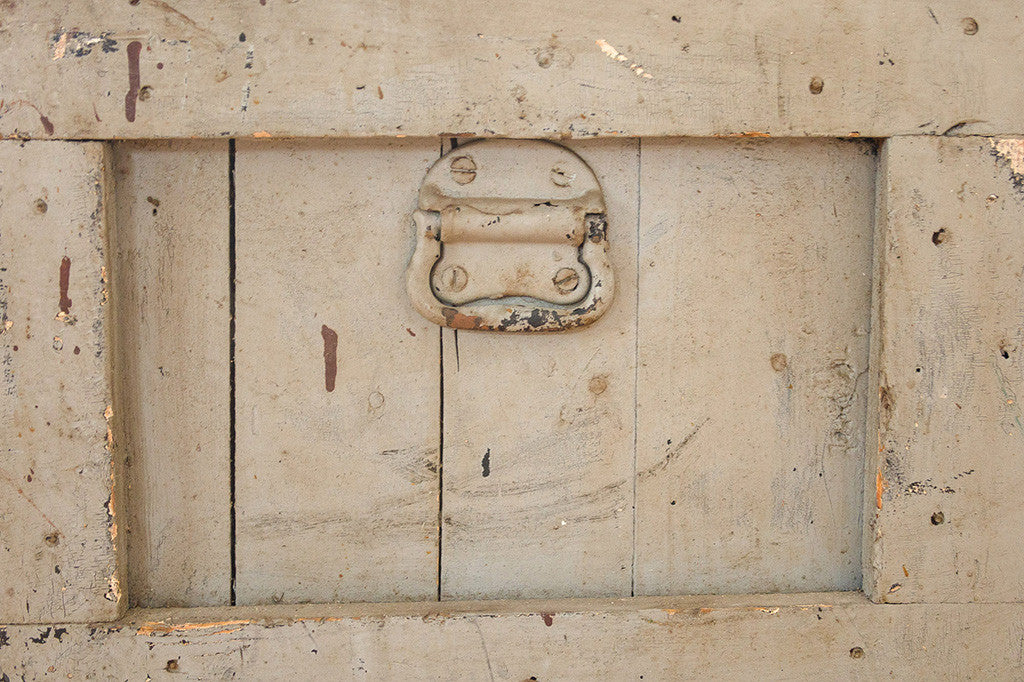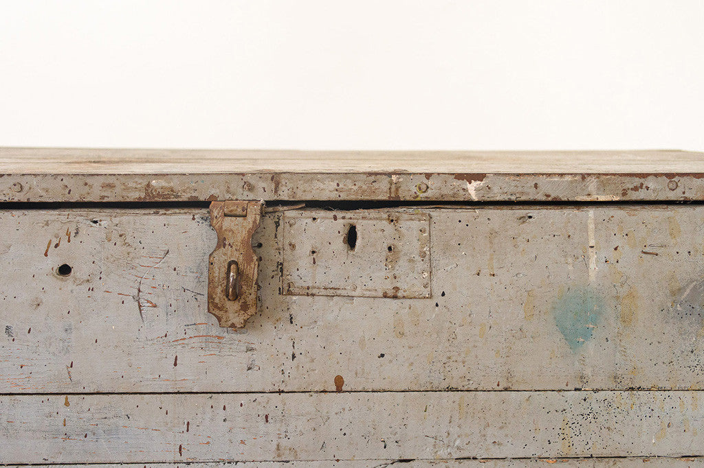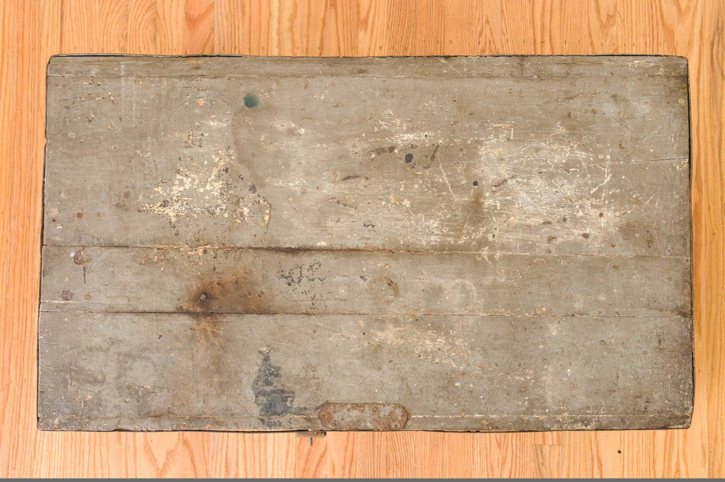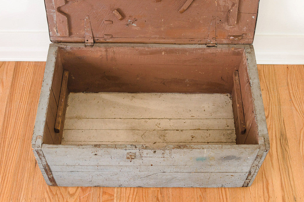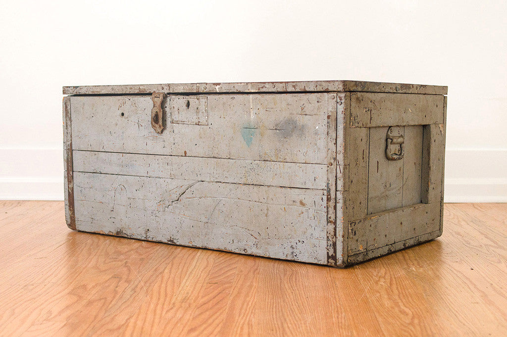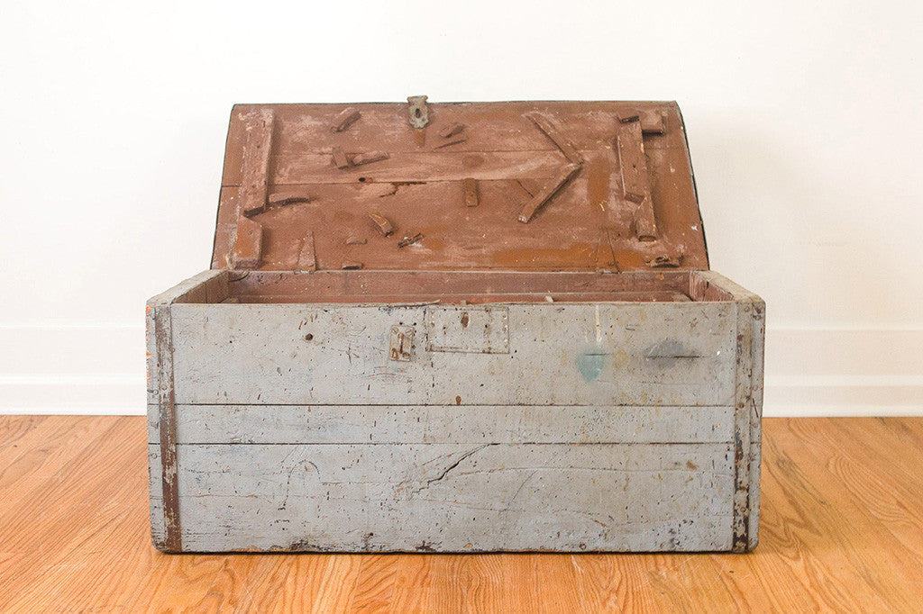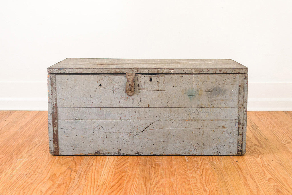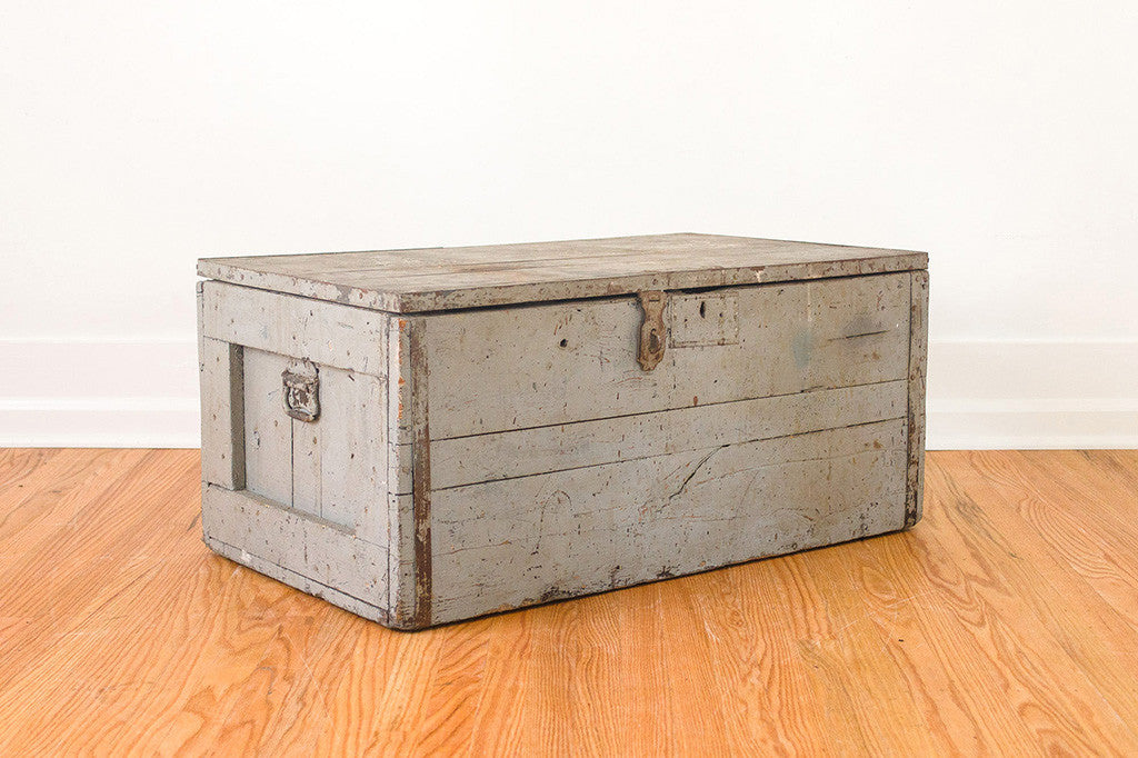 This old wood farm trunk is in great shape. It has a nicely distressed patina, metal hardware and an interior storage tray. It could also be used as a coffee table or end of the bed storage bench. Please see pictures for detailed condition of this piece.