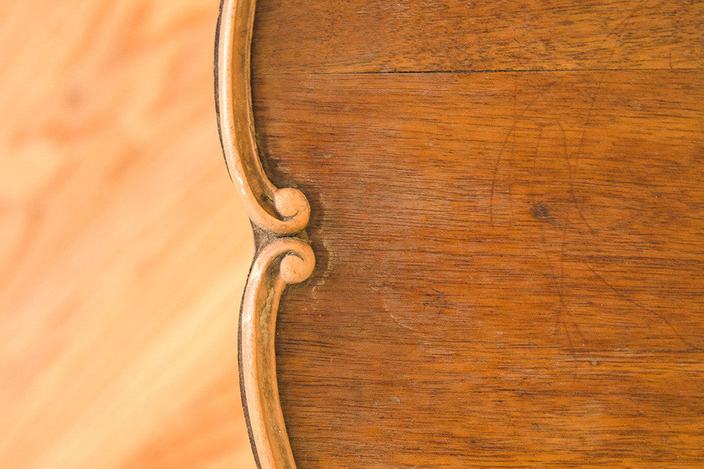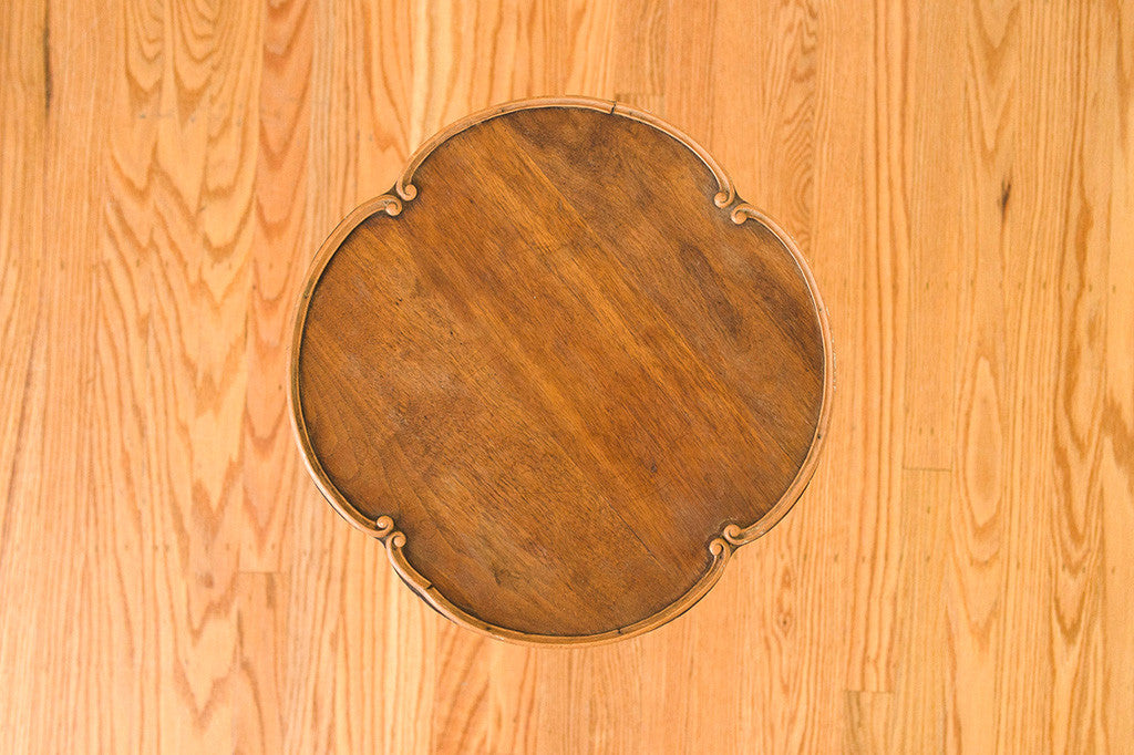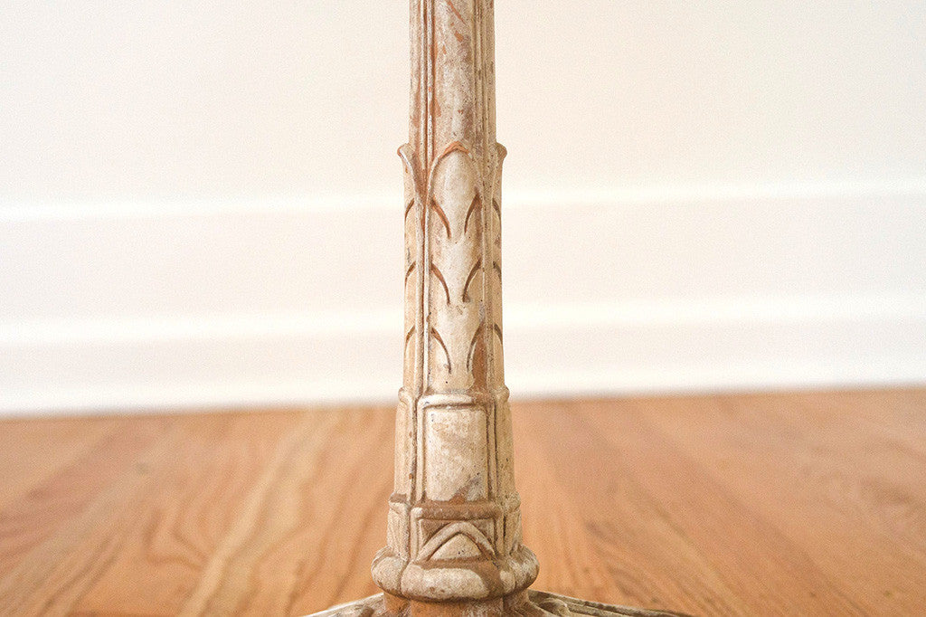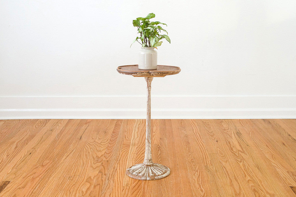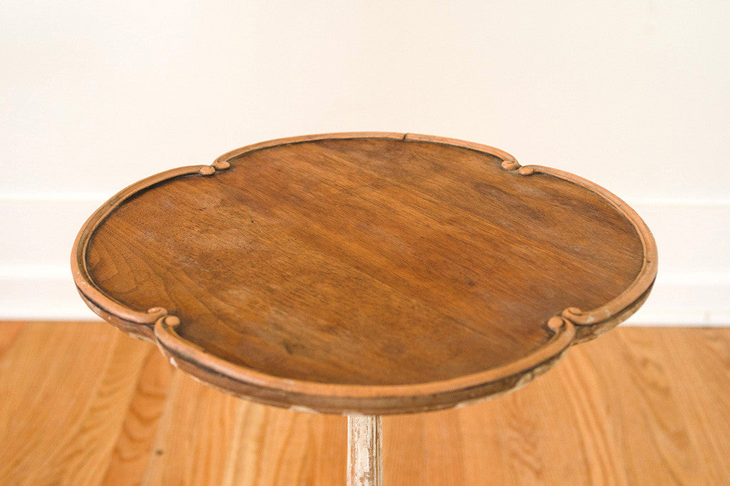This vintage French side table has a distressed white base with a darker oiled top. It would be perfect next to a club chair or sofa but it could also be used as a plant stand or nightstand. Please see pictures for detailed condition of this piece.
