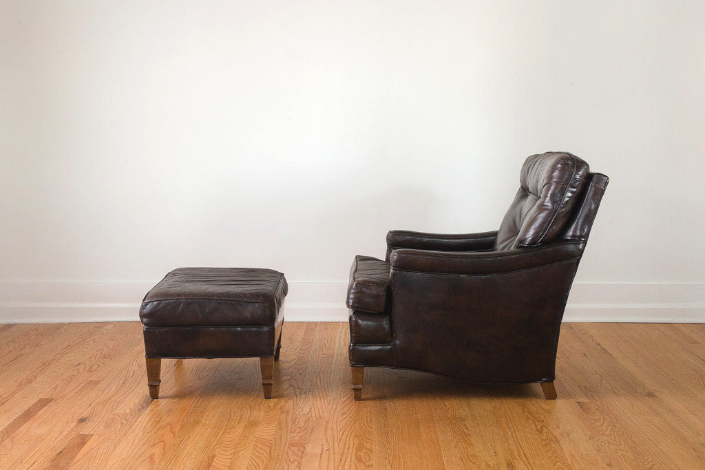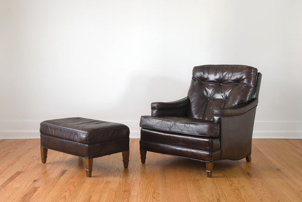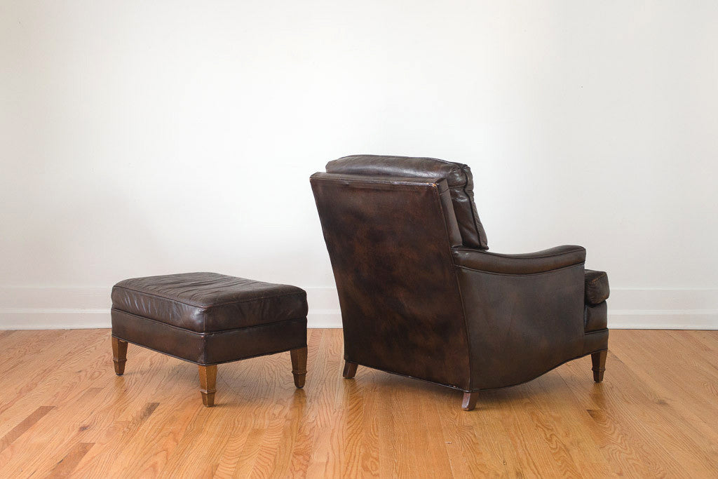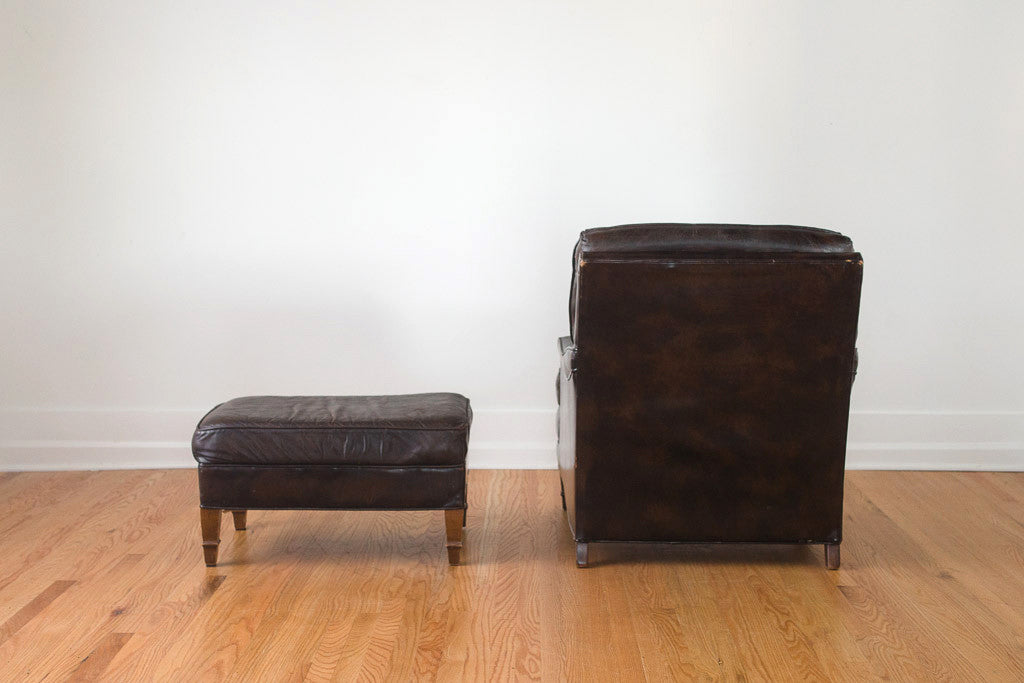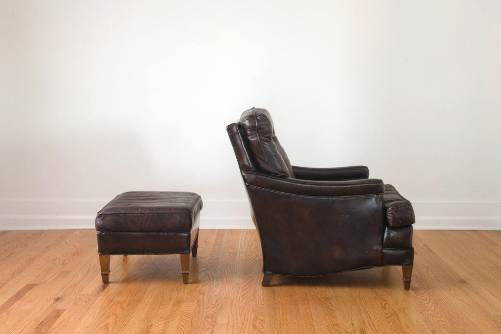 This distressed leather chair and ottoman set are most likely a Drexel Heritage or Schafer Bros. design. The chair sits low and deep, it's very comfortable. There is a small tear on the ottoman but the chair looks too be in good vintage shape minus the decking. Please see pictures for detailed condition of the set.