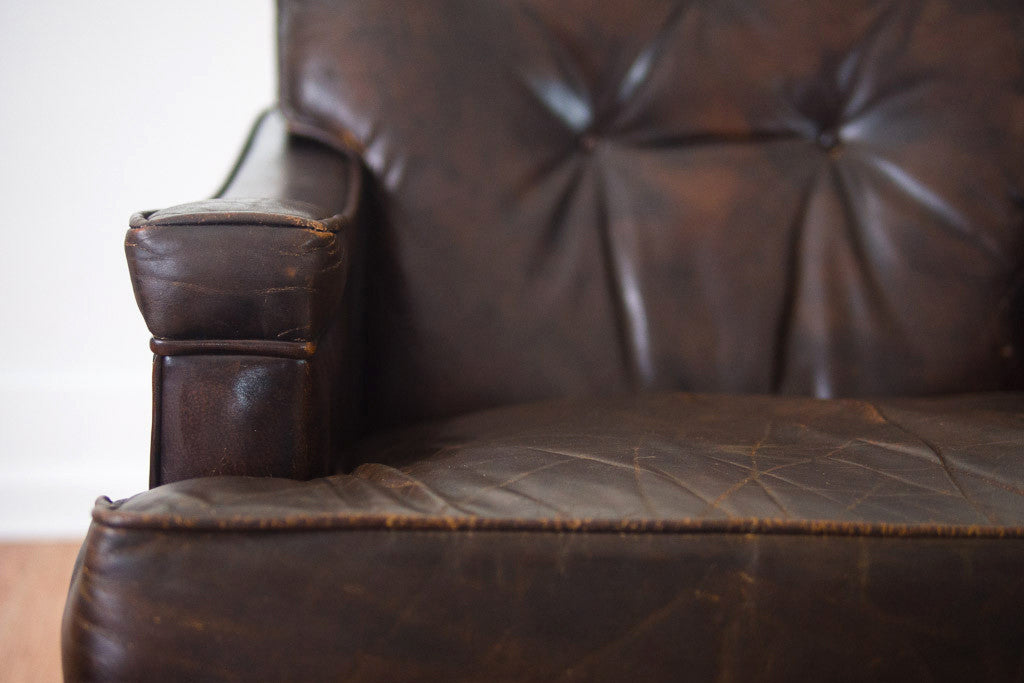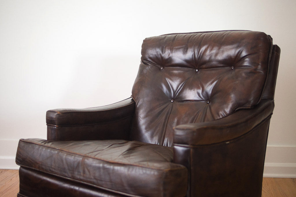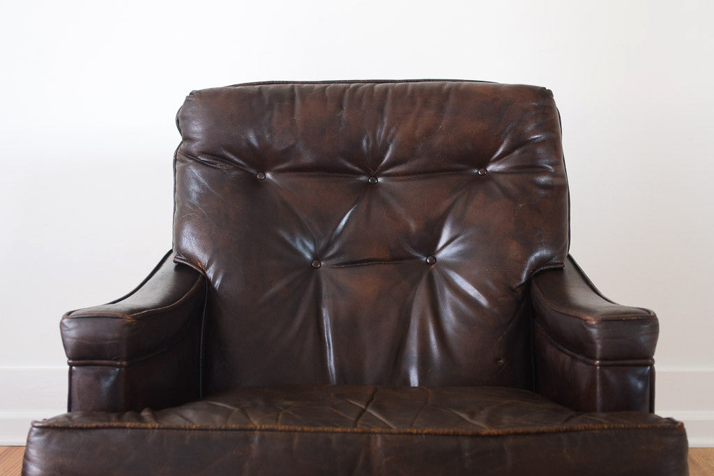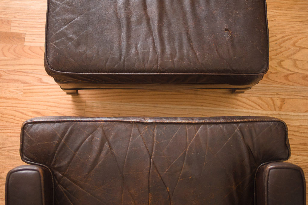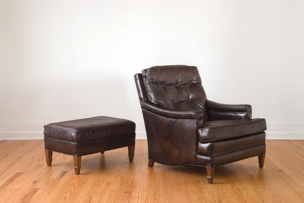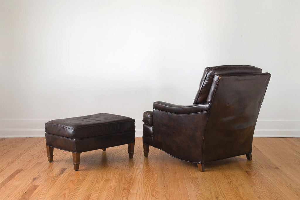 This distressed leather chair and ottoman set are most likely a Drexel Heritage or Schafer Bros. design. The chair sits low and deep, it's very comfortable. There is a small tear on the ottoman but the chair looks too be in good vintage shape minus the decking. Please see pictures for detailed condition of the set.
