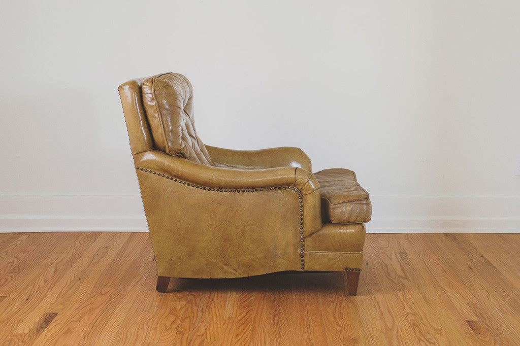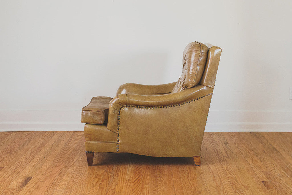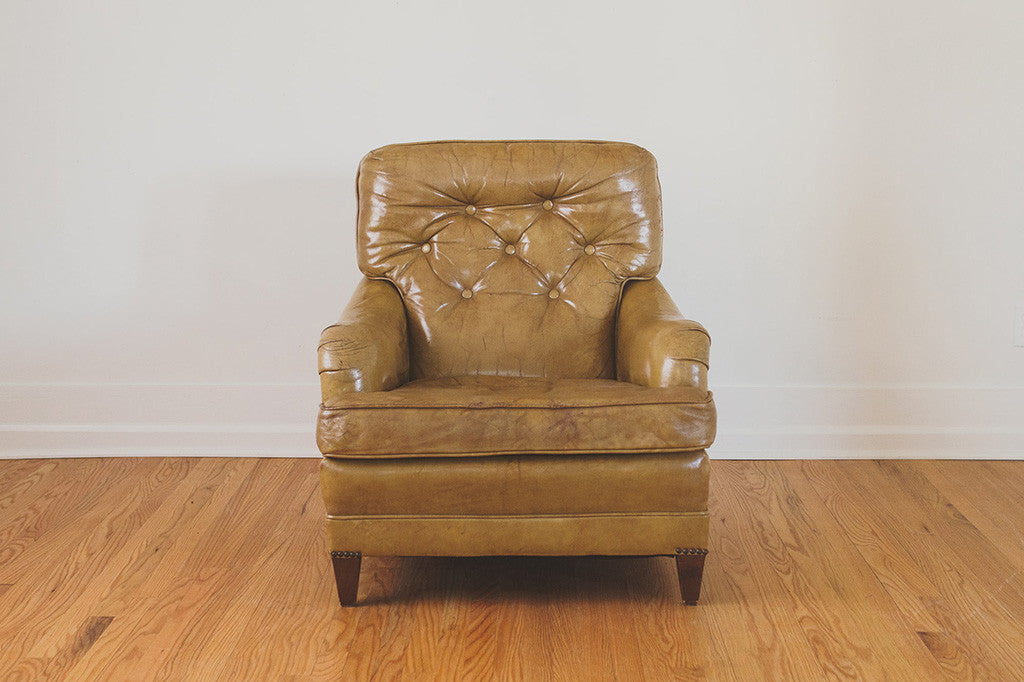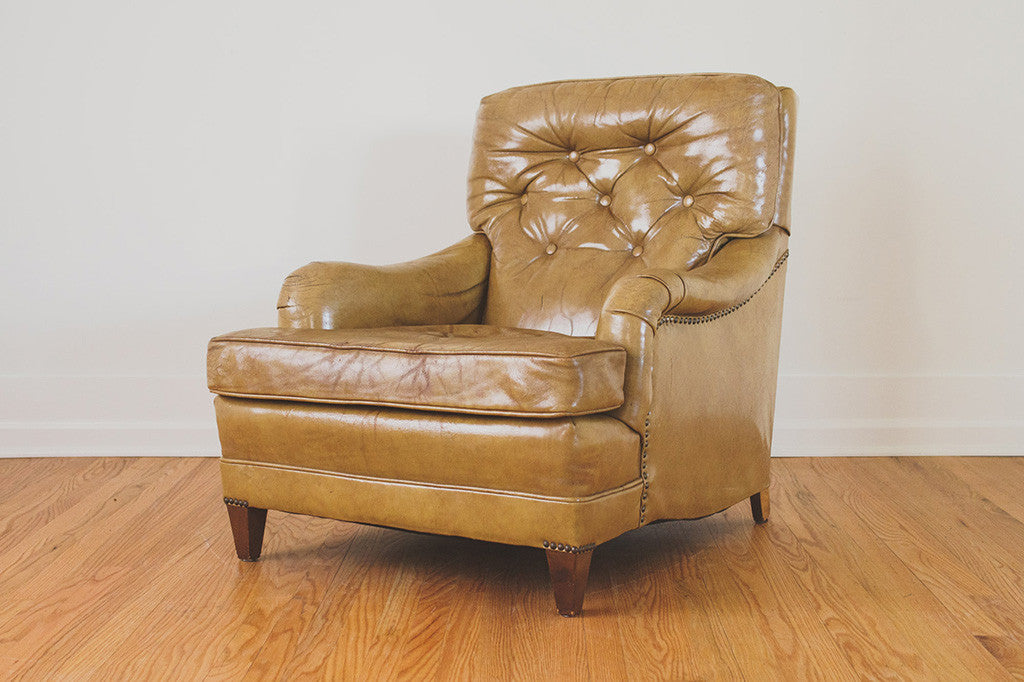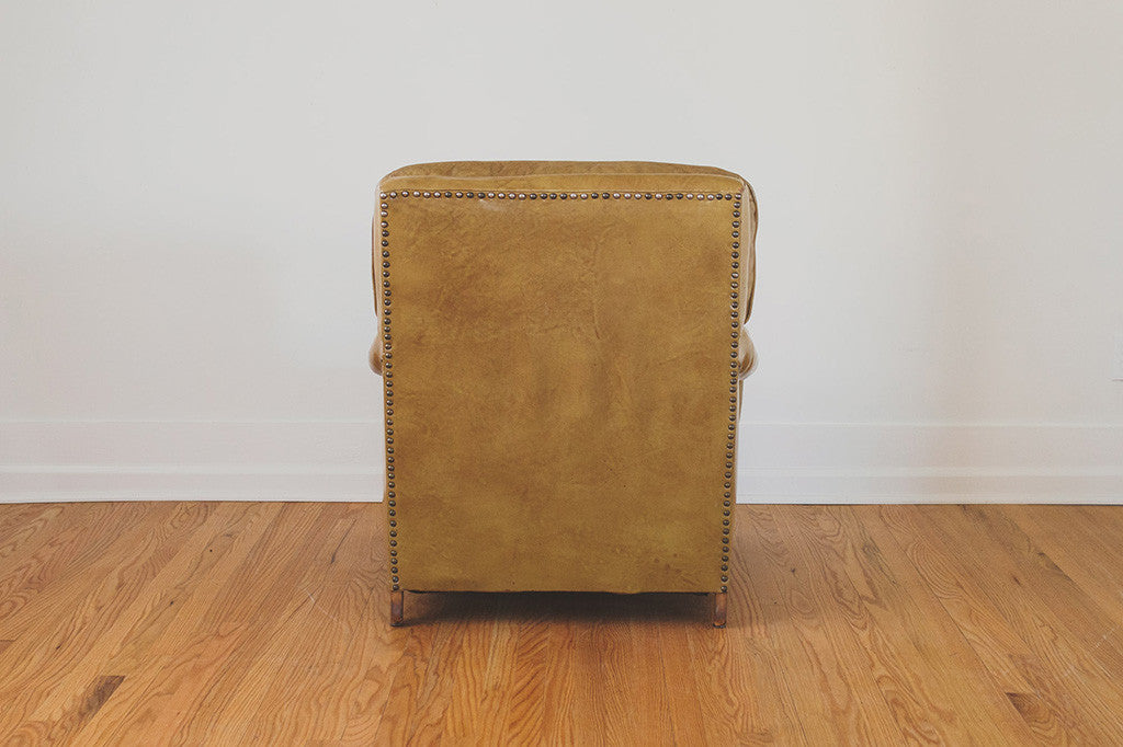 This handsome distressed vintage club chair was manufactured by Schafer brothers. It's a yellow tufted English roll arm style with brass nailhead trim and dark wood legs. This chair is in good overall shape with age related wear. It's very comfortable and would be perfect for reading or watching TV. Please see pictures for detailed condition.