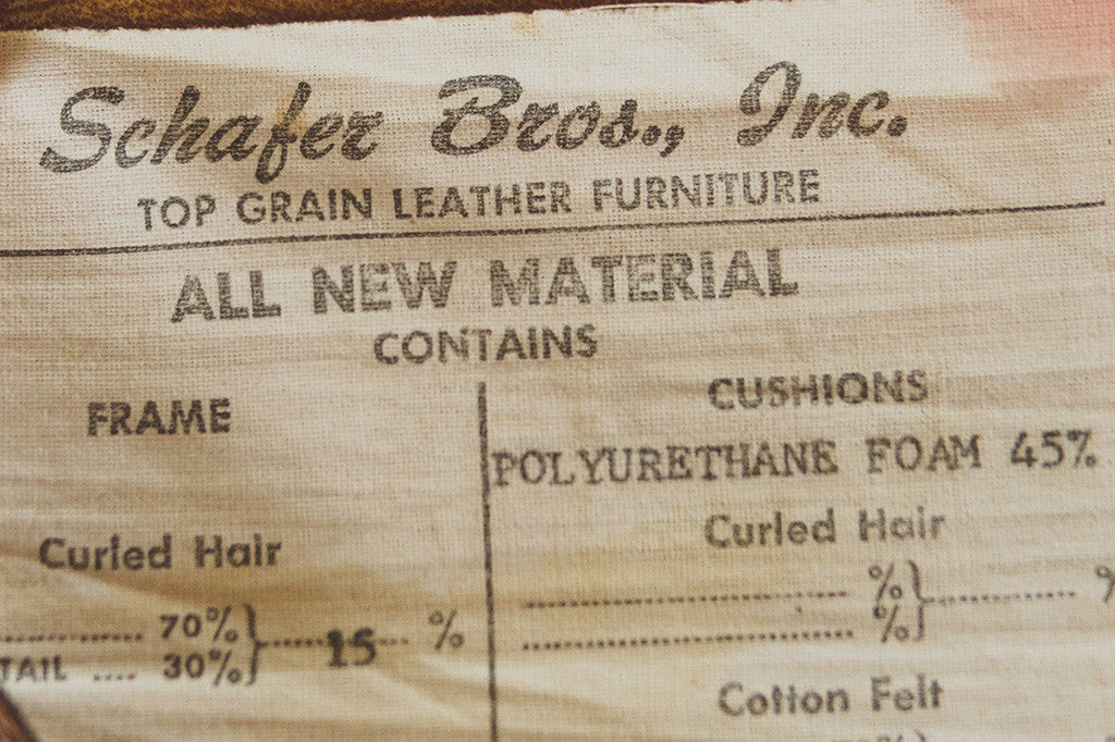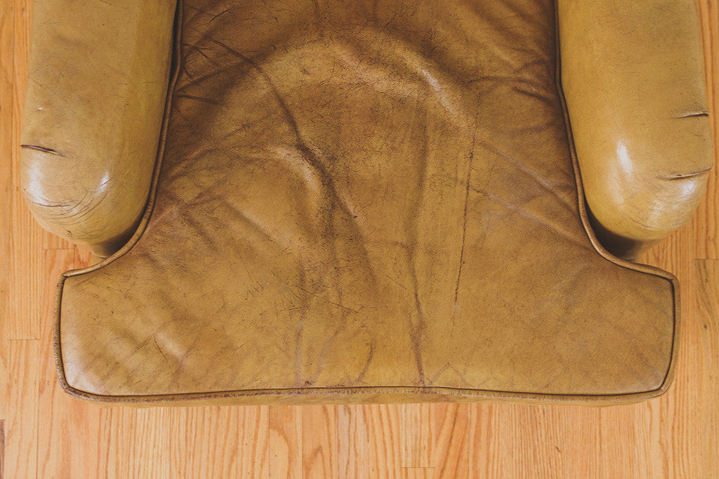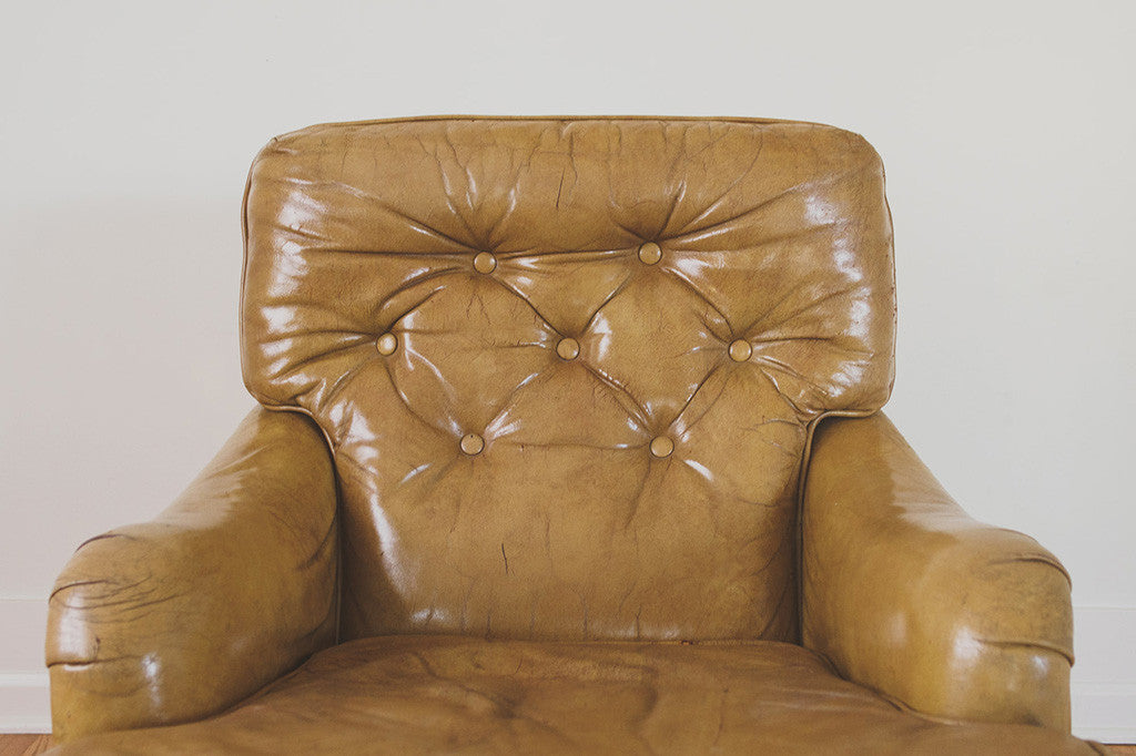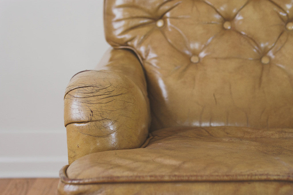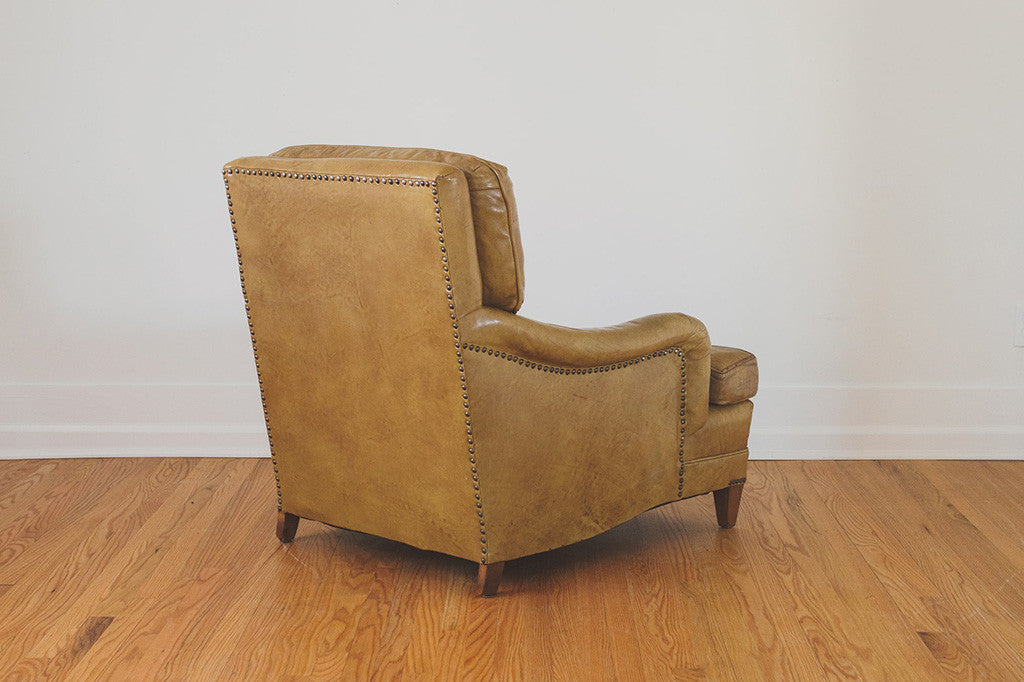 This handsome distressed vintage club chair was manufactured by Schafer brothers. It's a yellow tufted English roll arm style with brass nailhead trim and dark wood legs. This chair is in good overall shape with age related wear. It's very comfortable and would be perfect for reading or watching TV. Please see pictures for detailed condition.