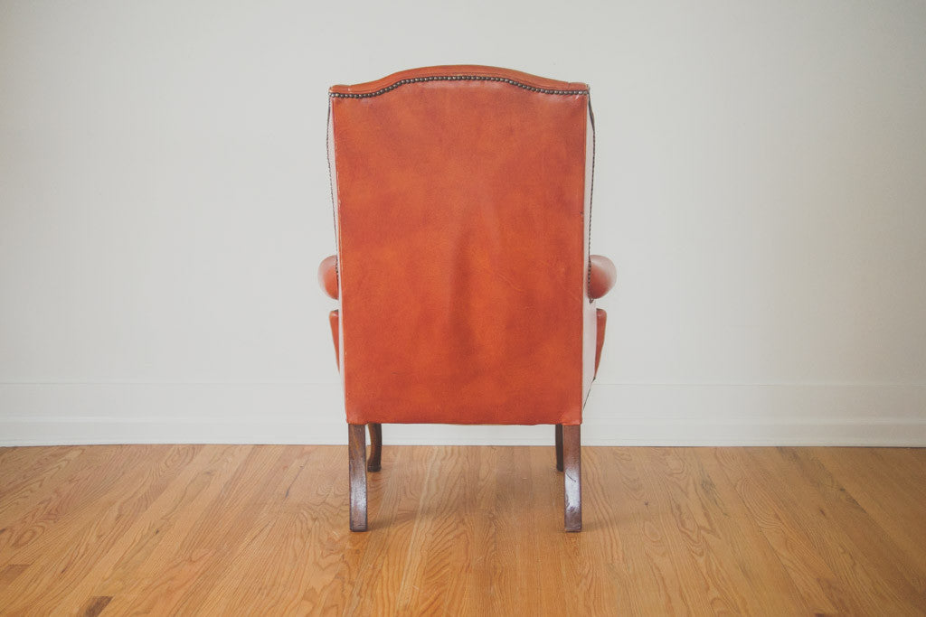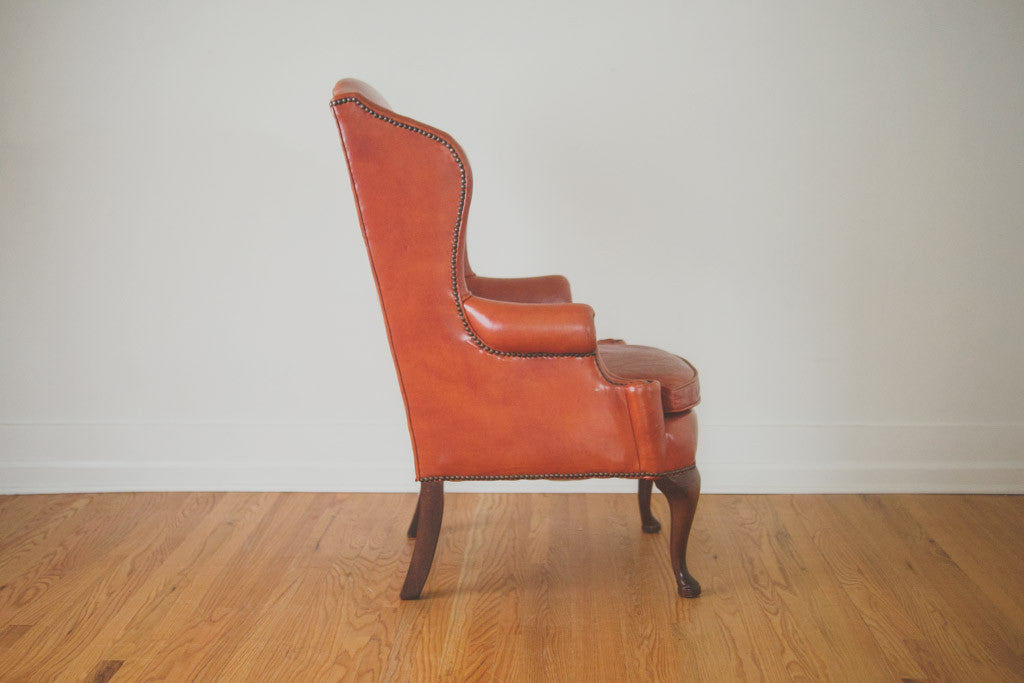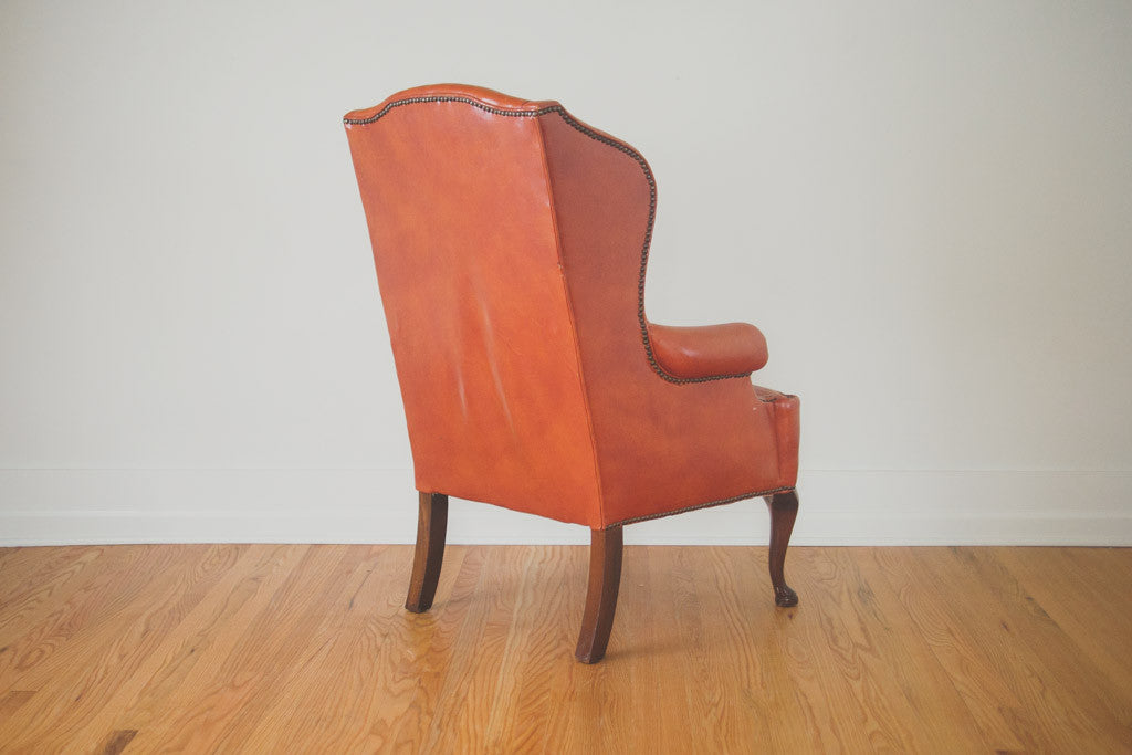 This vintage orange leather wingback was manufactured by Classic Leather in Hickory, North Carolina. It has a detached seat cushion, cabriole legs and brass nailhead trim. It's sturdy and in great shape with age related wear and distressing. It's very comfortable and would be great for watching TV or reading. Please see pictures for detailed condition.