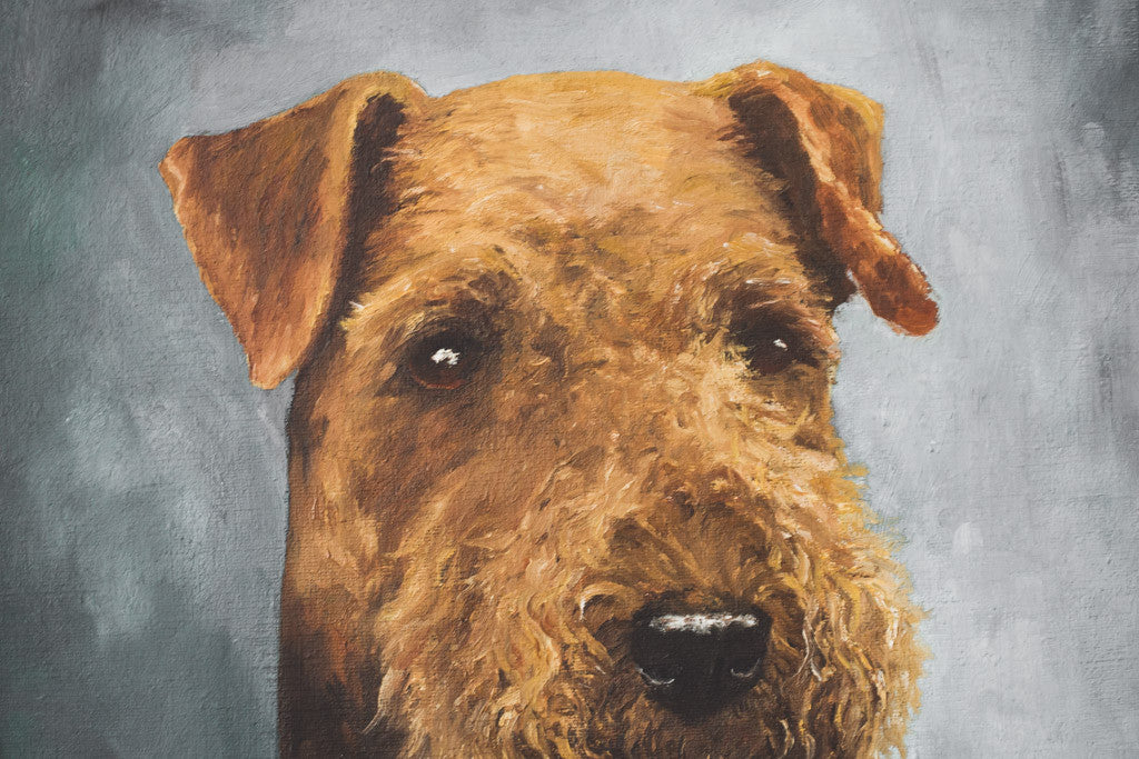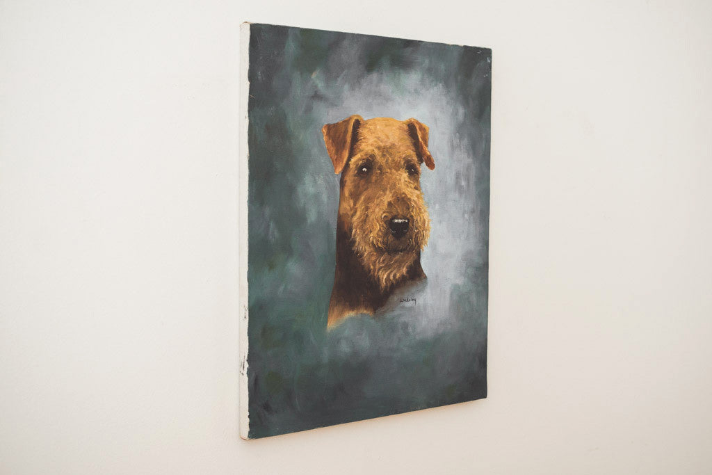 This vintage unframed original oil painting is a portrait of an Airedale (or possibly Welsh) terrier signed, "Wakeley". It's in good shape with age related wear. See pictures for detailed condition.