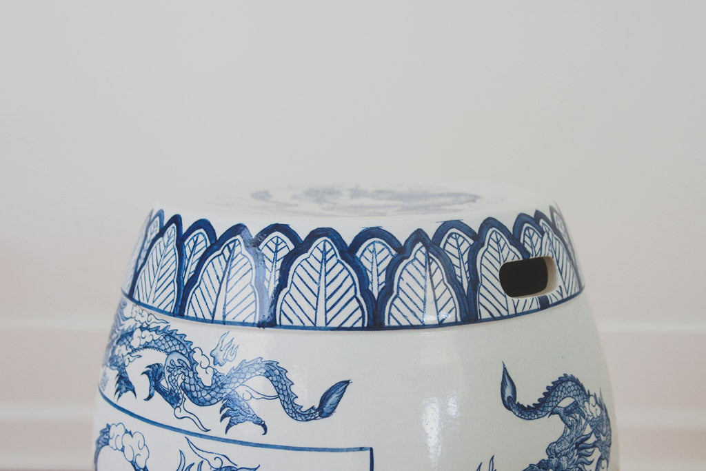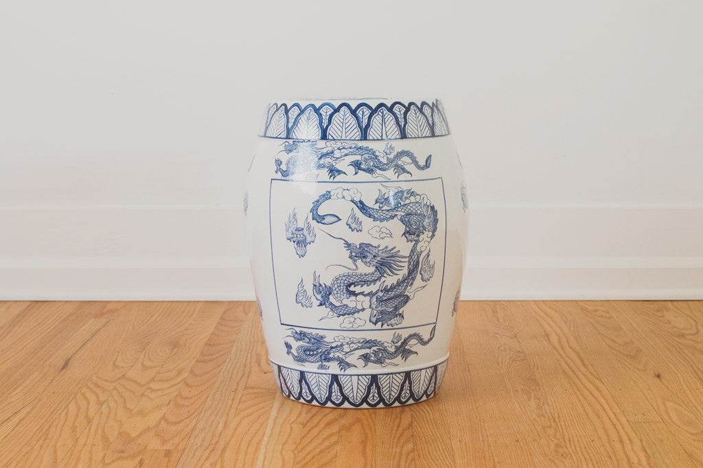 This vintage ceramic stool is white and navy with a dragon design. It's solid, in good shape and would also make a great plant stand or side table. See pictures for detailed condition.