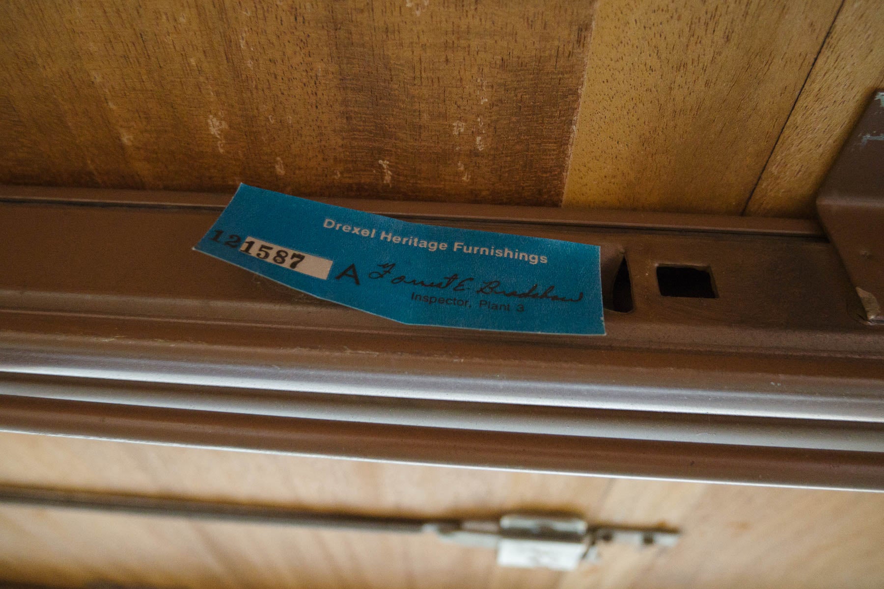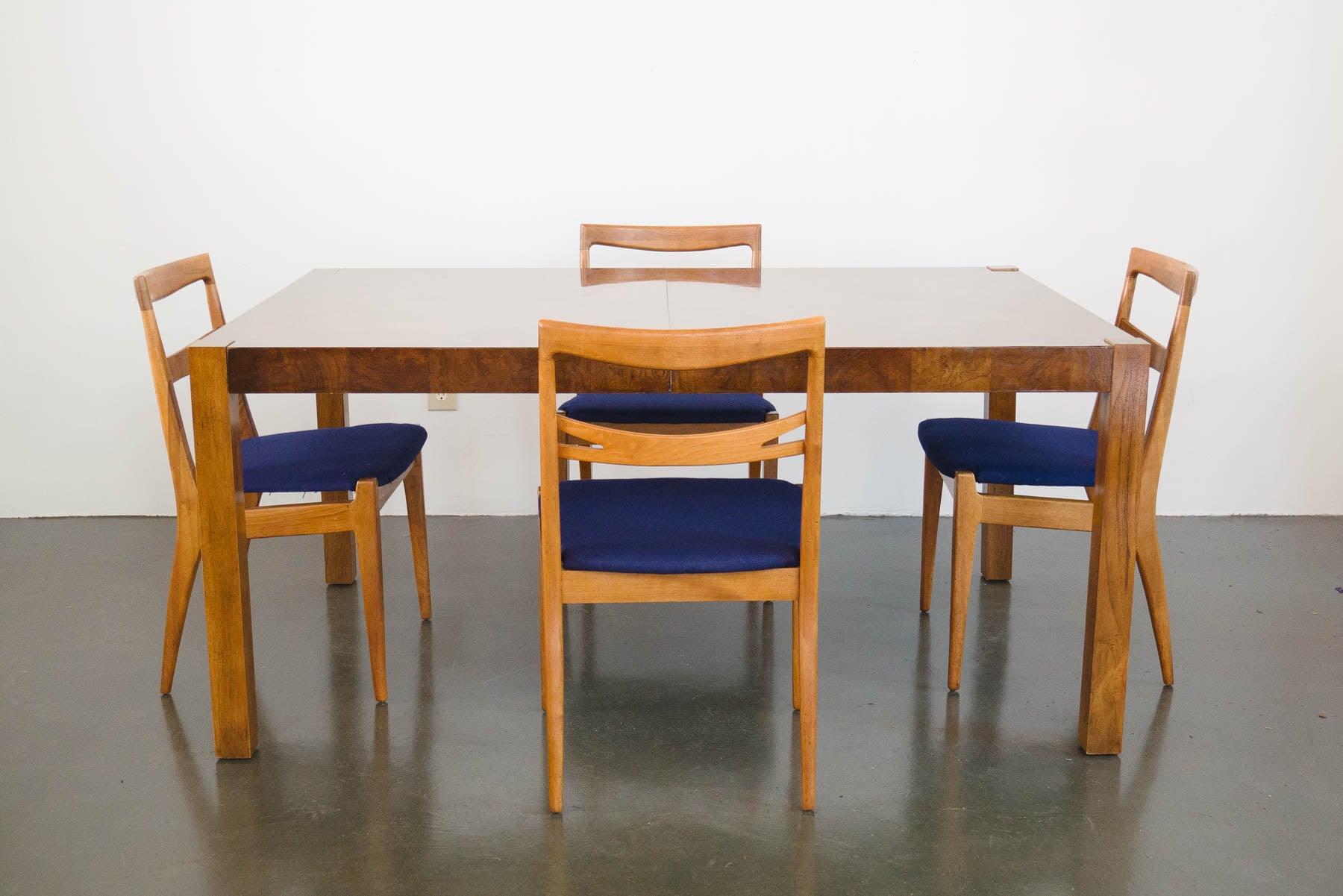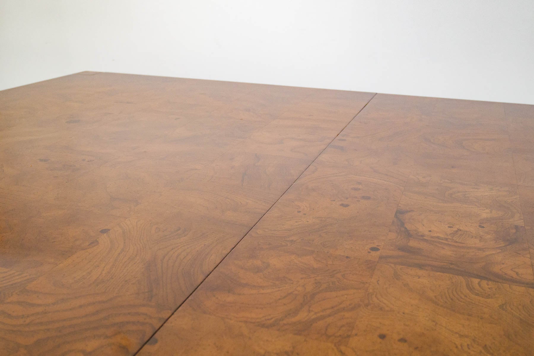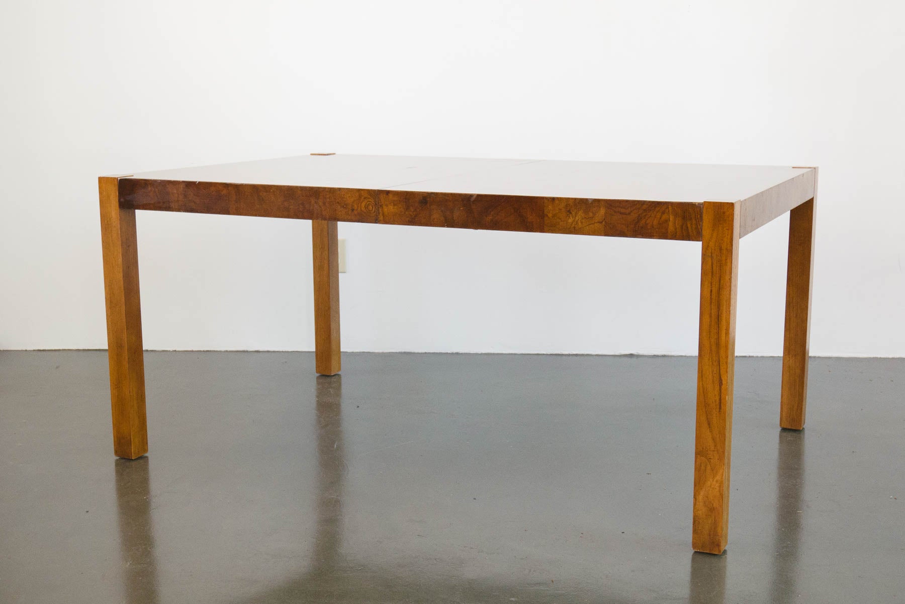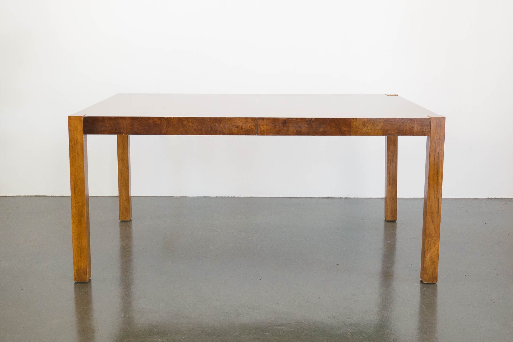 style: modern, parsons, extension (one leaf), dining table, milo baughmanmaterial: wood (patchwork burlwood)brand: Drexelage: vintage, Mid Centurycondition: good, age related wear - see pictures