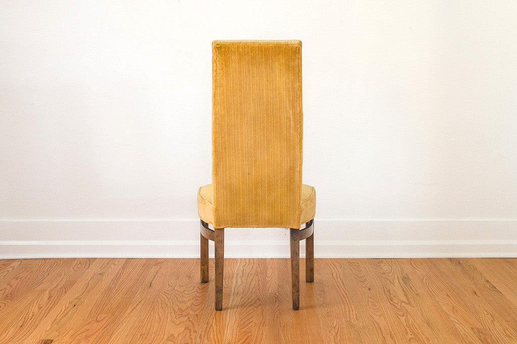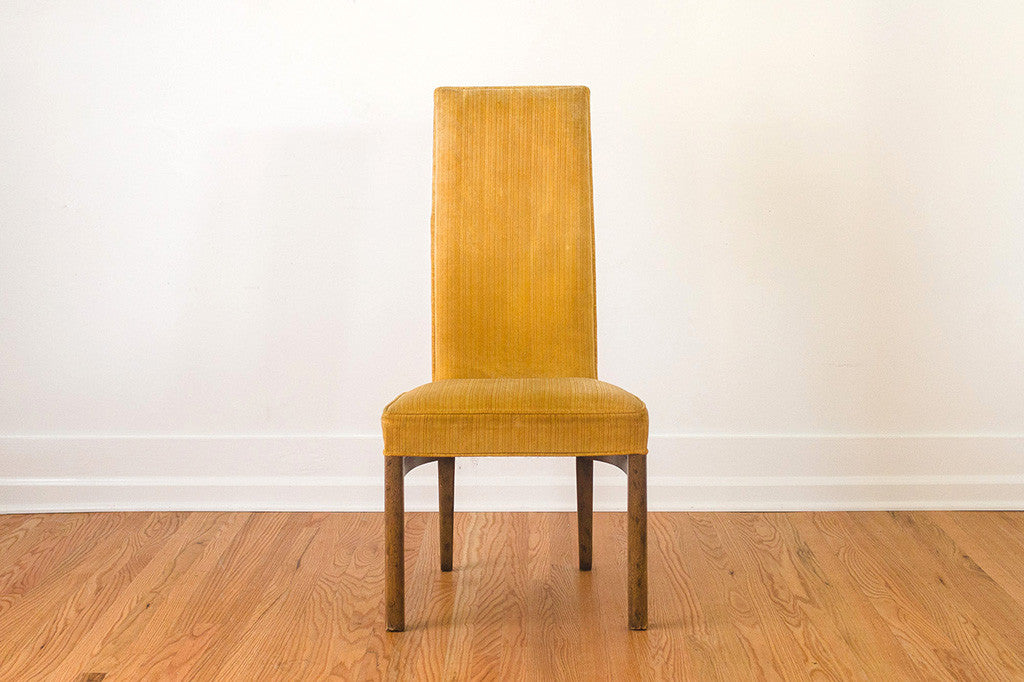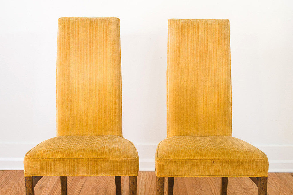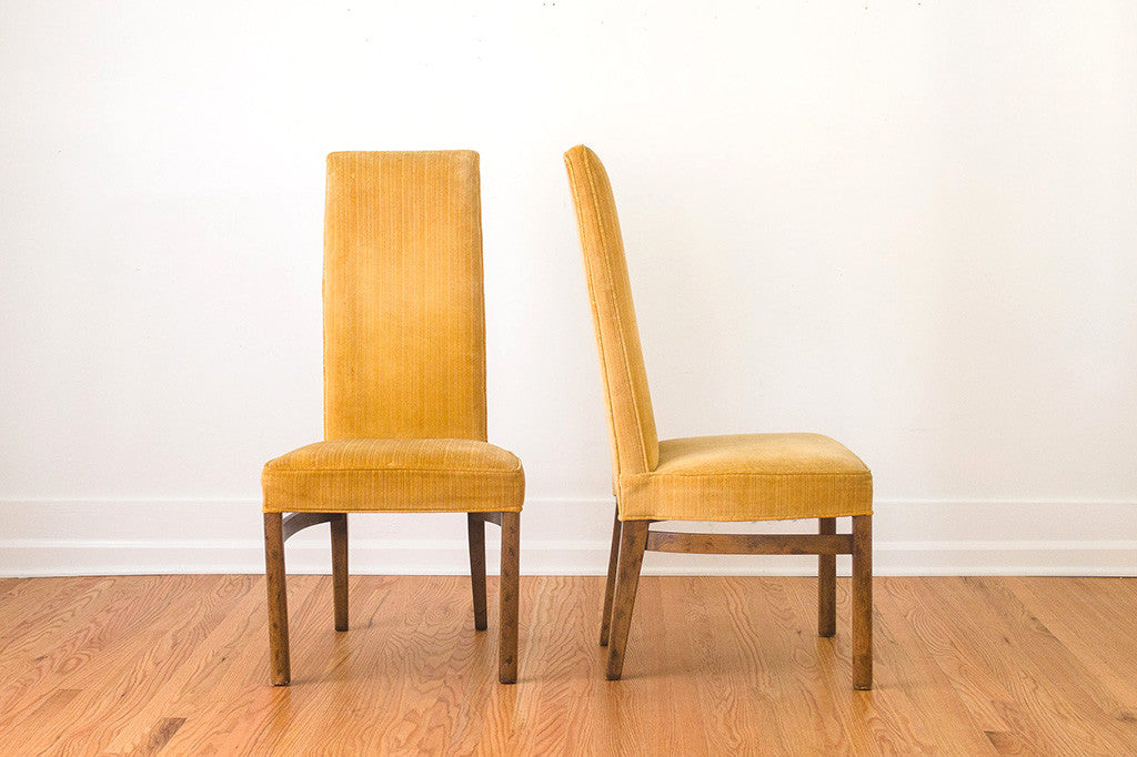 These vintage chairs are upholstered in mustard yellow velvet. They're a high back design by Drexel with dark brown wood frames. They're in great overall shape with some light age related wear. Please see pictures for detailed condition of these pieces.