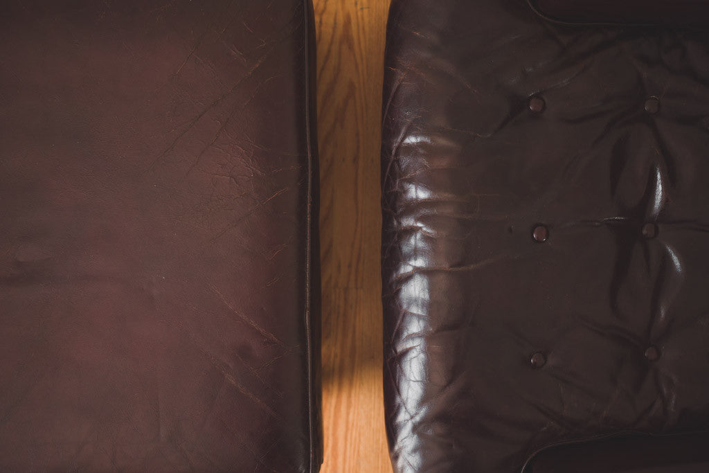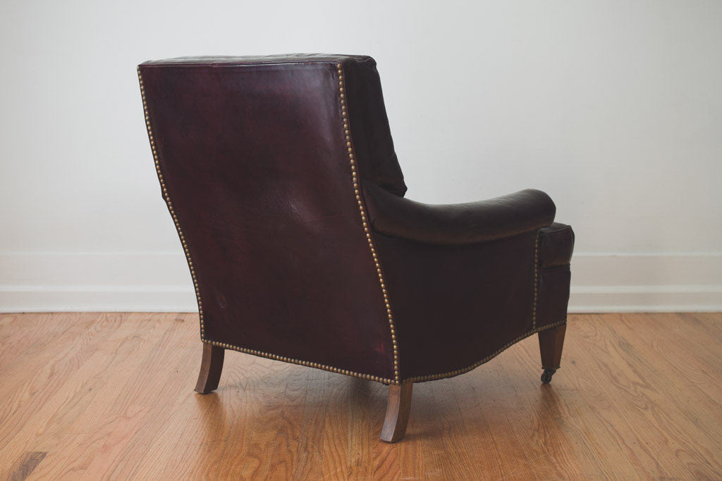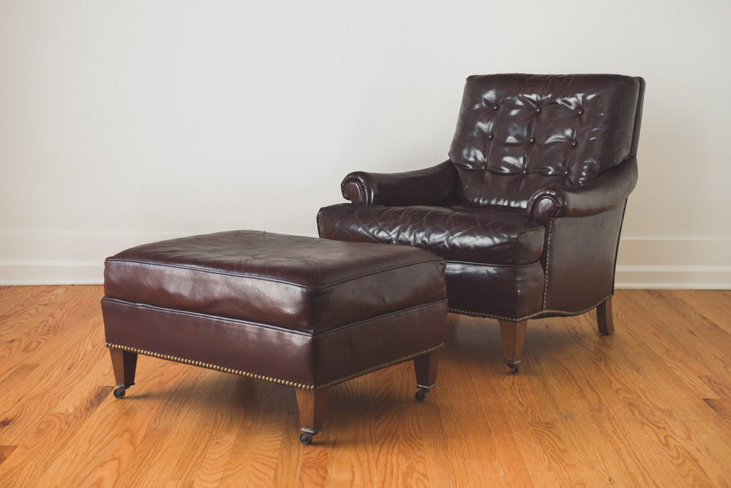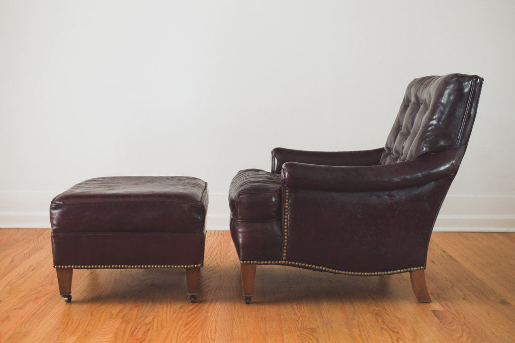This vintage club chair and ottoman set was manufactured by Drexel as part of their Heritage collection. It has tufted leather upholstery with wood legs and brass casters. It's in good shape with age related wear. See pictures for detailed condition.