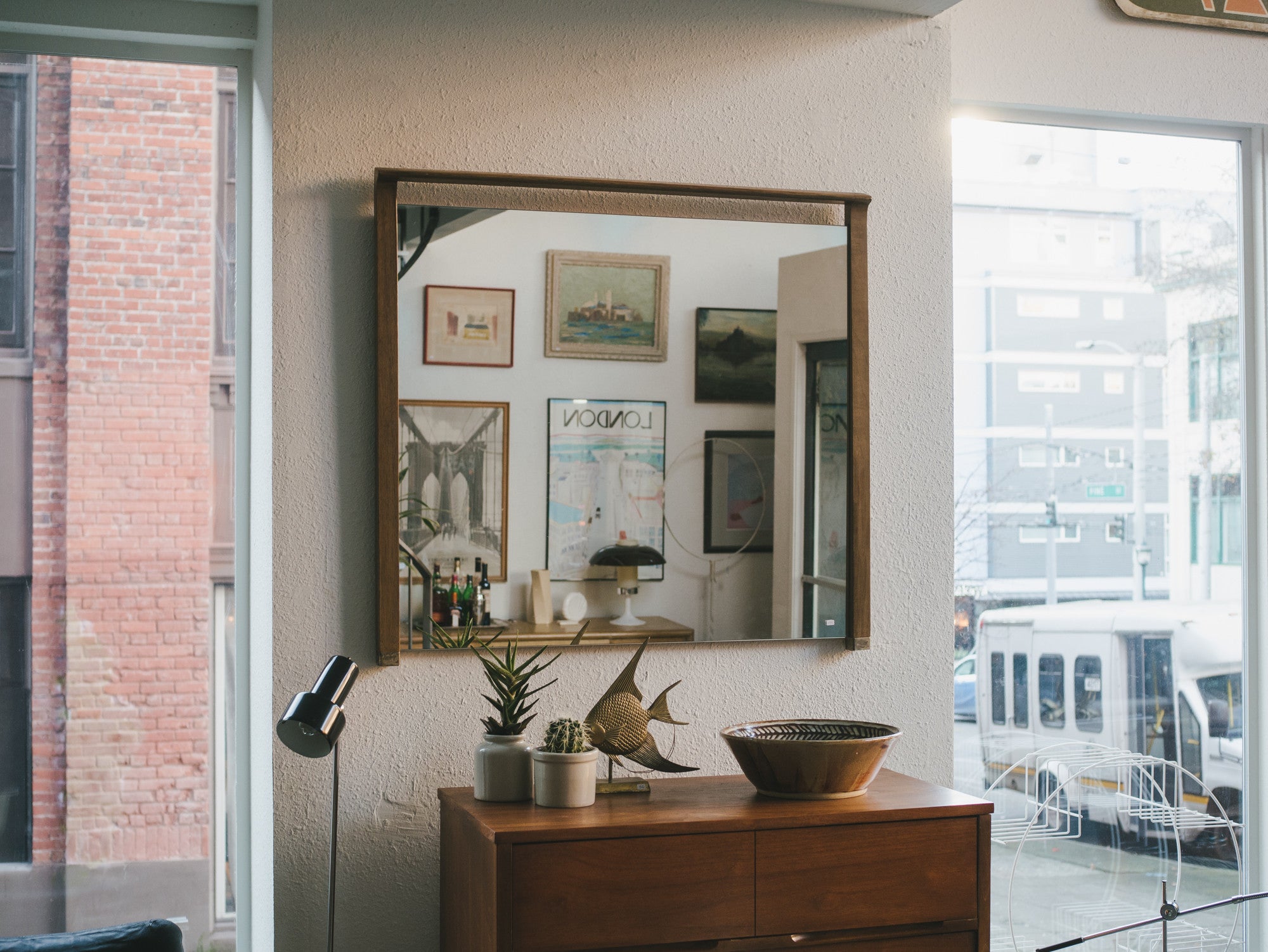 style: Mid Century, walnut trim, mirror, wall mount material: wood, glass, metal brand: Drexel Profile age: vintage condition: good, age related wear - see pictures