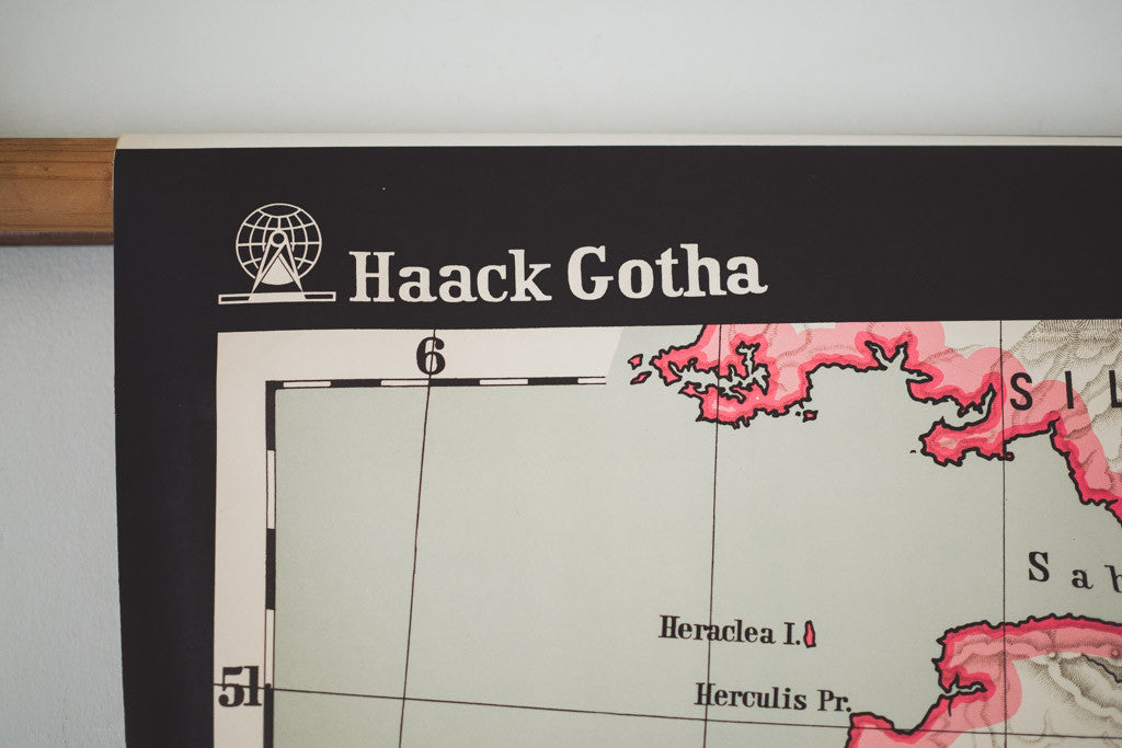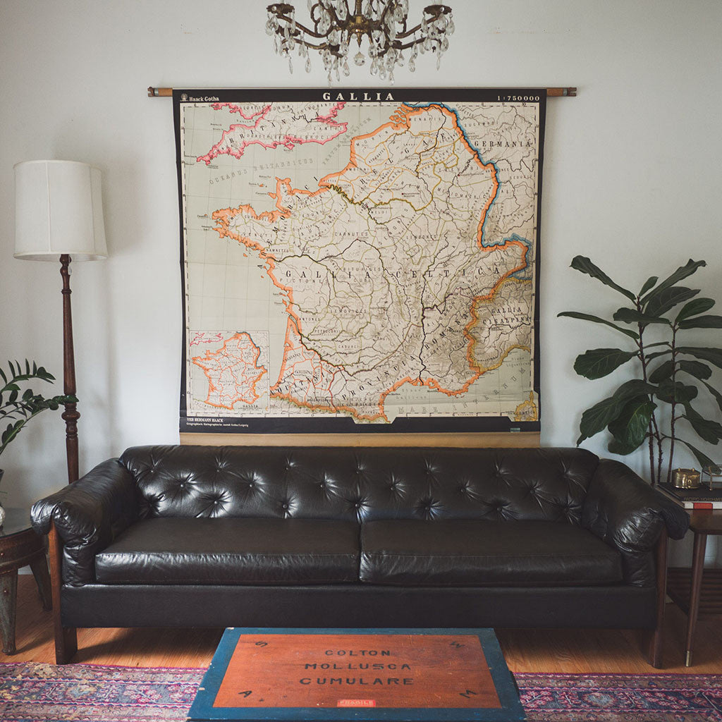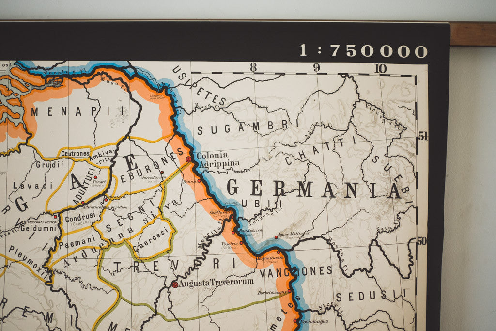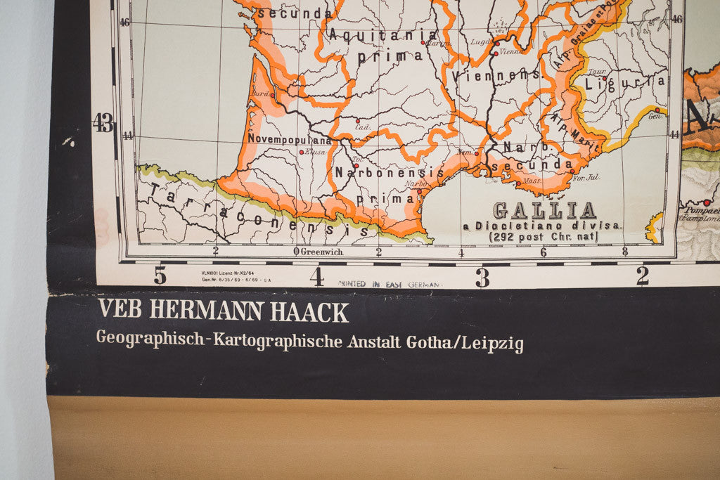 This large vintage East German pull-down map of ancient France has a black border with pink, orange and white accents. It's in good shape with age related distressing and wear. See pictures for detailed condition.