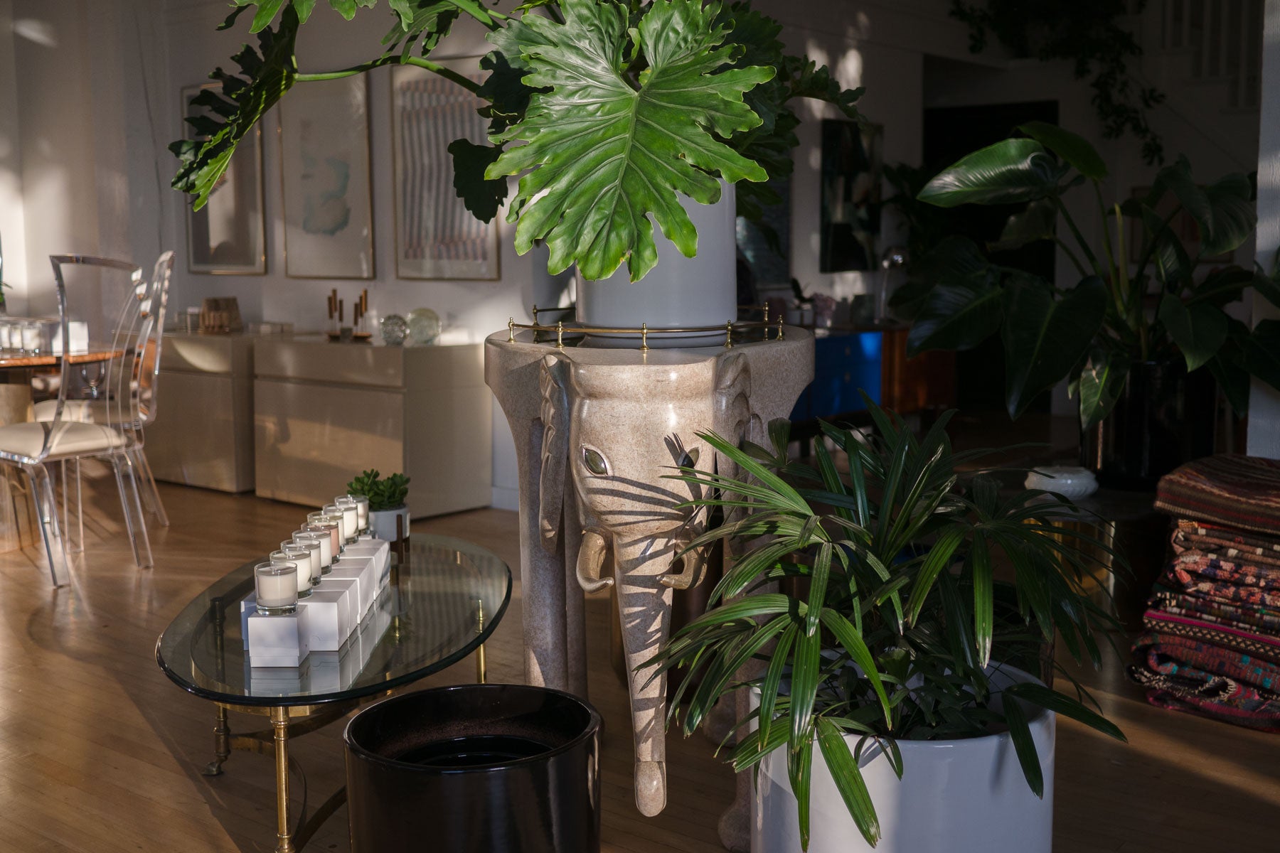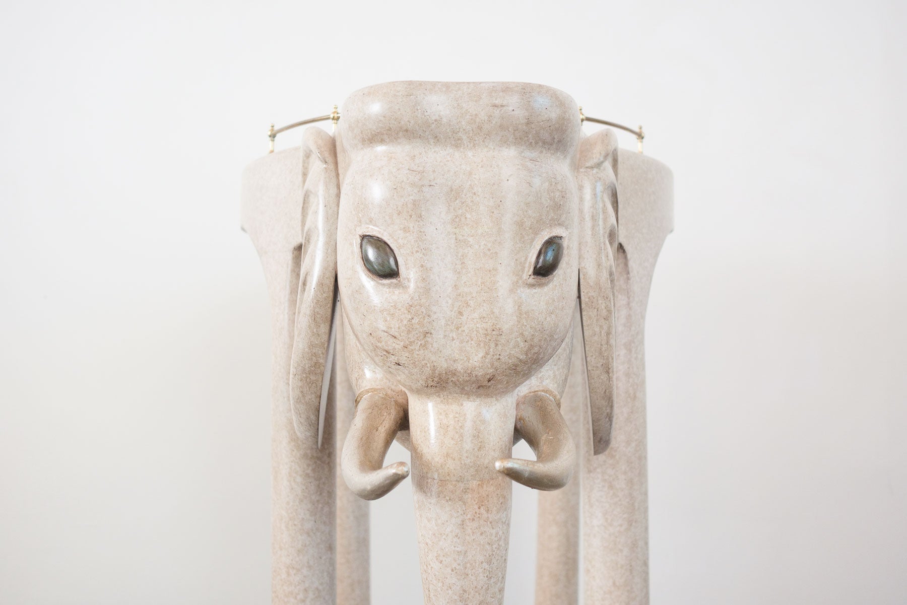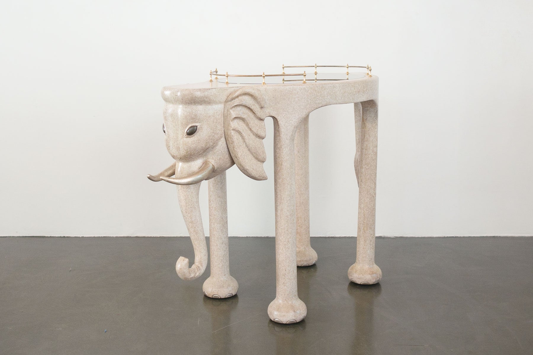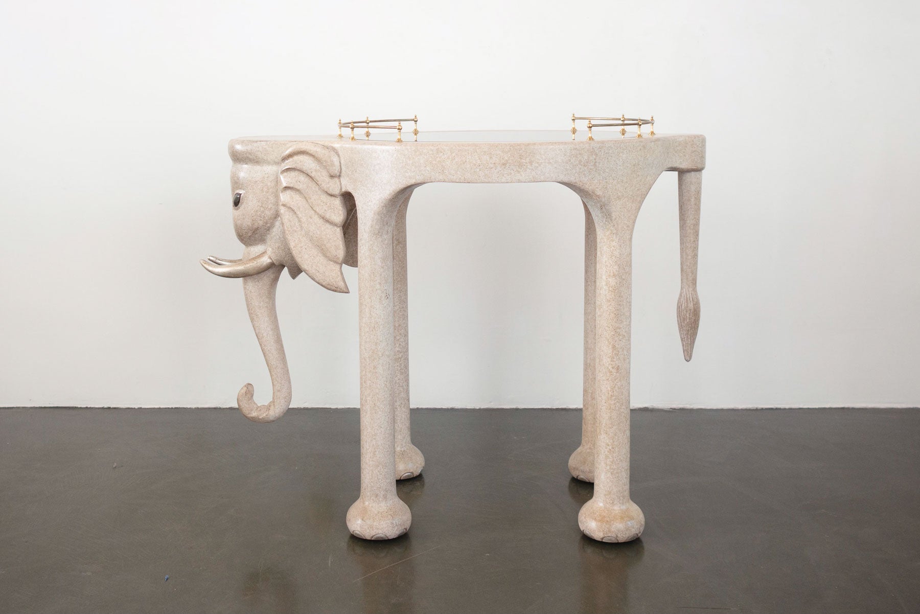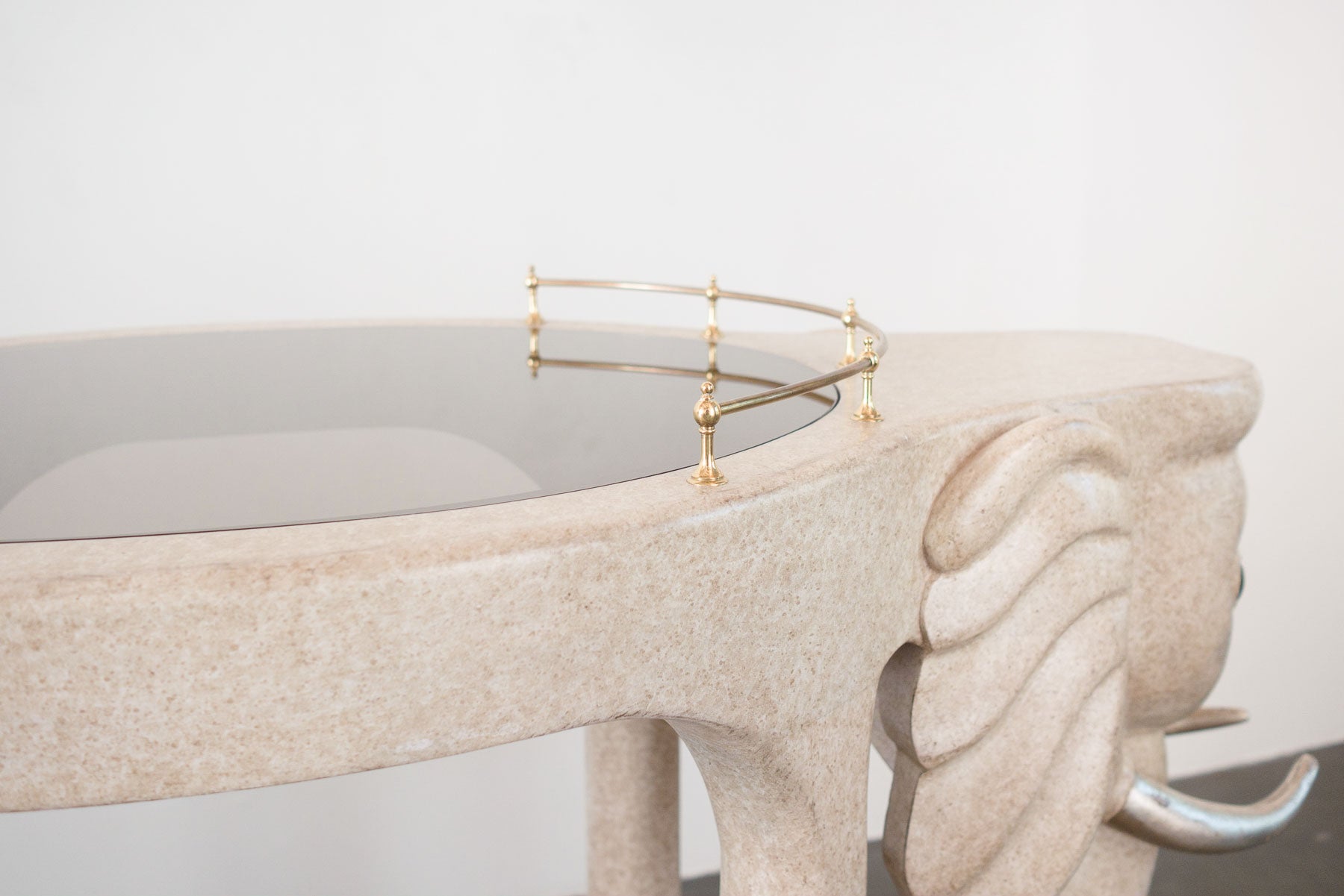 material: wood composite, brass, smoked glass