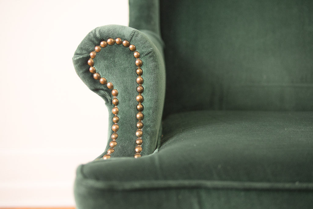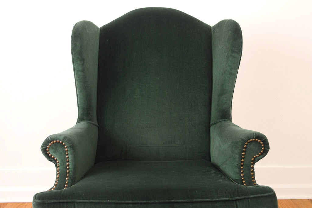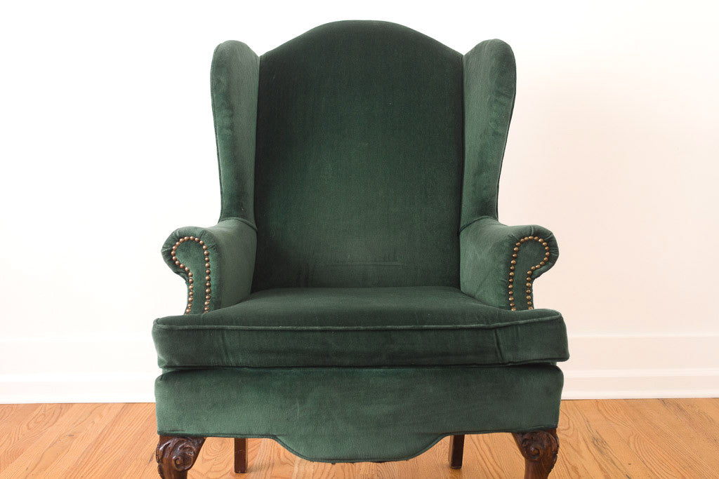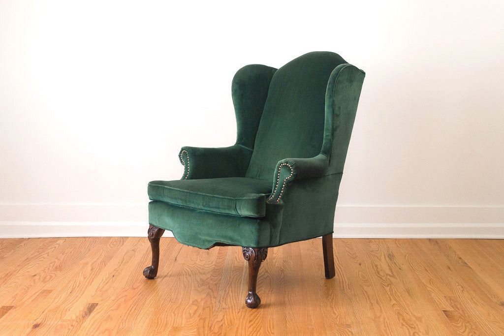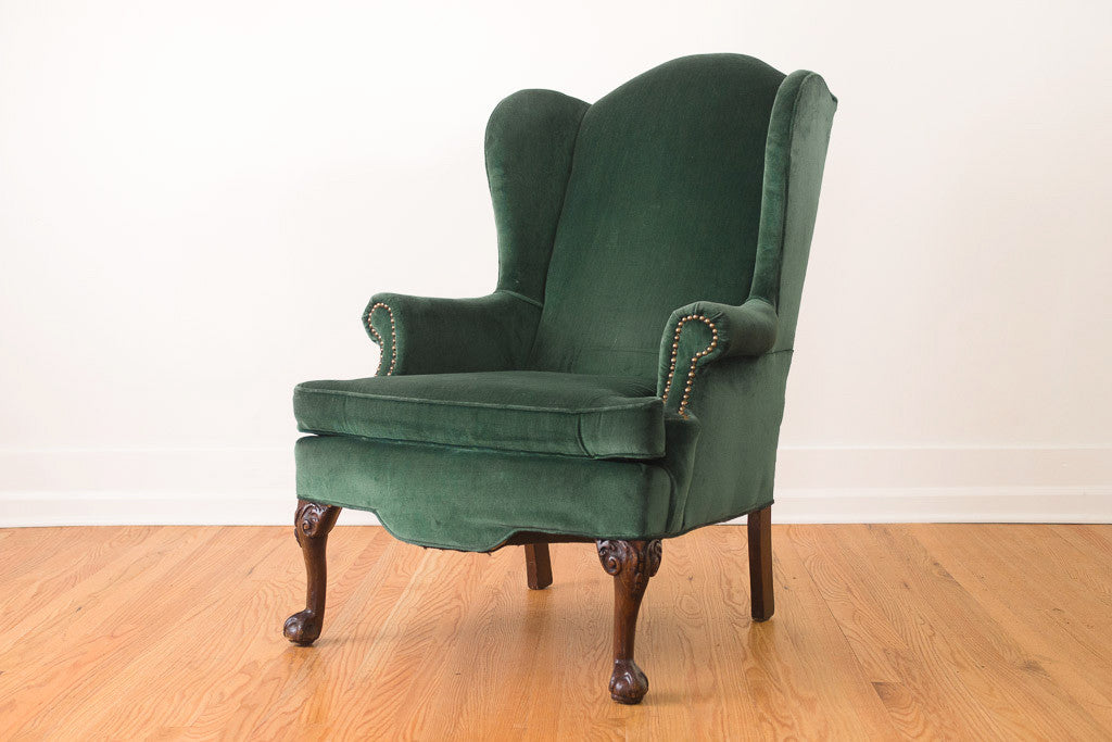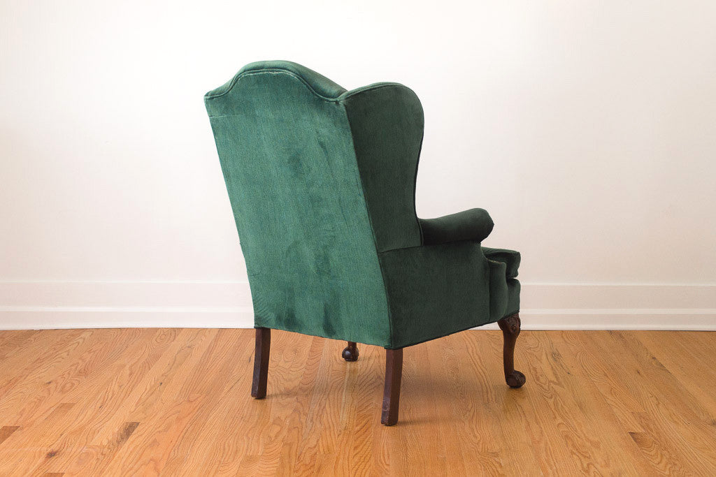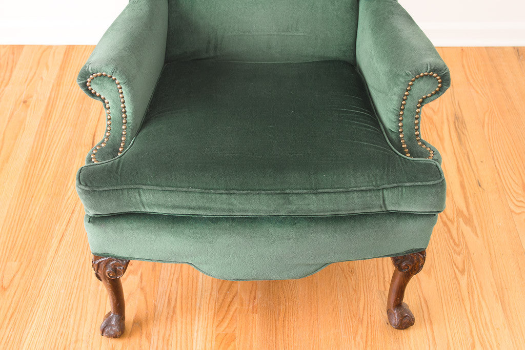 This vintage wingback chair is upholstered in emerald green velvet with dark carved wood claw foot legs and brass nailhead trim. The upholstery is in great shape with minor wear. The chair is sturdy when you are sitting in it but the frame has a little movement if you are fussing with it.