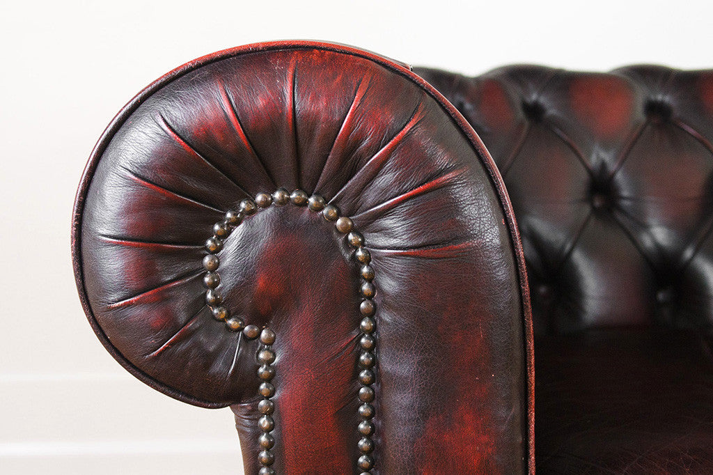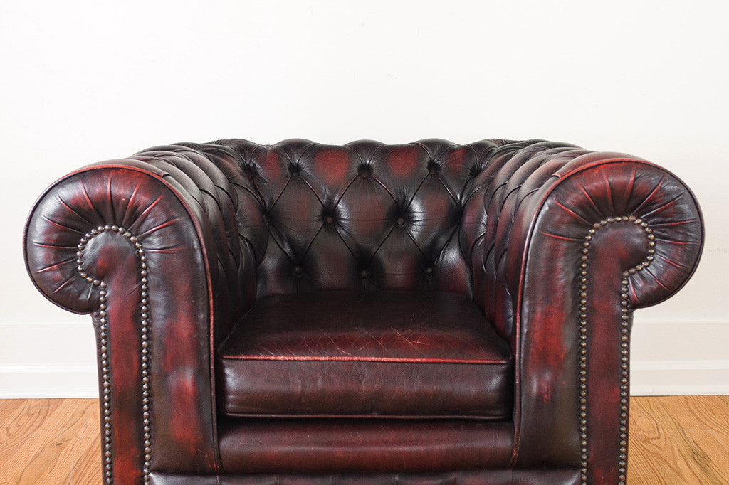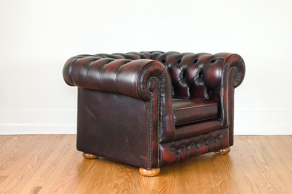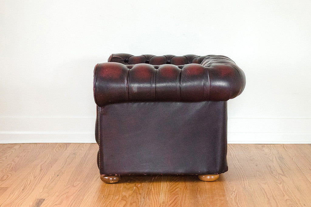 This cordovan leather Chesterfield chair was manufactured in England. It has a tufted bottom rail, brass nailhead trim, wood bun feet and an unattached seat cushion. It was fully conditioned and is in excellent shape. Please see pictures for detailed condition of this piece.