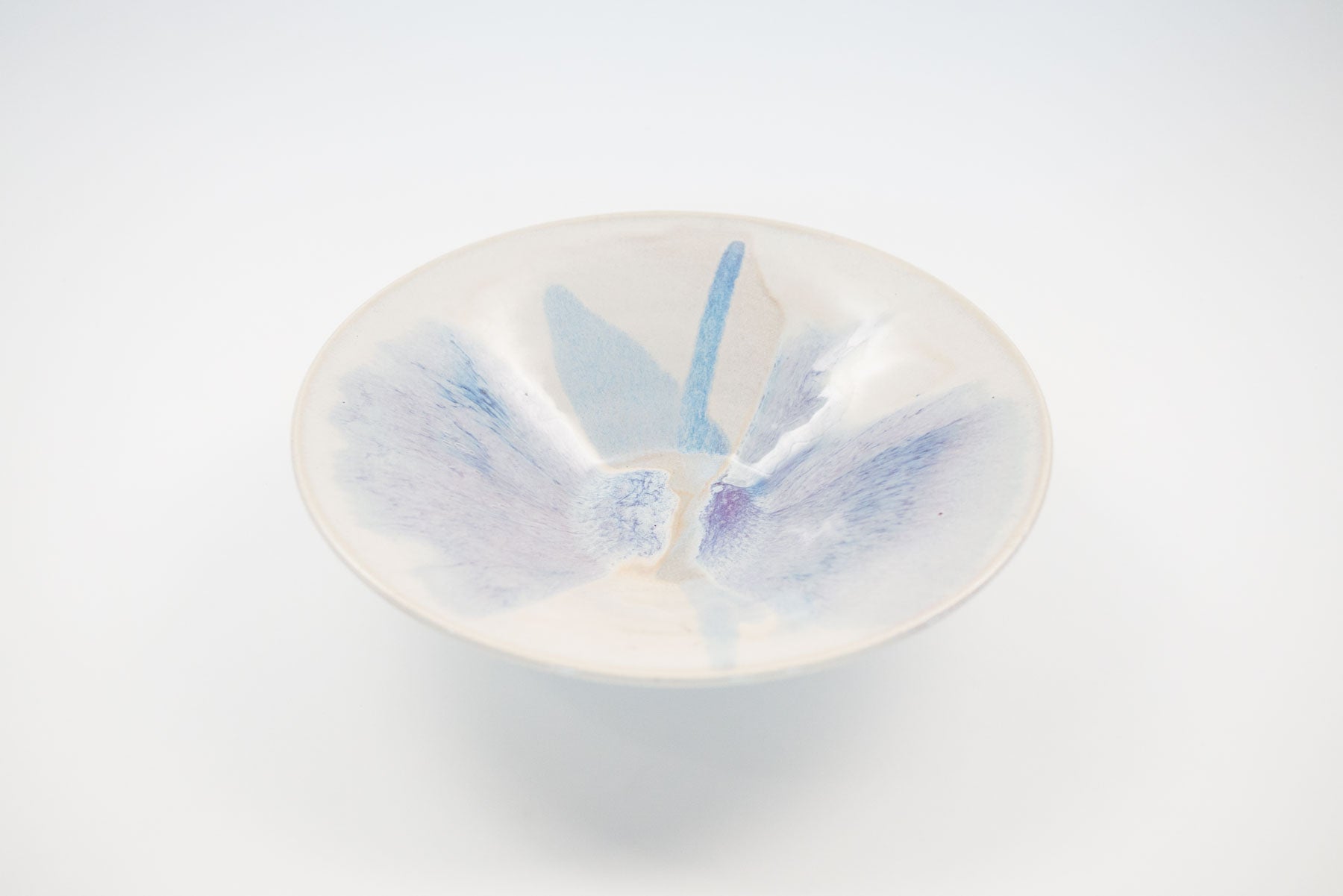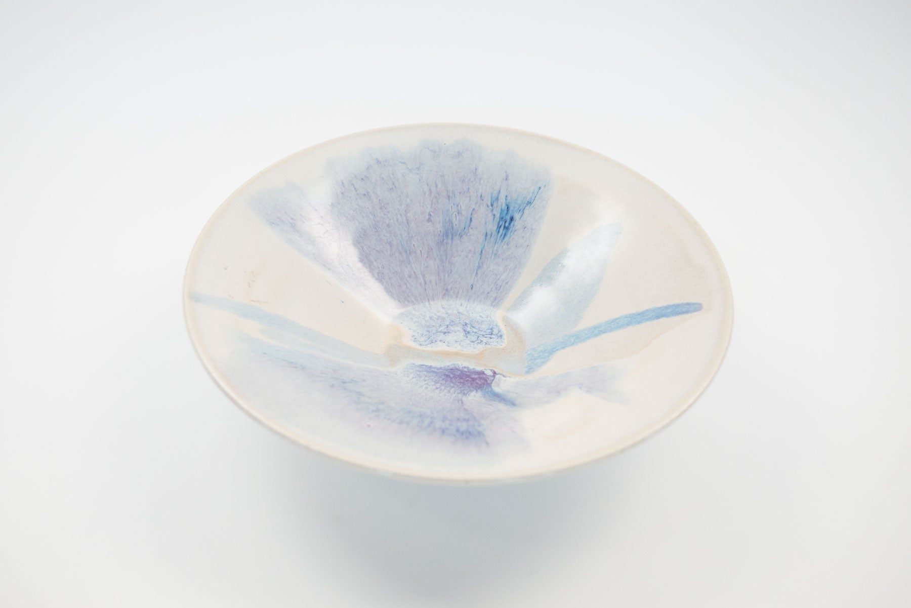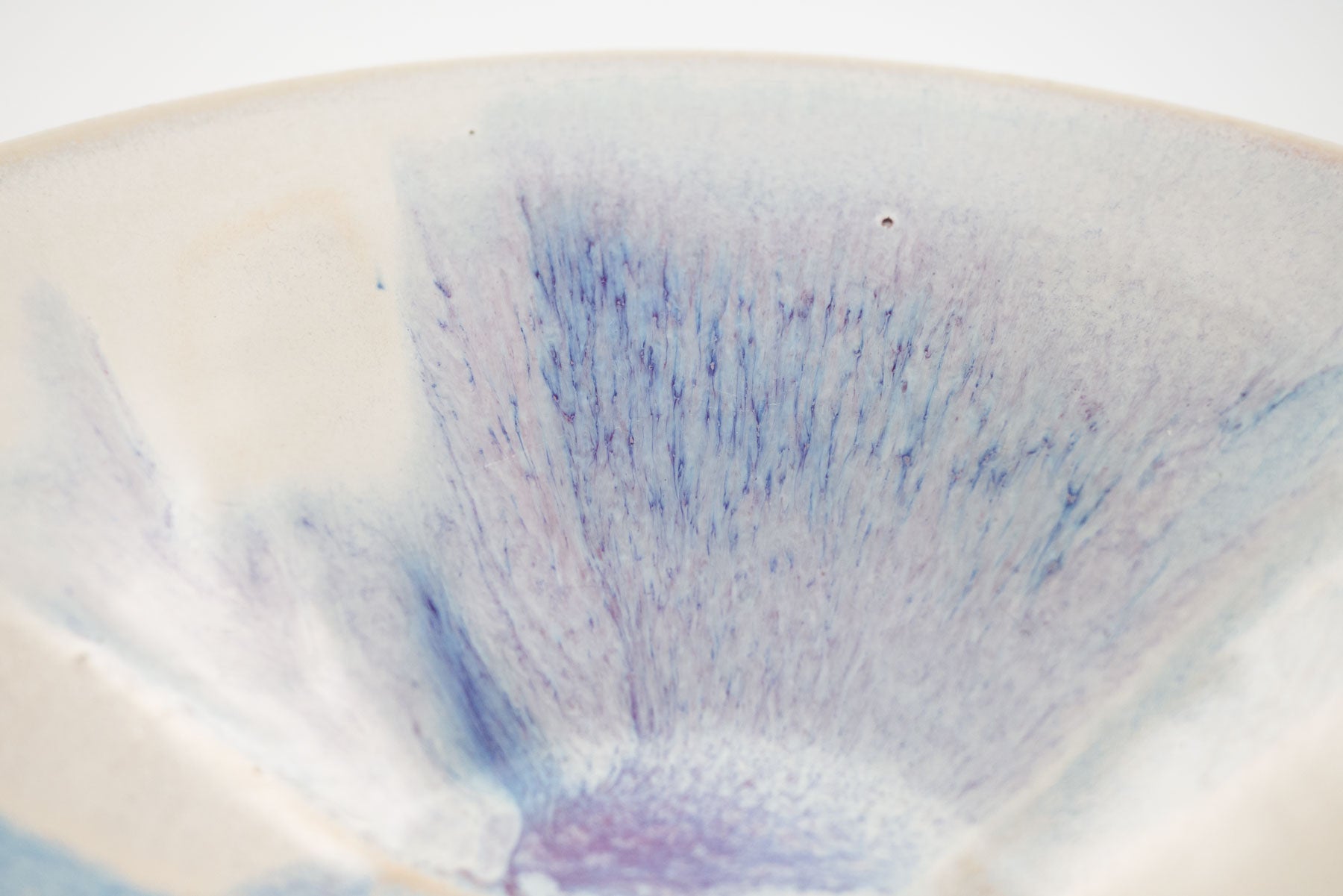 style: hand thrown, ceramic, studio pottery, serving, bowl material: clay, glaze - lavender, purple, cream, blues signed: ER age: vintage, Mid Century condition: good, age related wear - see pictures