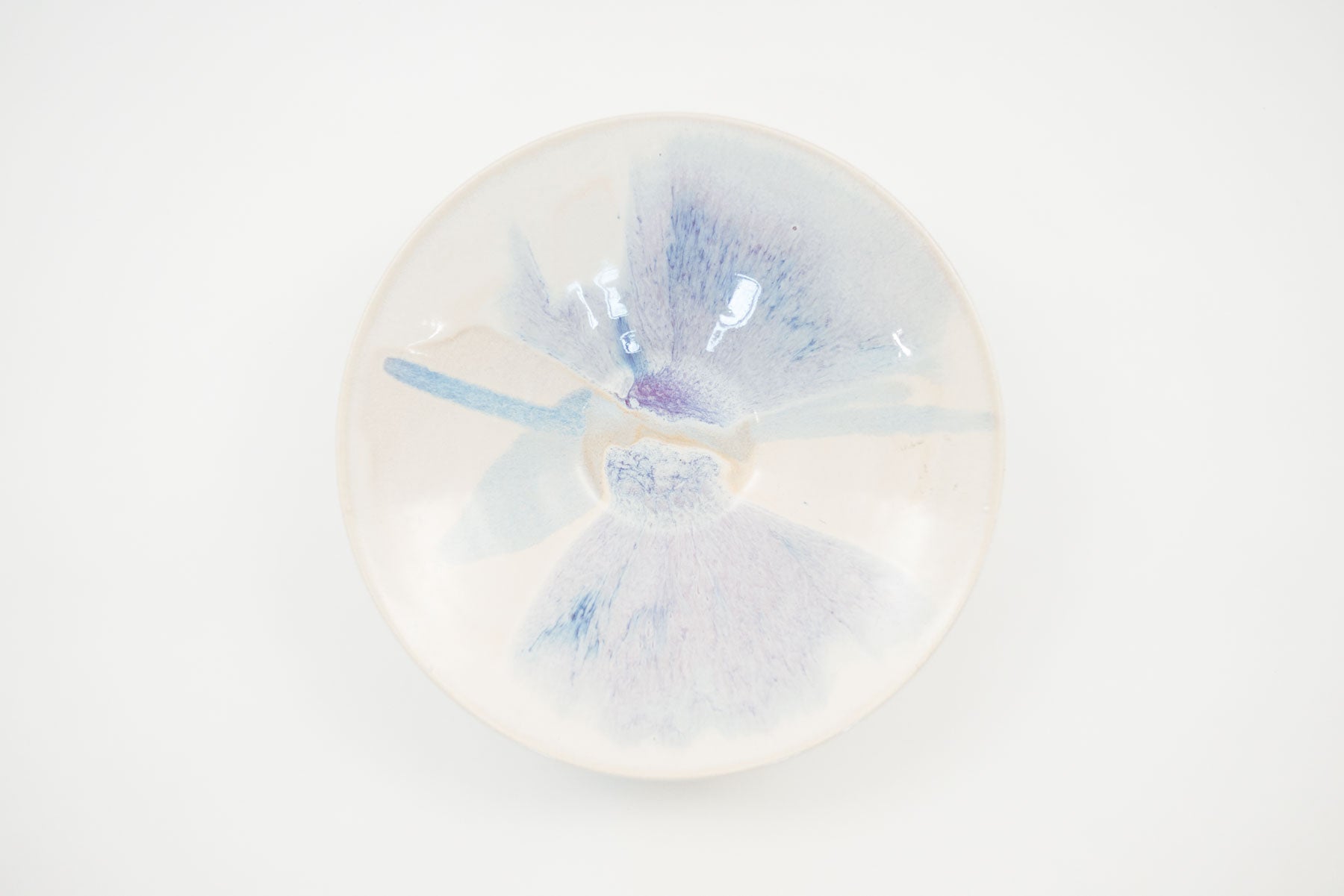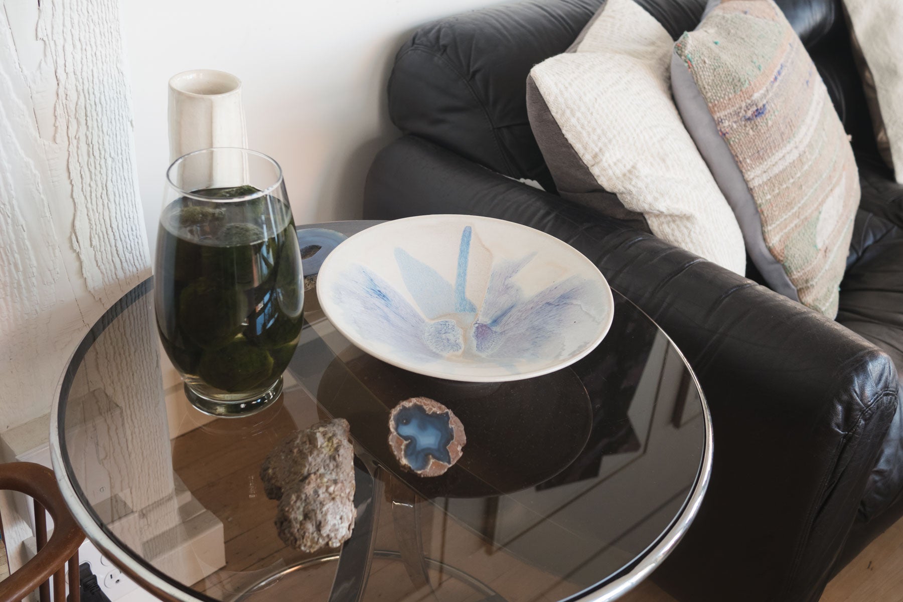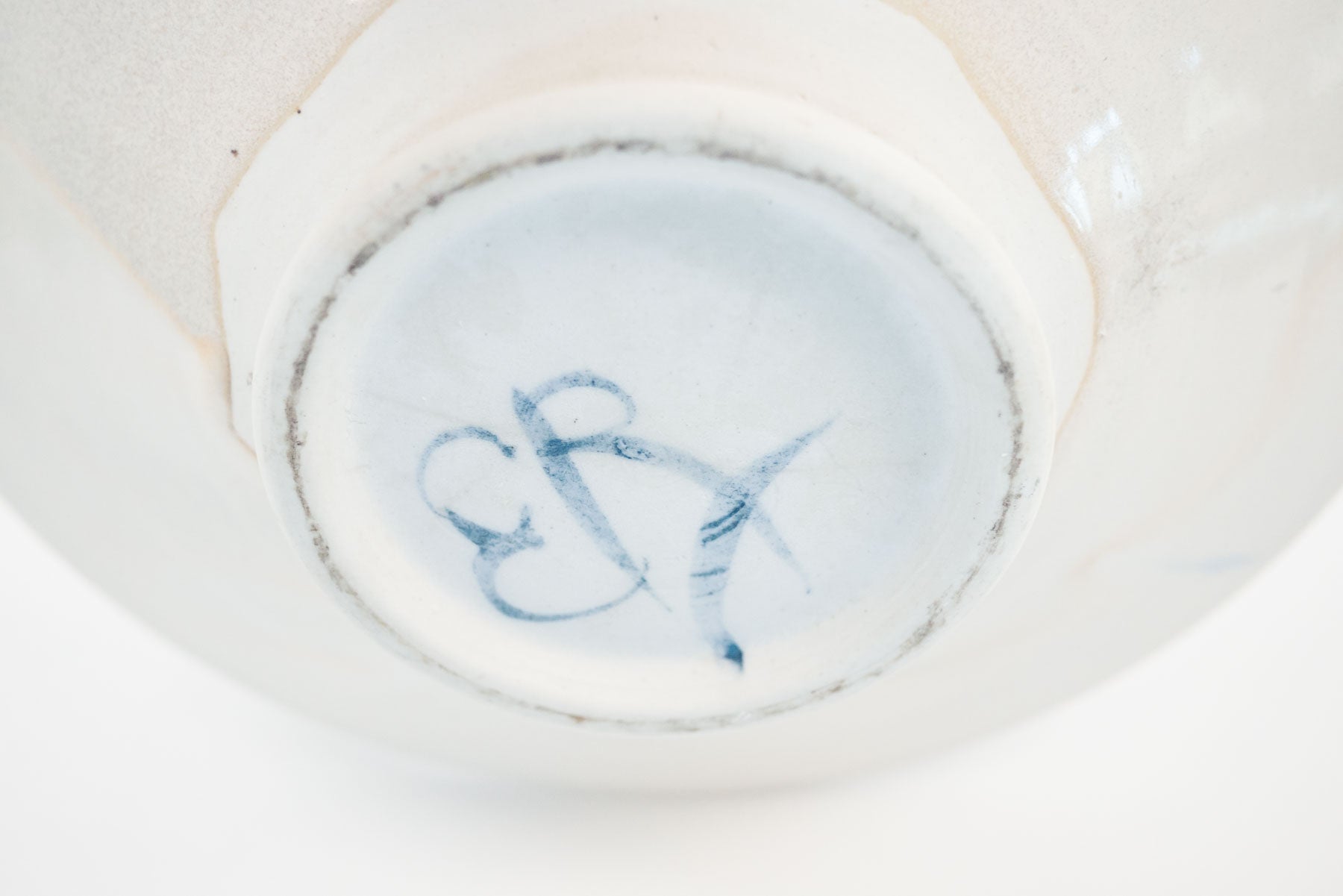 style: hand thrown, ceramic, studio pottery, serving, bowl material: clay, glaze - lavender, purple, cream, blues signed: ER age: vintage, Mid Century condition: good, age related wear - see pictures