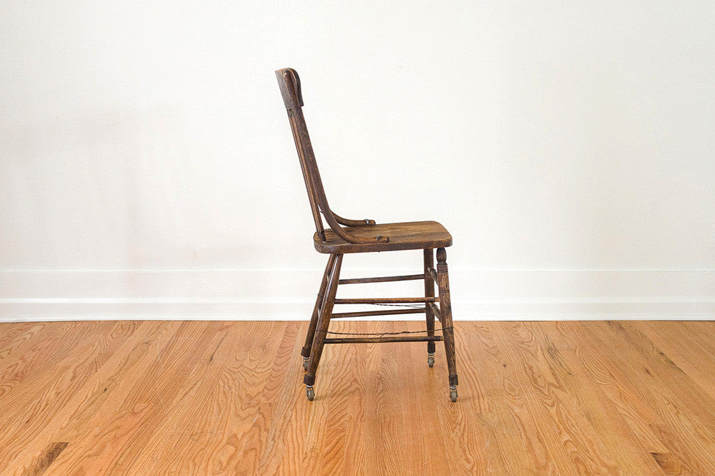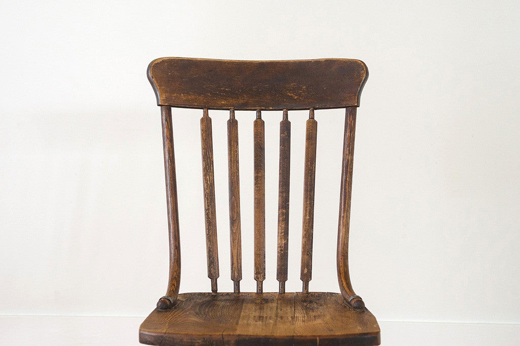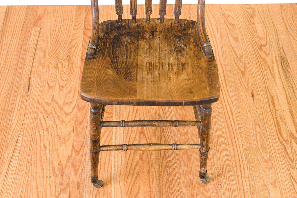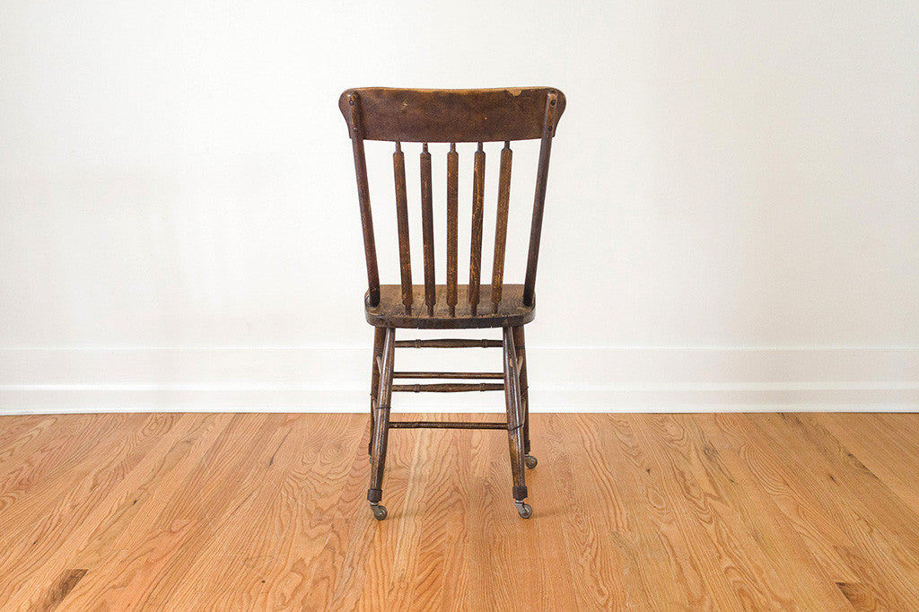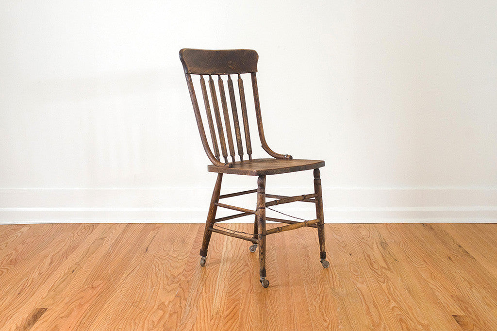 This vintage wood farm chair is oak with an aged patina and original metal casters. It would be perfect at a desk, as an accent chair or in a bathroom with a stack of folded towels on the seat. Please see pictures for detailed condition of this piece.