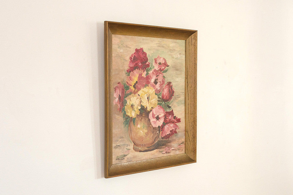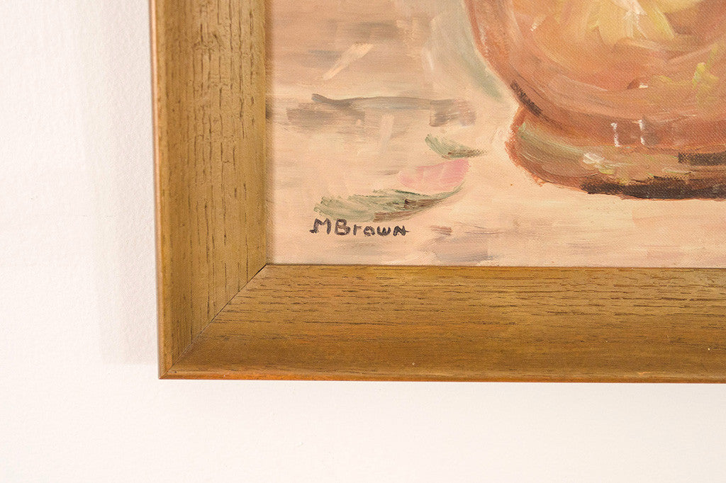 This framed vintage painting is signed, "M Brown". It features a bright floral still life in shades of pinks, greens and yellows. It's in great overall shape with some light wear to the frame. Please see pictures for detailed condition of this piece.
