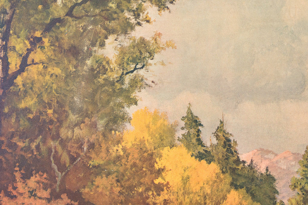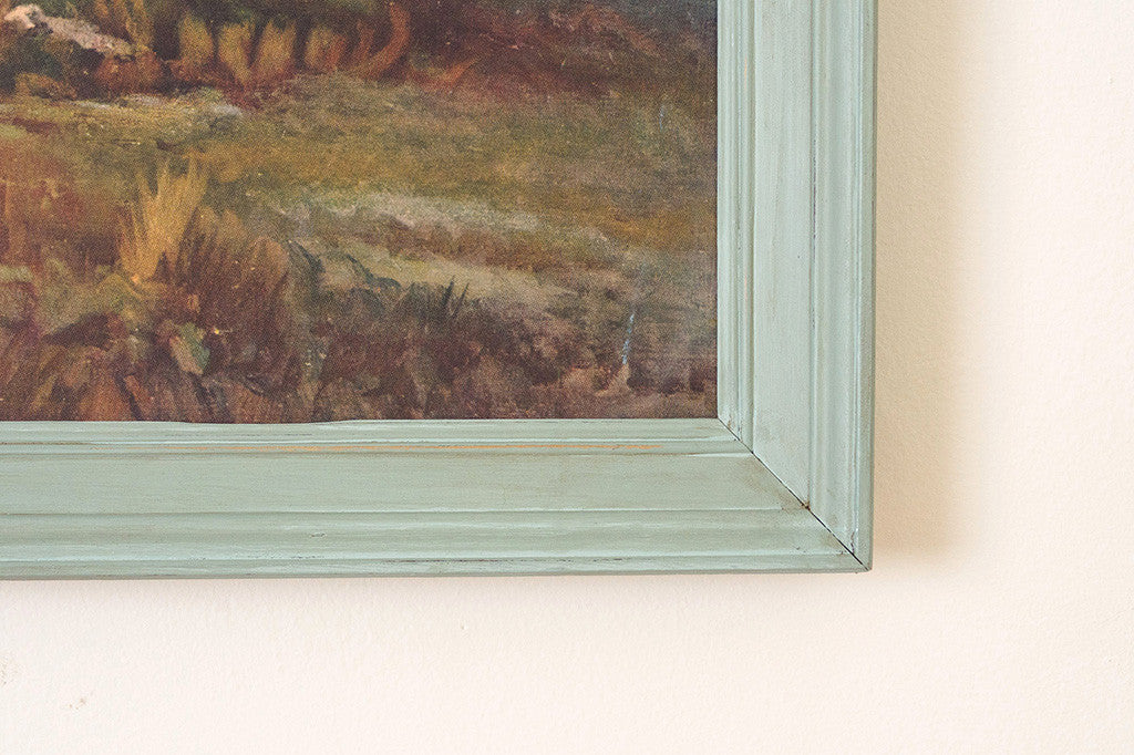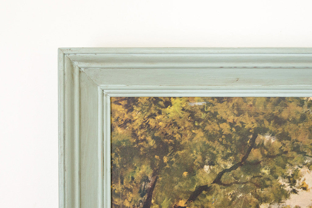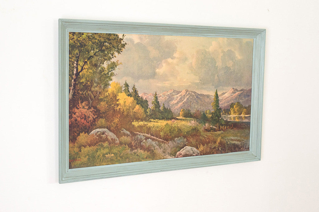 This large framed vintage print has a light blue wood frame. It features an outdoor landscape with a variety of trees, mountains and a cloudy sky. It's in great overall shape and is ready to hang. Please see pictures for detailed condition of this piece.
