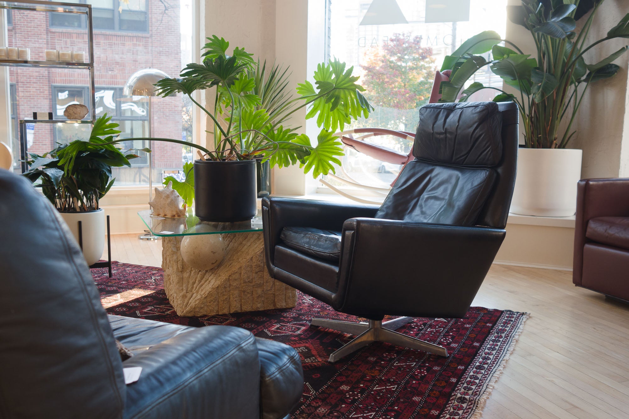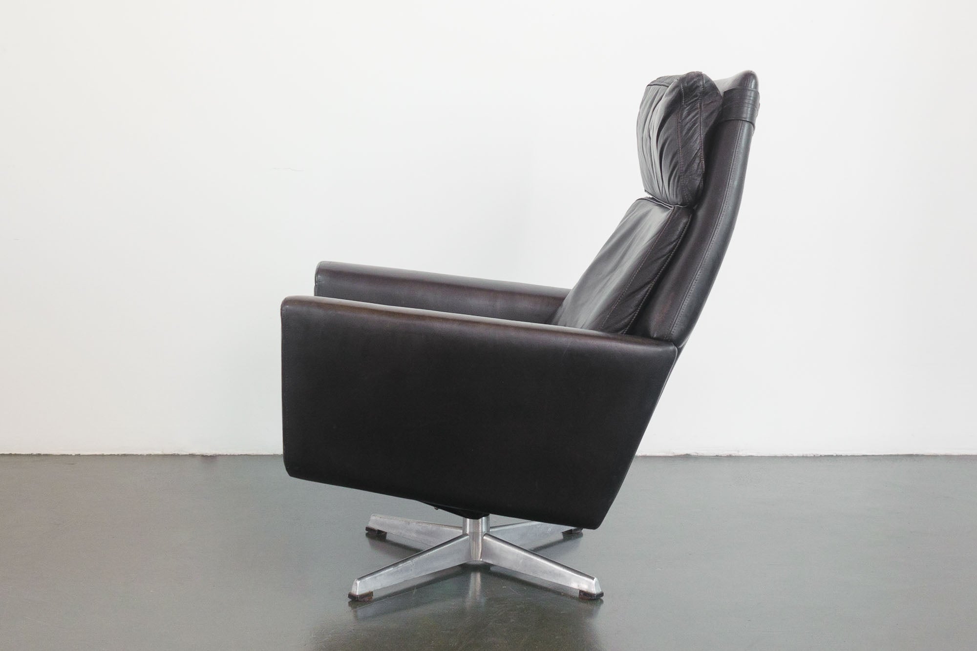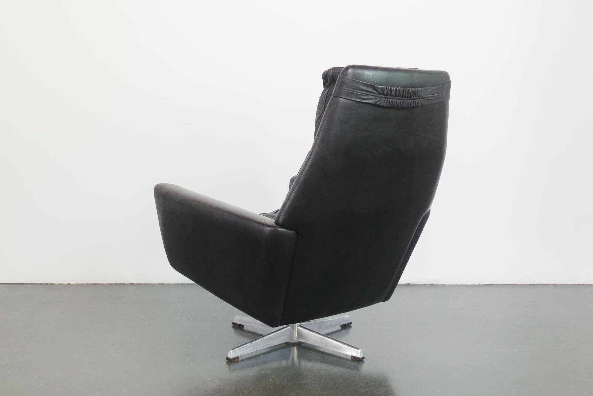 style: modern, swivel, rocker, arm chair material: wood and metal frame, foam and feather, black leather upholstery origin: Denmark age: vintage, 1970s condition: good, age related wear - see pictures sku: hs-441