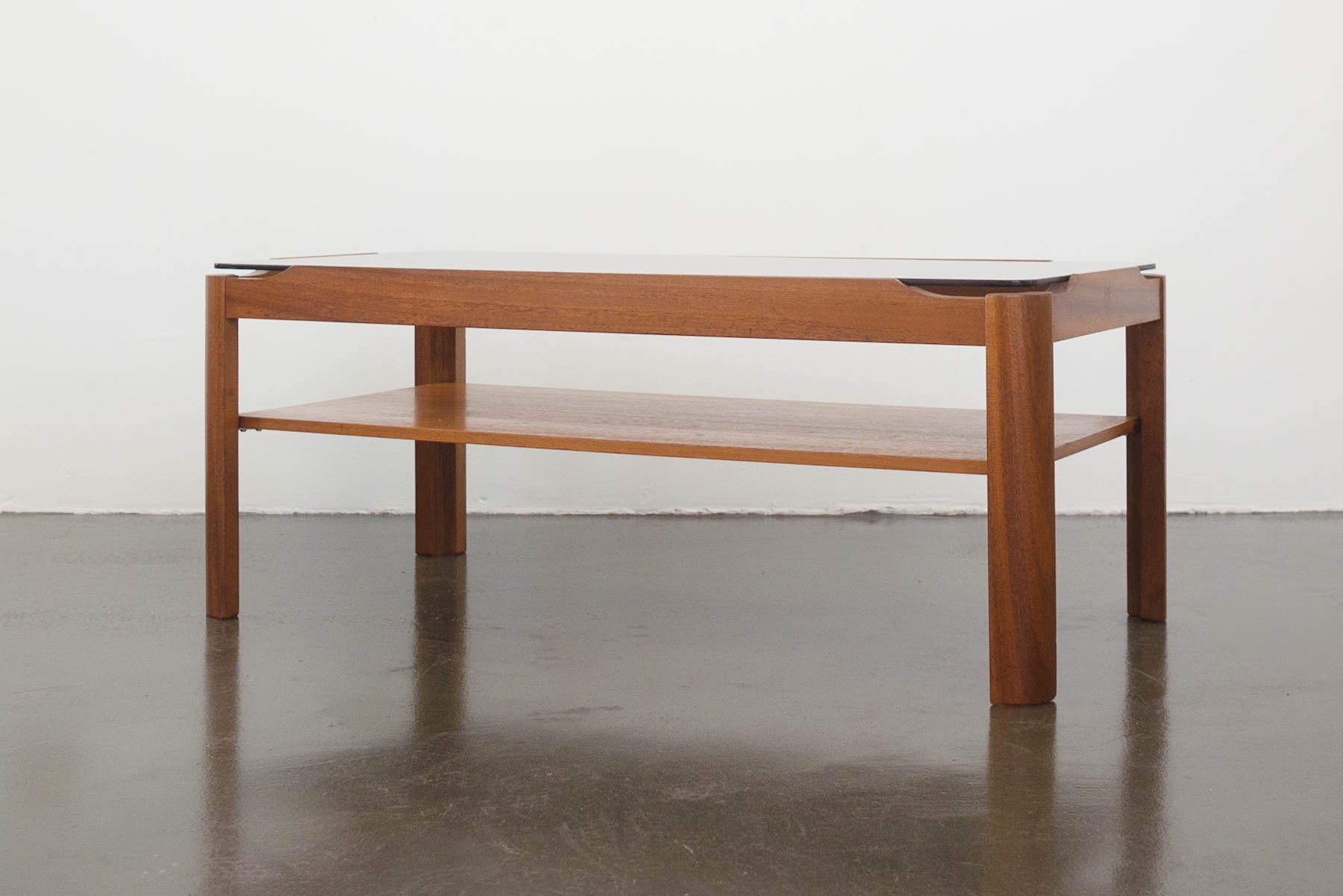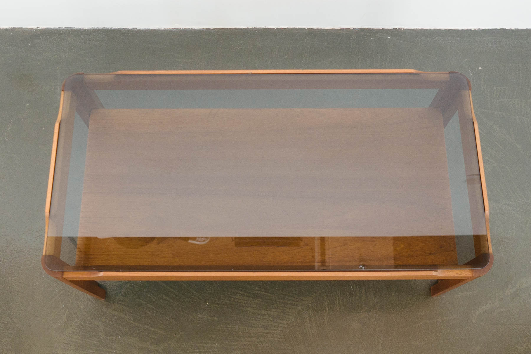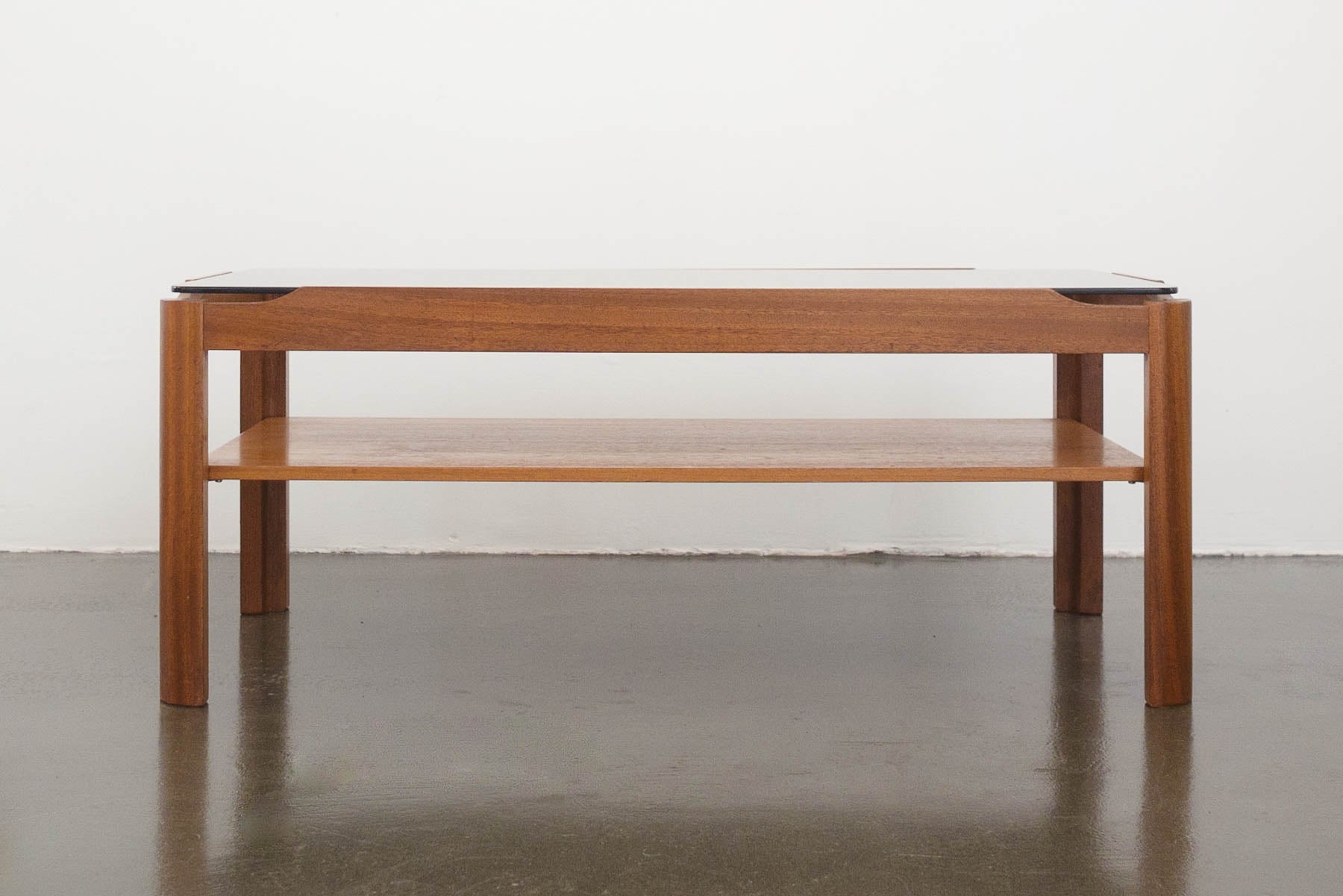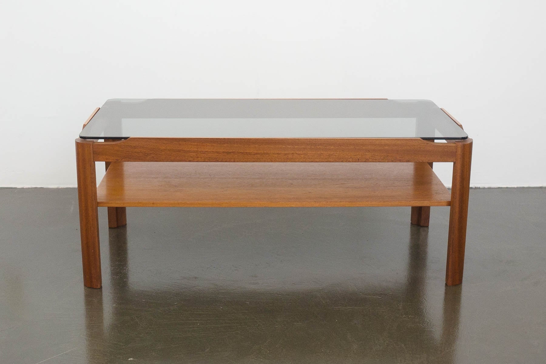 style: modern, petite, coffee table, lower shelf material: wood (teak), smoked glass origin: UK, Made in England age: vintage, Mid Century condition: good, age related wear - see pictures