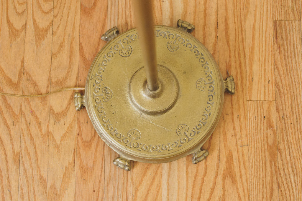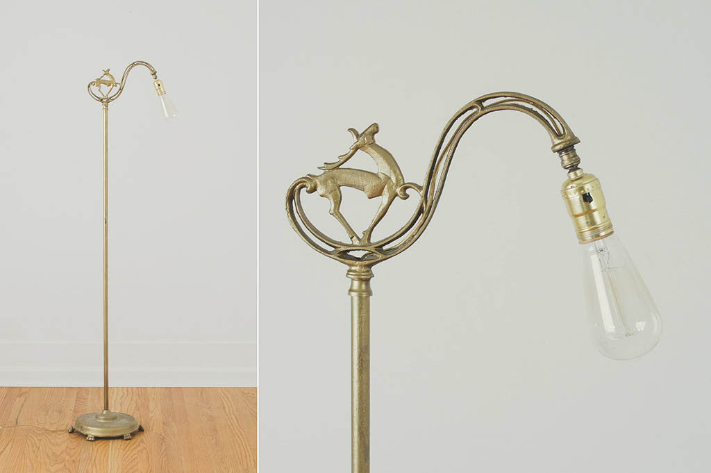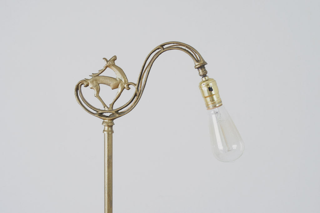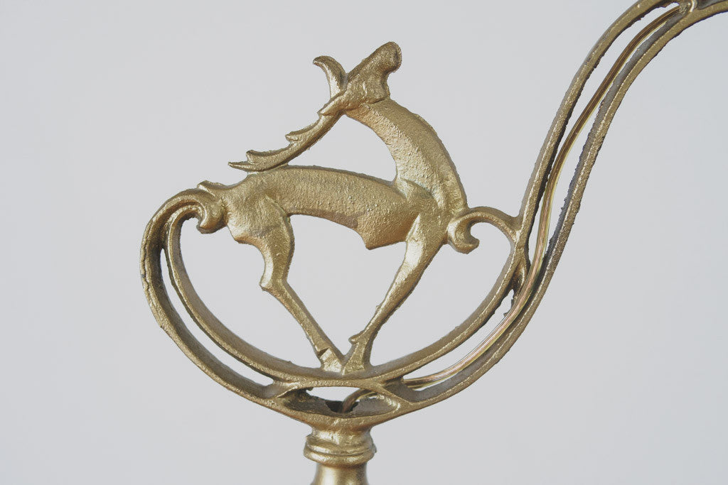 This cast iron Art Deco era floor lamp has distressed gold paint with a deer design and an adjustable head. It was rewired and is in good working condition with age related wear. Please see pictures for detailed condition.