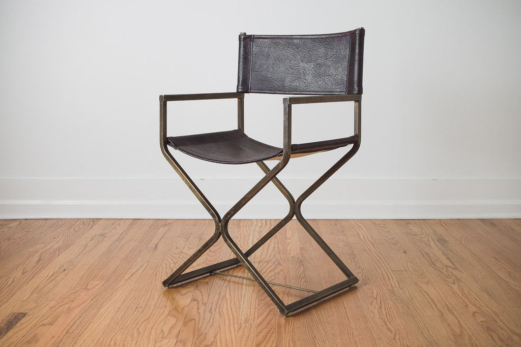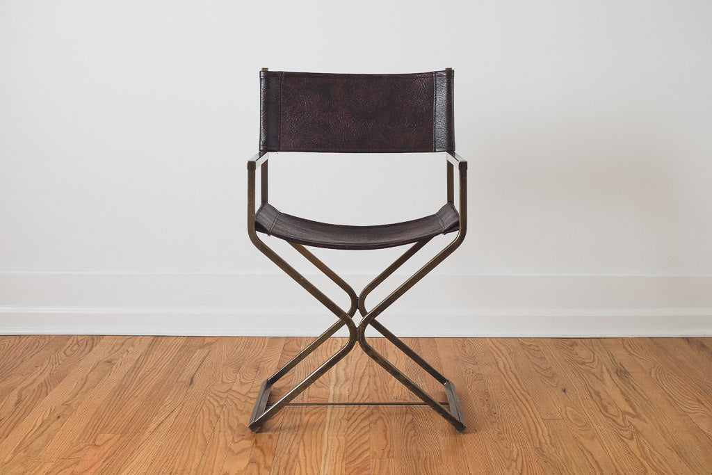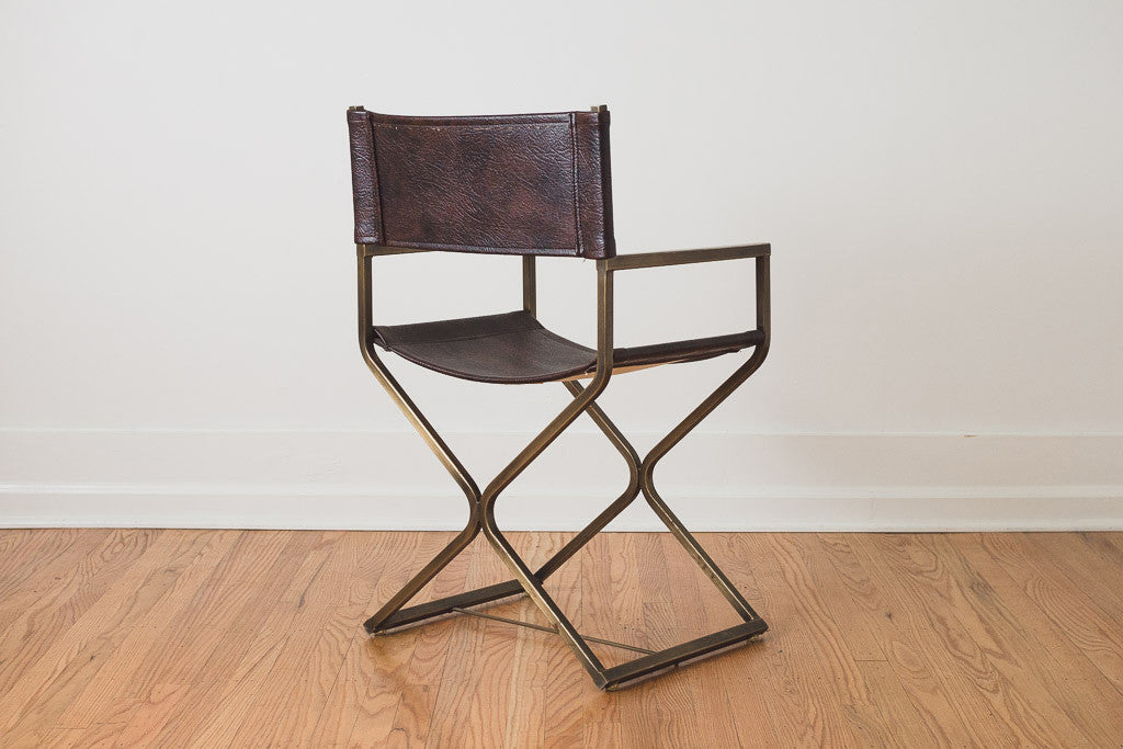 This vintage director's chair has a gold metal frame and brown naugahyde upholstery. It's comfortable, sturdy and in good shape with age relater wear. See pictures for detailed condition.