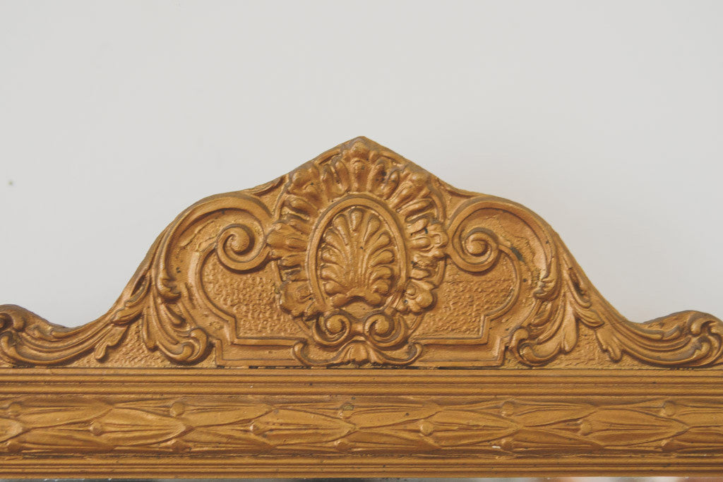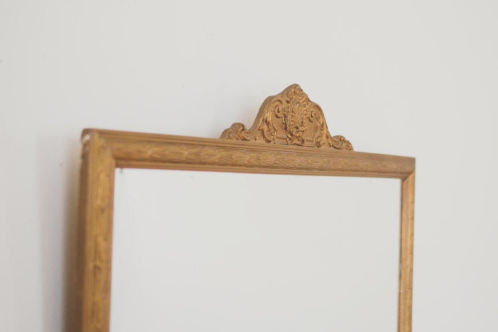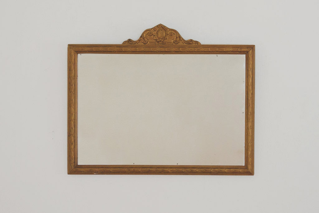 This vintage gold mirror has a carved wood frame. The mirror itself is in good shape and would be a nice addition over a bathroom vanity or in an entryway. Please see pictures for detailed condition.