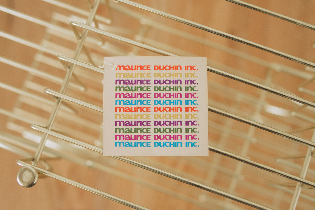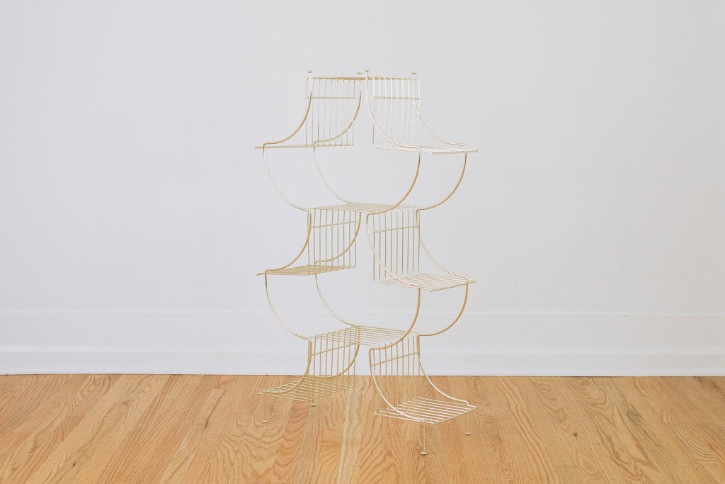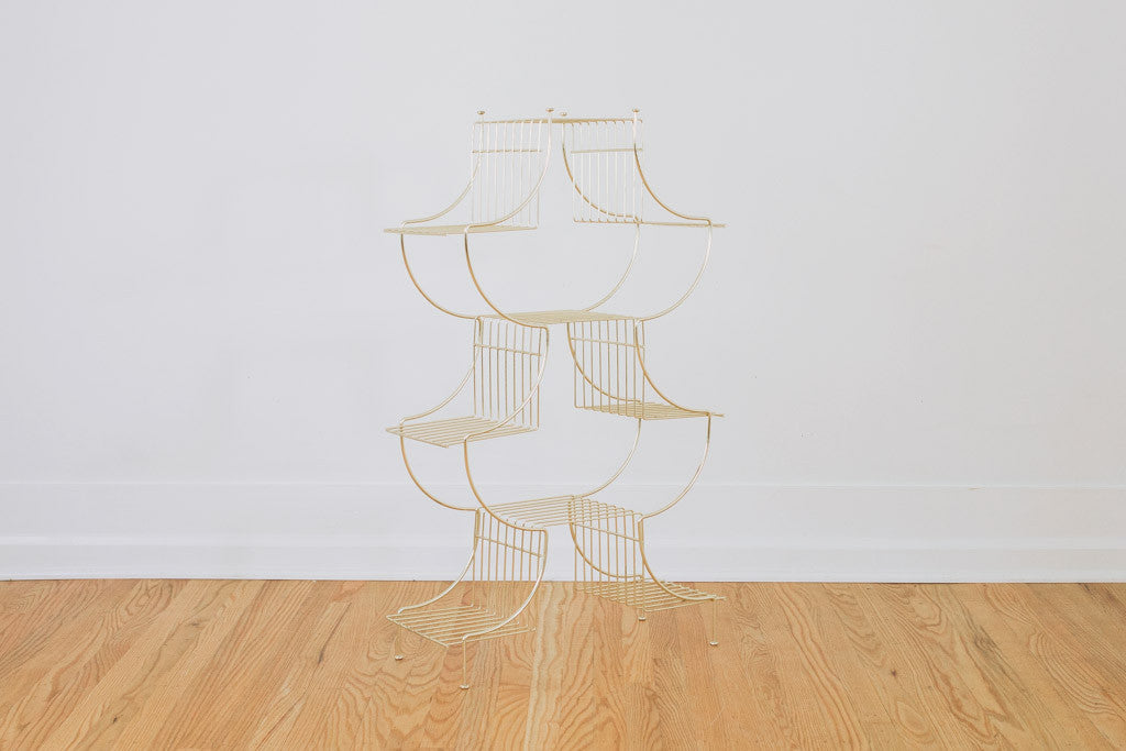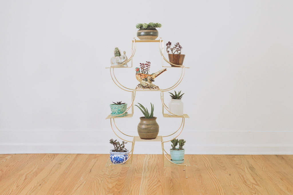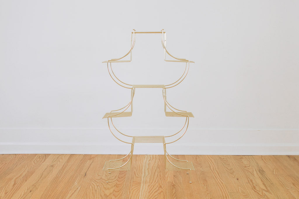 This vintage plant stand has a gold frame with nine shelves. It comes with the original Maurice Duchin Inc manufacture's tag. It's in great shape with age related wear. See pictures for detailed condition.