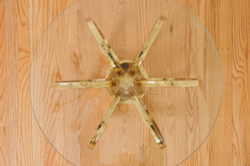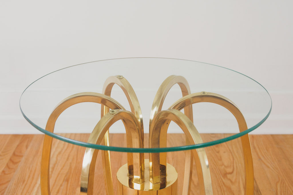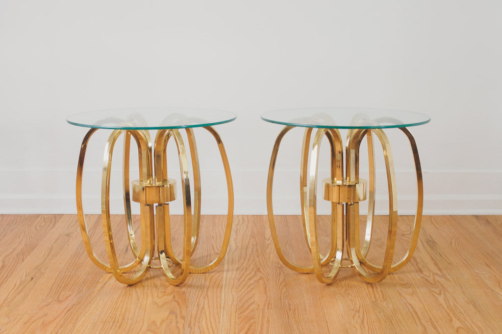 This pair of vintage Mid Century side tables have brass frames and 3/8" thick glass tops. They're in good shape with light age related wear. See pictures for detailed condition.