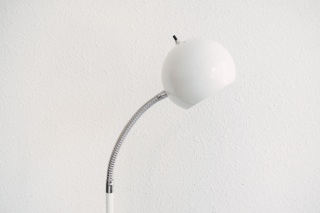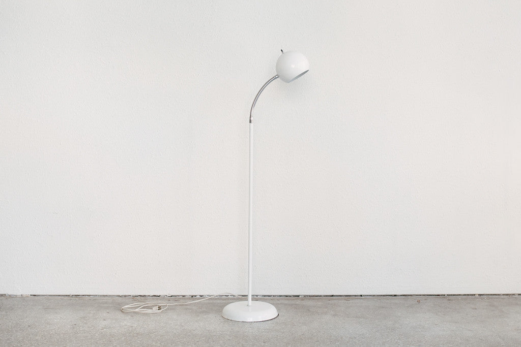 style: Mid Century, circular base, gooseneck, eyeball, floor lamp