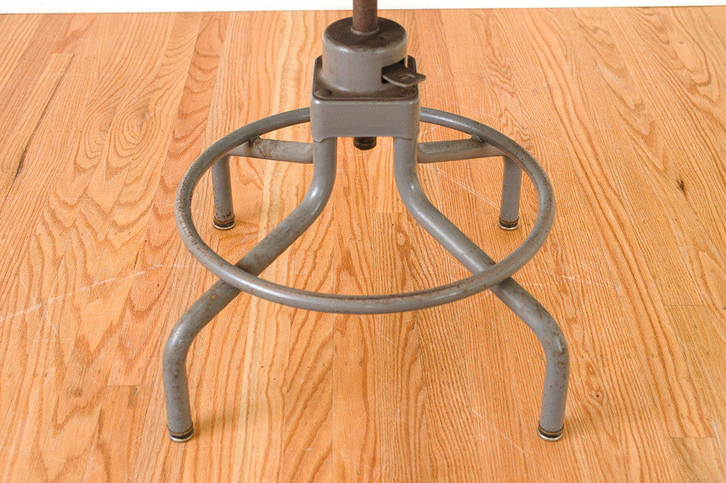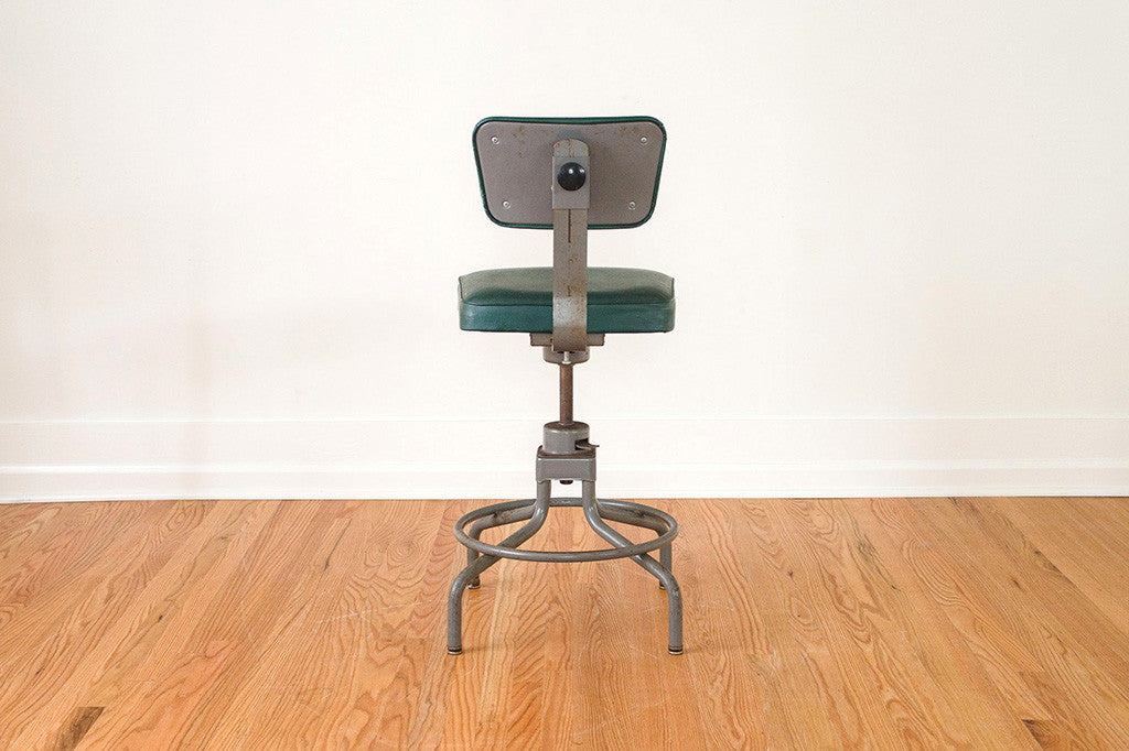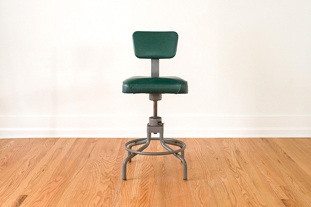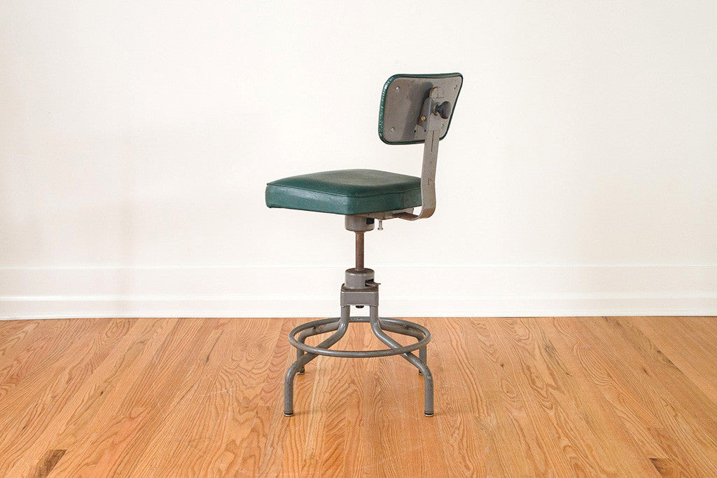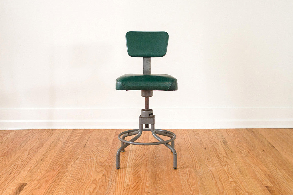 This vintage industrial shop stool would be perfect with a drafting table or at a kitchen island. It has it's original emerald green Naugahyde upholstery with a grey metal base and comfortable foot rest. This stool is adjustable in overall height and the backrest can be adjusted in depth and height. Please see pictures for detailed condition of this piece.