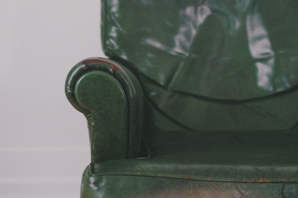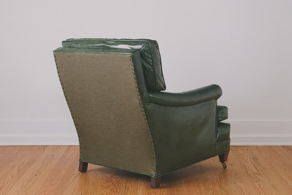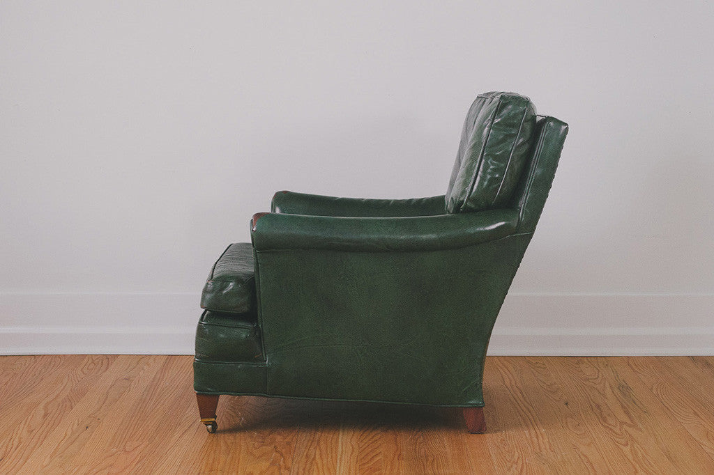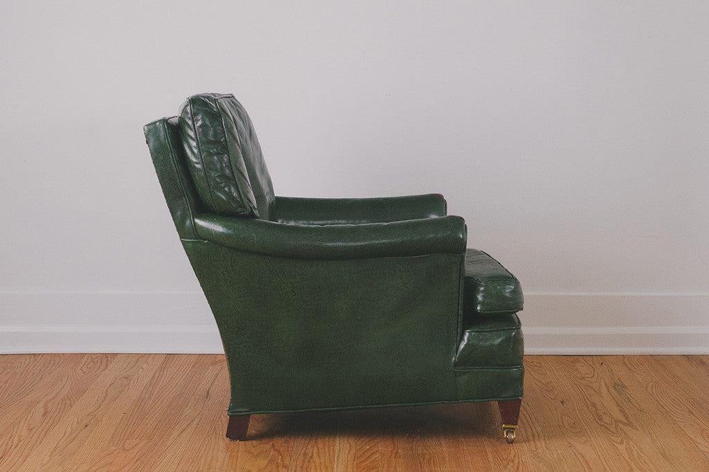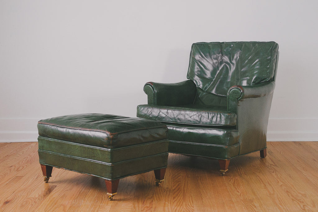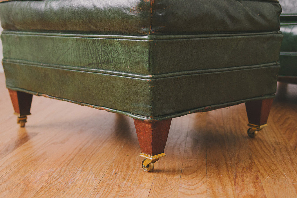 This vintage club chair and ottoman set is upholstered in distressed green leather with a matching green fabric back. It has dark wood legs with brass casters and is in good naturally distressed condition. Please see pictures for detailed condition.