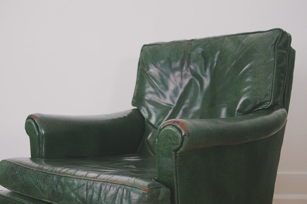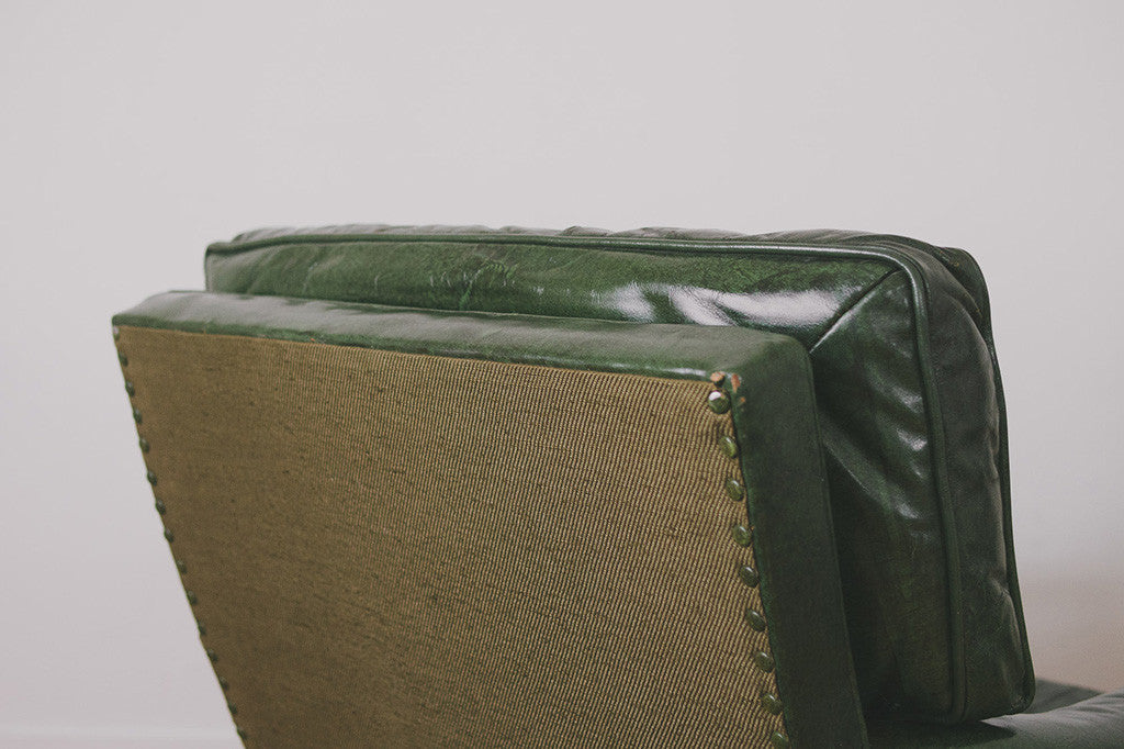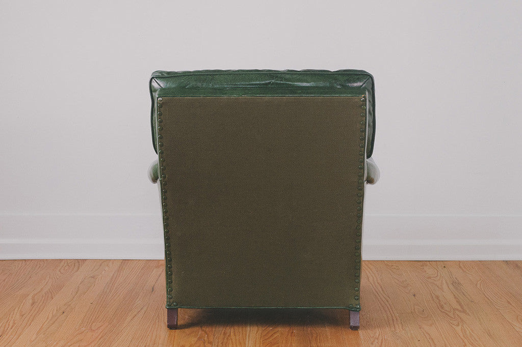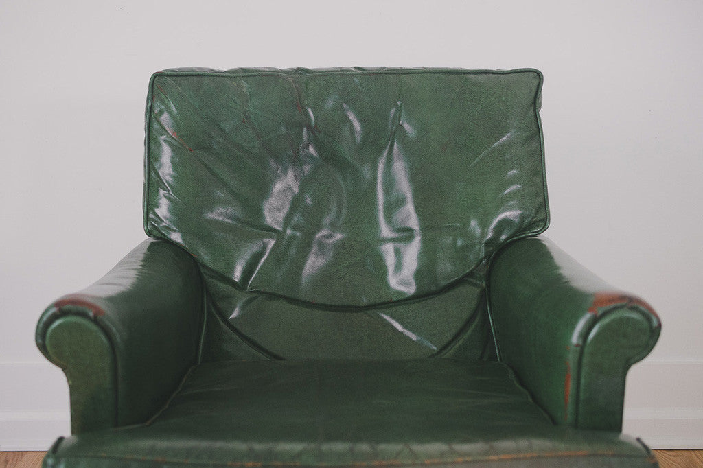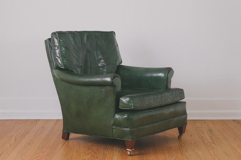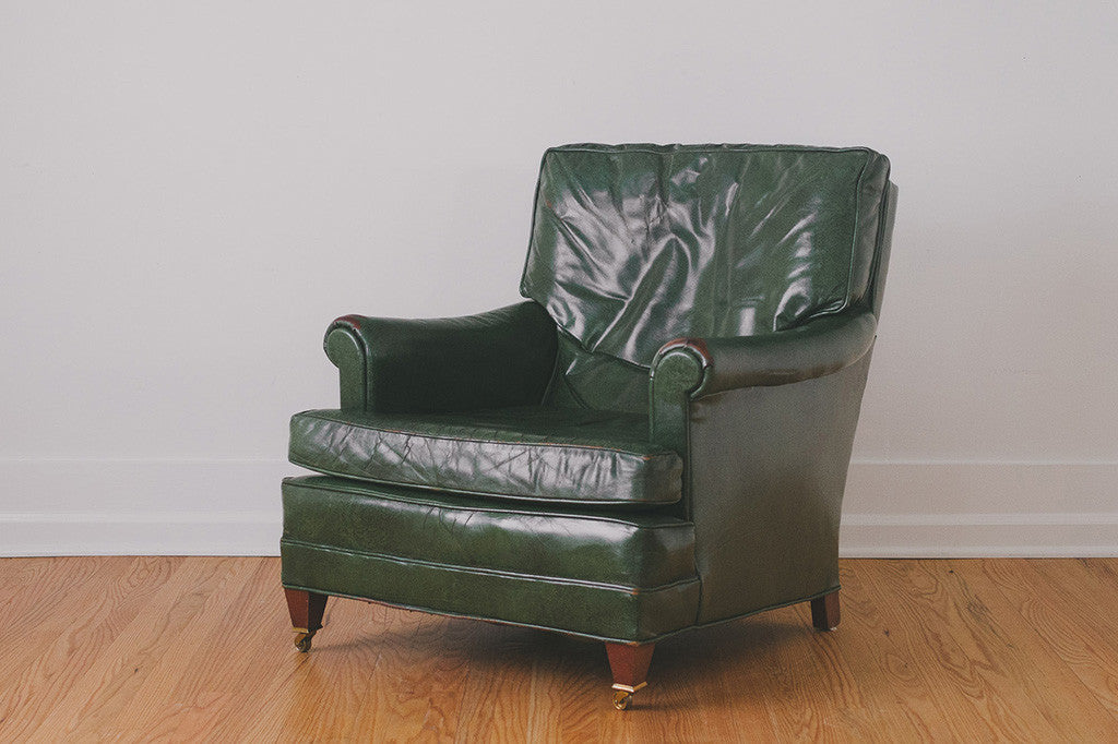 This vintage club chair and ottoman set is upholstered in distressed green leather with a matching green fabric back. It has dark wood legs with brass casters and is in good naturally distressed condition. Please see pictures for detailed condition.
