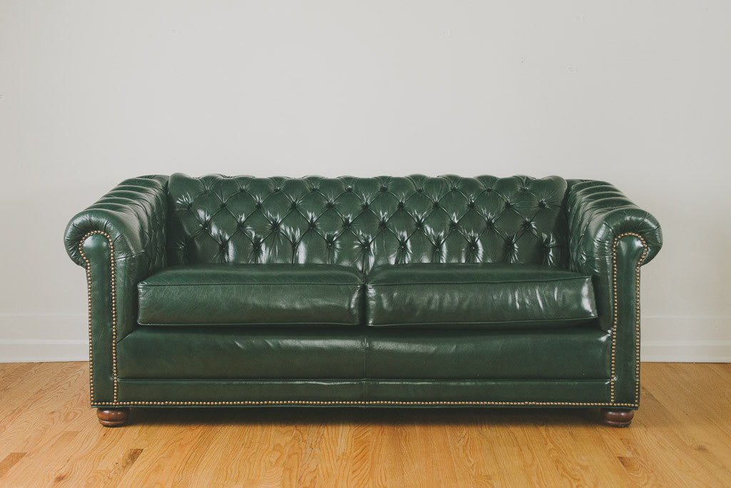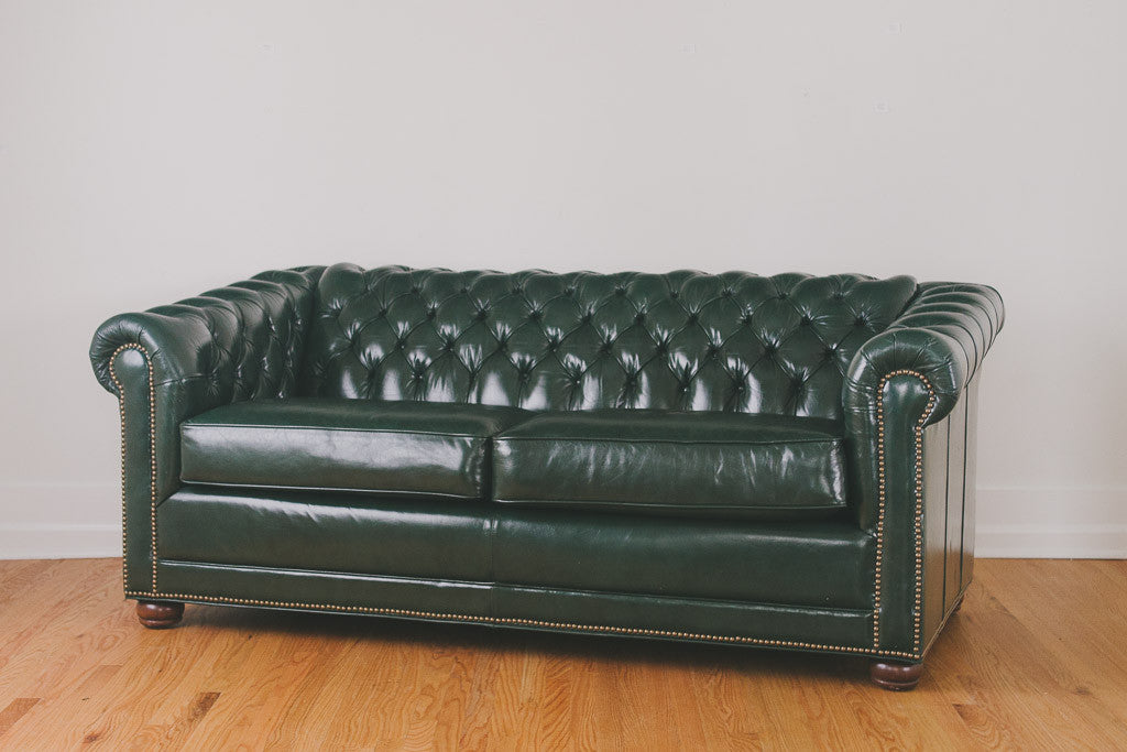 This green leather Chesterfield sofa has a tufted bottom rail, nailhead trim, wood bun feet and two loose seat cushions. It was fully conditioned and is in excellent shape. Please see pictures for detailed condition.