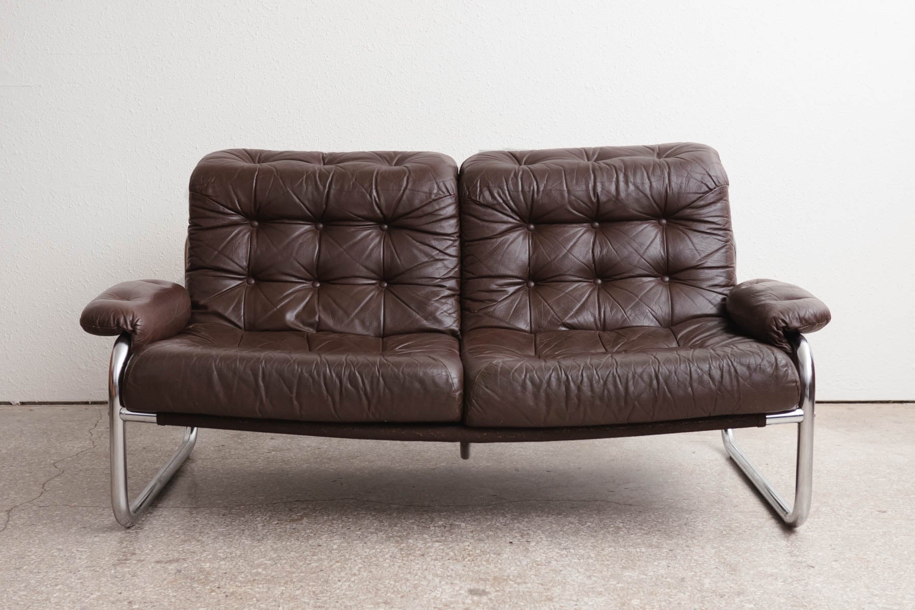 style: Mid Century, Modern, Swedish, sofa, couch, loveseat material: leather, chrome designer: Johan Bertil Häggström, Sweden age: vintage, 1970s condition: good, age related wear - see pictures