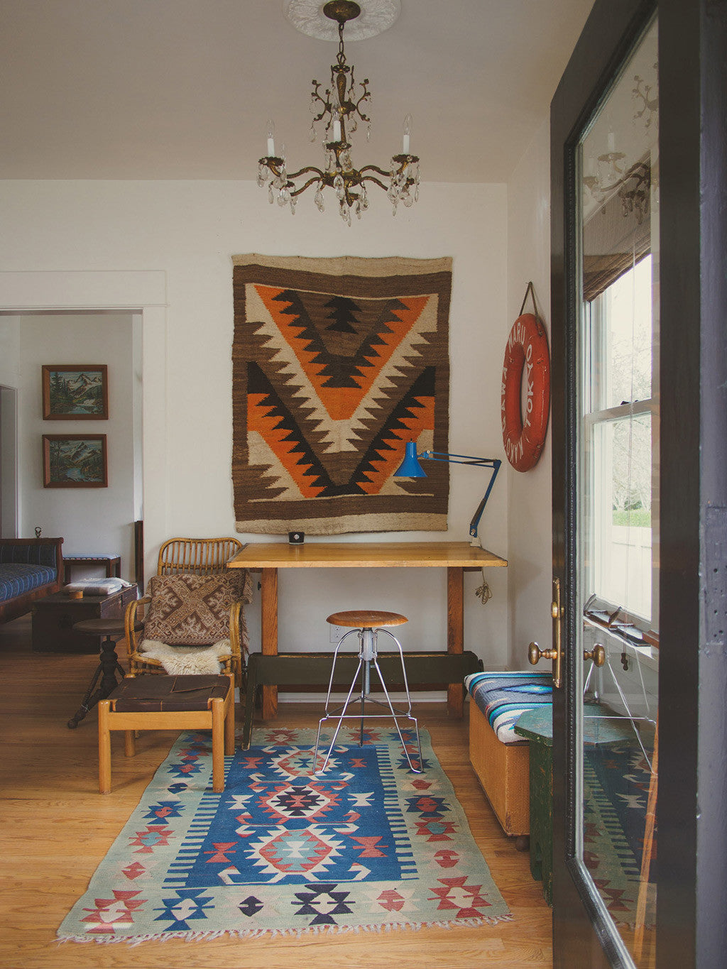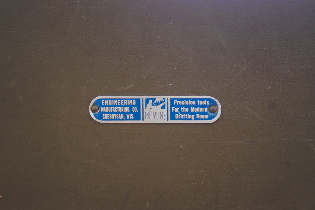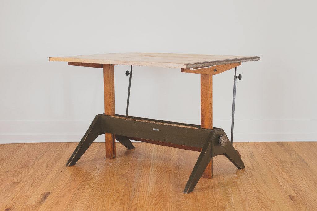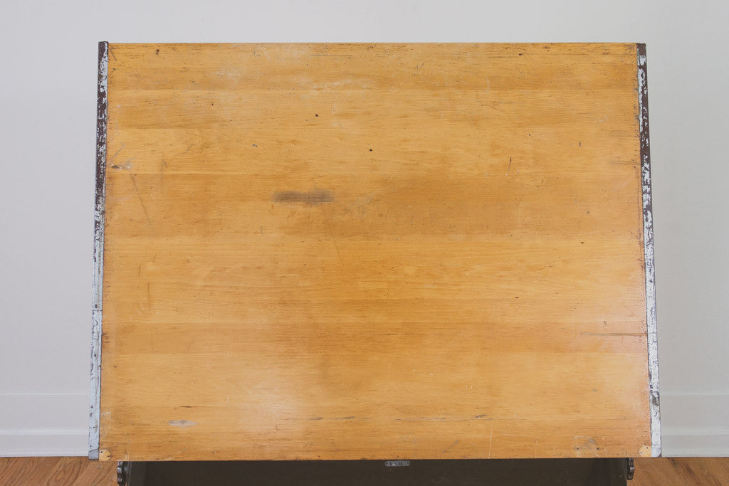 This vintage drafting table is a larger model manufactured by Mayline. It's solid oak with cast iron hardware and is adjustable in height and pitch. This table is sturdy and in overall good shape with some age related wear. It could be used as a standing or seated desk and because of its height and size could also be used as a dining table, kitchen island or bar table. Please see pictures for detailed condition.