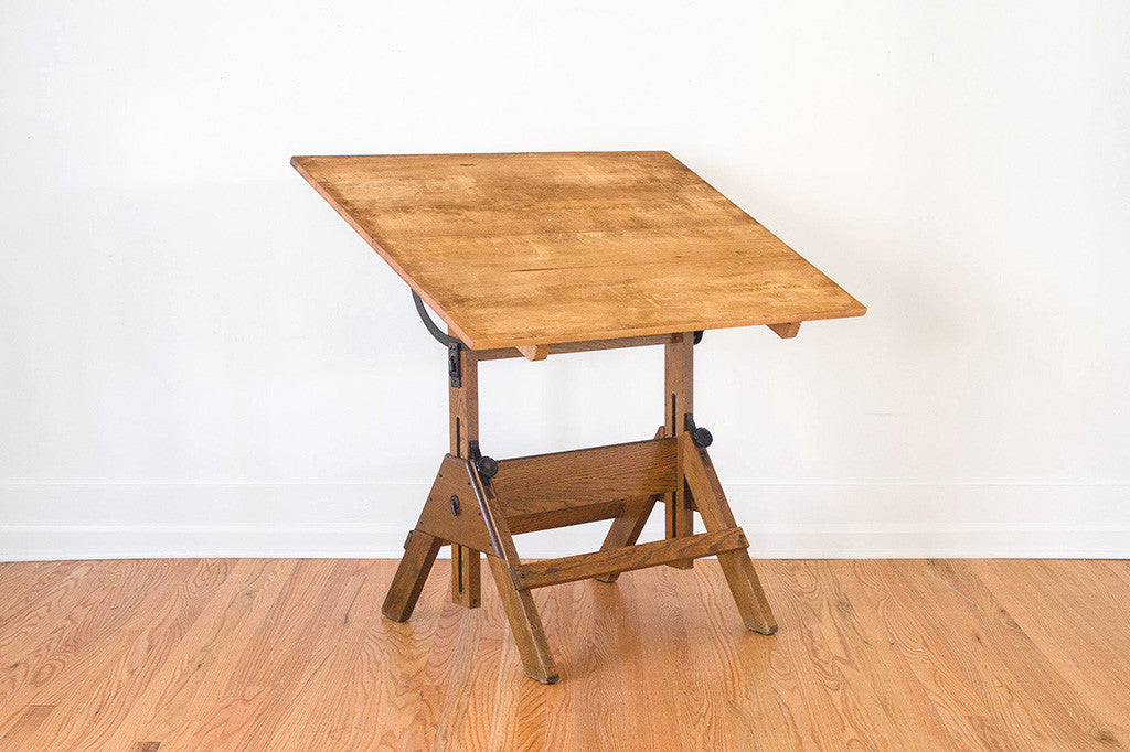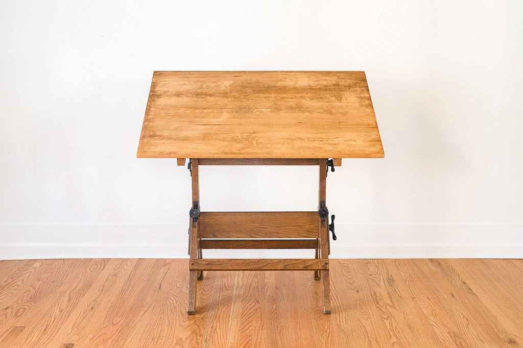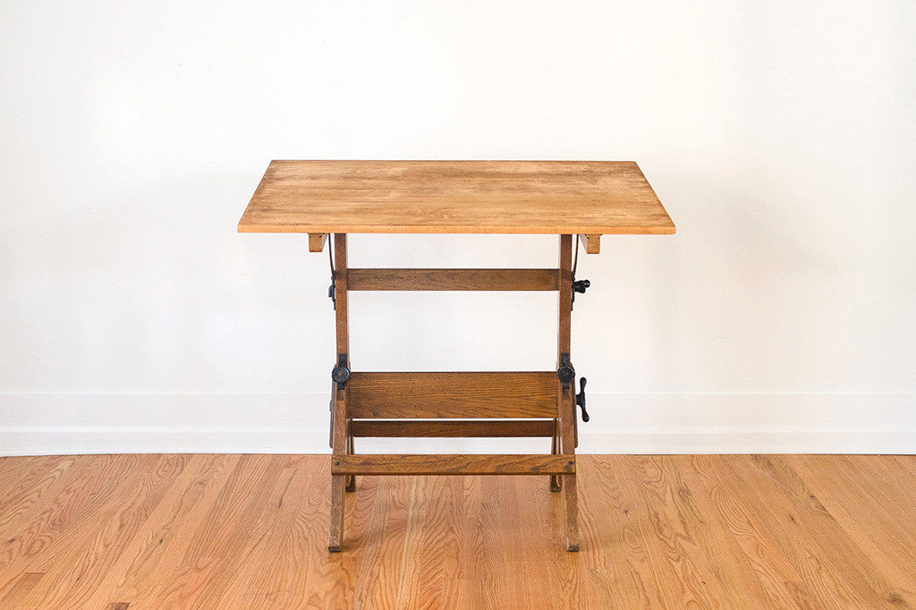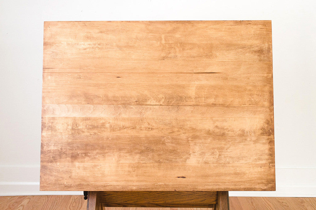 This vintage drafting table is a larger model manufactured by Hamilton in Two Rivers, Wisconsin. It's solid oak with cast iron hardware and is adjustable in height and pitch. This table is sturdy and in overall great shape besides the age-related wear. It could be used as a standing or seated desk and because of its height and size could also be used as a dining table, kitchen island or bar table. Please see pictures for detailed condition of this piece.