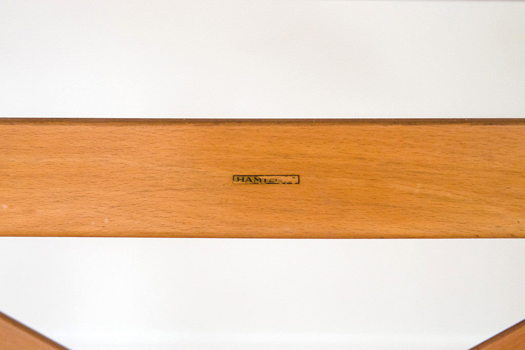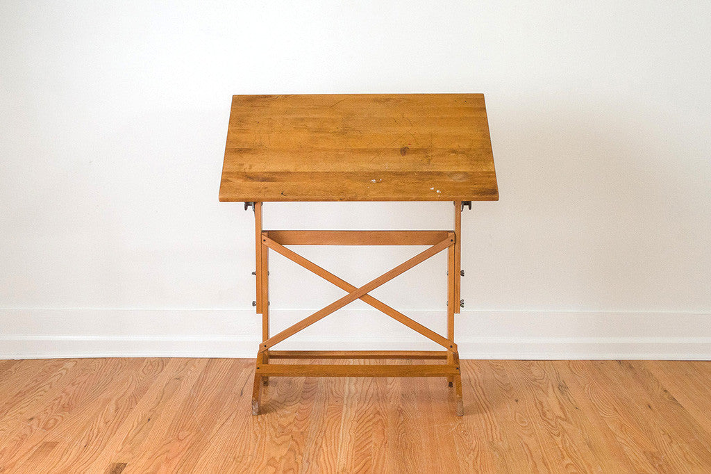 This vintage Hamilton brand drafting table is a medium to smaller sized model. It has easy to use metal hardware and is adjustable in height and pitch. The oak top and base on this piece have a nicely aged patina. This table is sturdy and in overall great shape besides the age-related wear. It would make a great standing or seated desk and because of its height and size it could also be used as a kitchen table, island or bar table. Please see pictures for detailed condition of this piece.