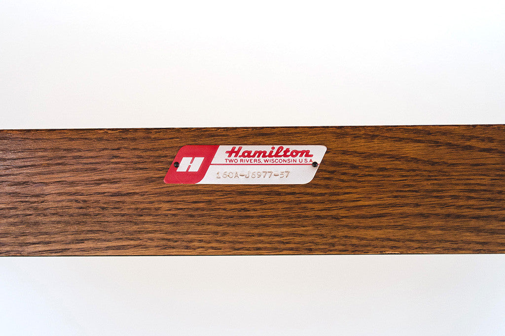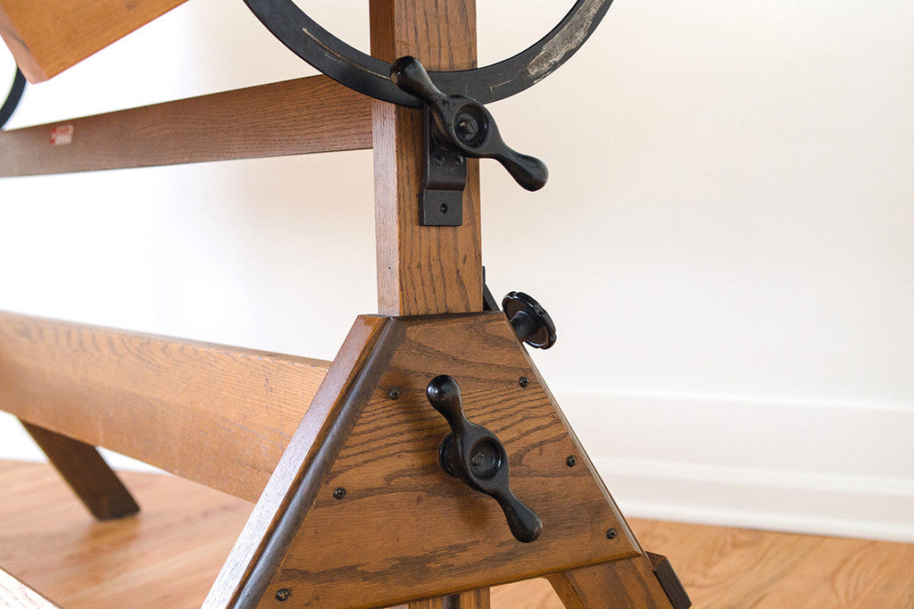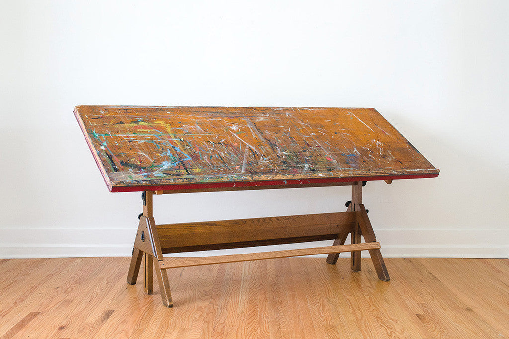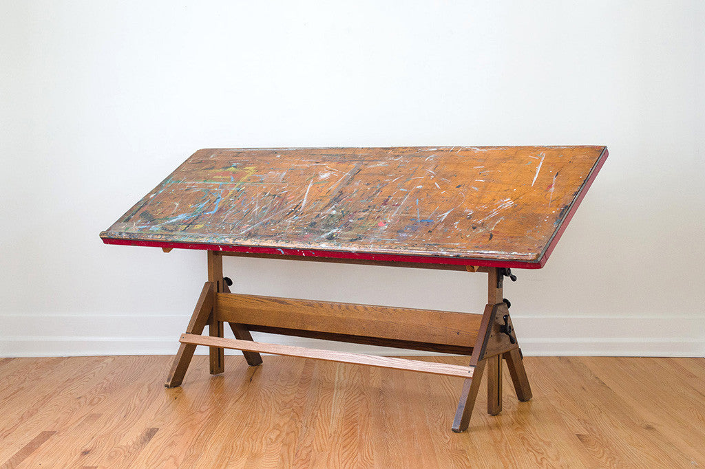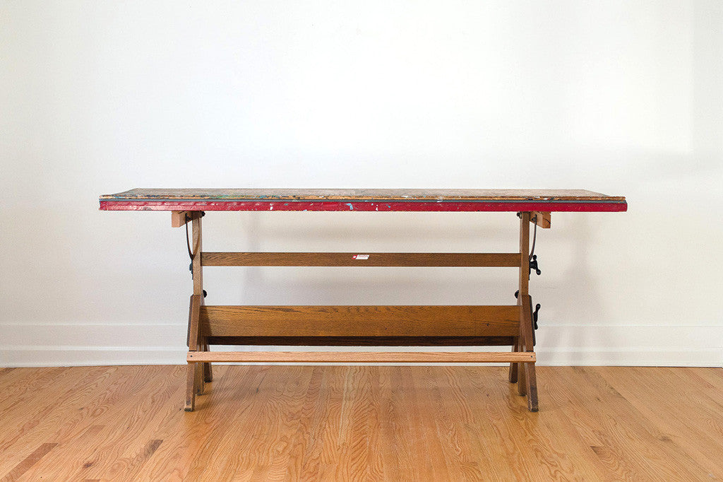 This vintage drafting table is an extra large sized model manufactured by Hamilton in Two Rivers, Wisconsin. It has an oak base, cast iron hardware and is adjustable in height and pitch. The top has a nicely aged patina with layers of paint from years of use in a studio. This table is sturdy and in overall great shape besides the age-related wear. It could be used as a standing or seated desk/workspace and because of its height and size it could also be used as a really cool dining table, kitchen island or bar table. Please see pictures for detailed condition of this piece.