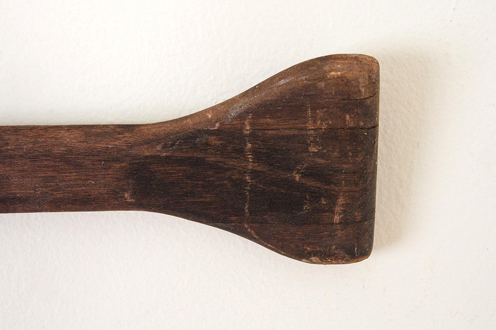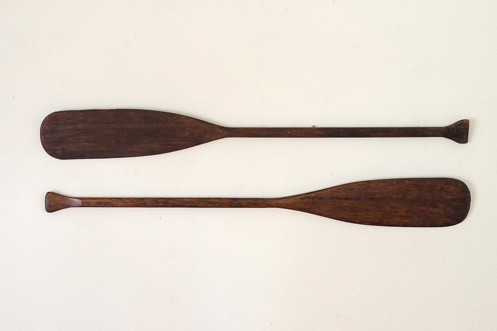 These hand carved oars have a dark walnut finish. They are naturally distressed and have eye hooks for mounting. Please see pictures for detailed condition of this piece.
