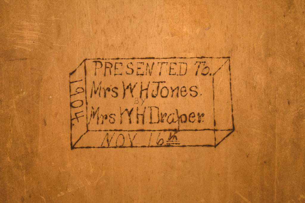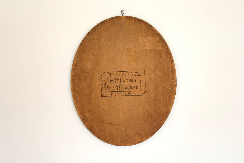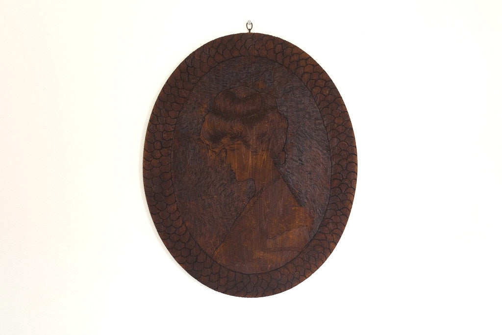 This vintage portrait was hand carved on wood in 1904. It has scalloped carving framing the perimeter and a detailed portrait of a pretty woman in the center. It is engraved on the back with the date and names of the person who made it and the person it was made for.