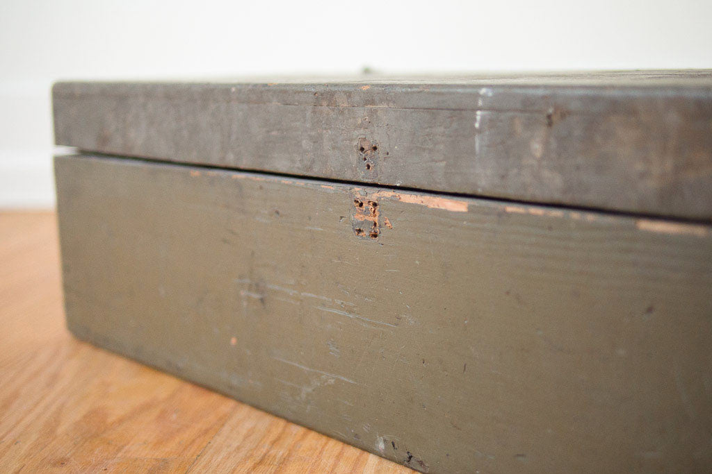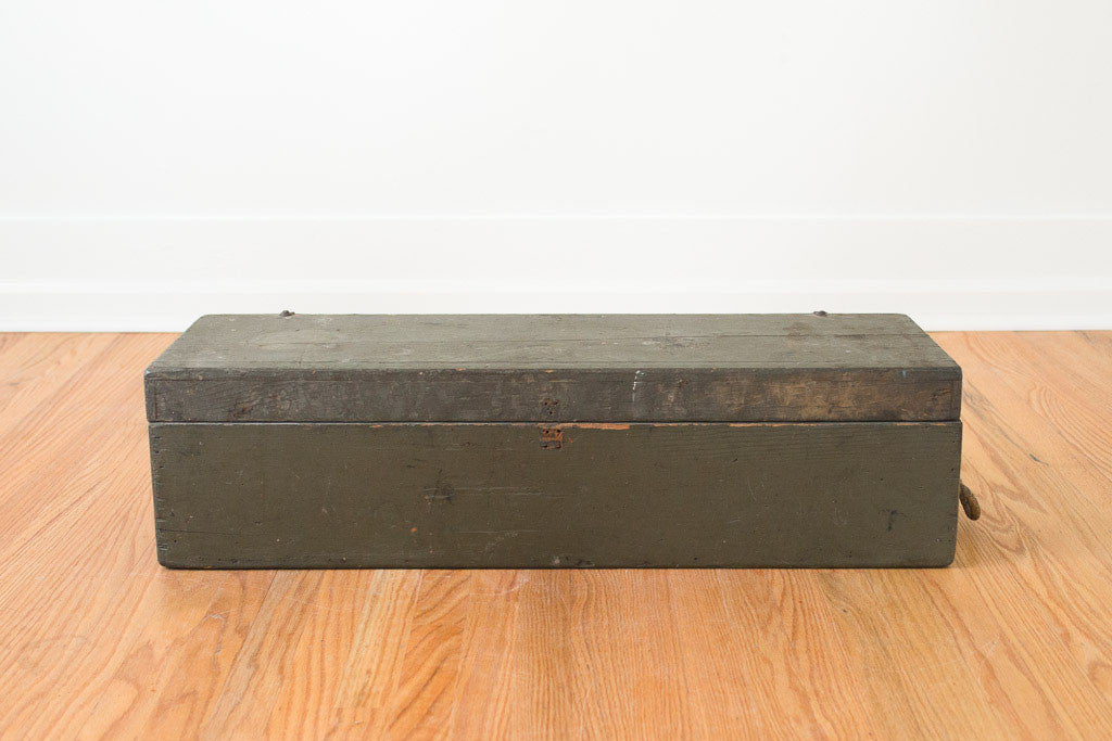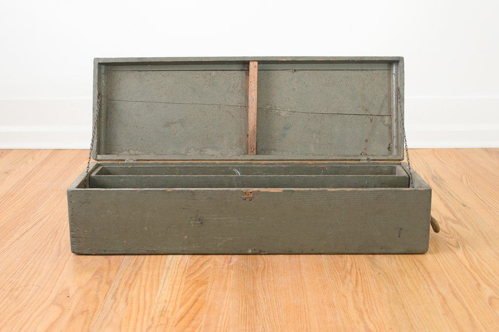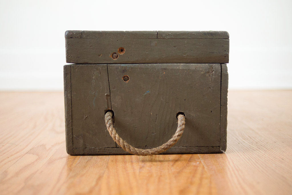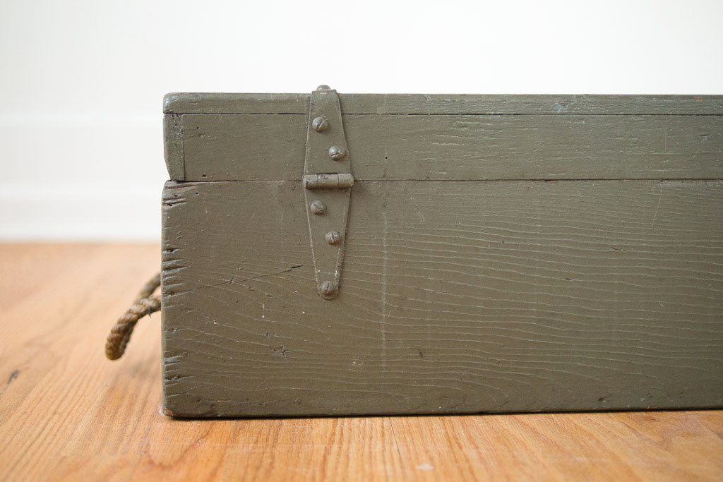 This old, hand crafted, painted wood trunk has great character and patina. It was probably used in someone's shop to store tools. It has a removable storage tray that spans the width on the trunk. One of the handles is a piece of old rope the other is metal. It's a very cool old piece.