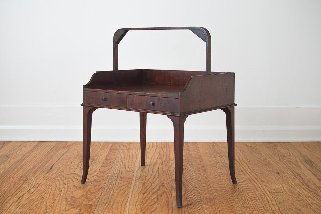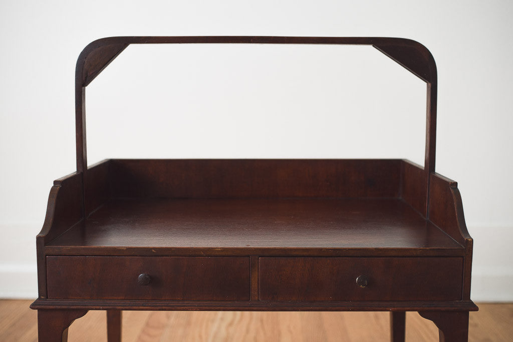This antique serving side table has two drawers and a dark finish. It's in good shape with age related wear. See pictures for detailed condition.