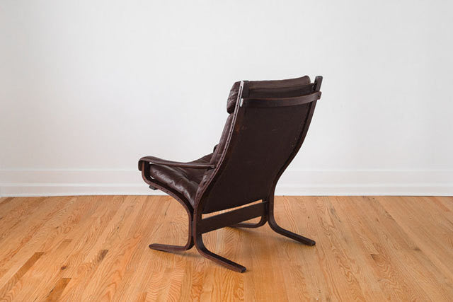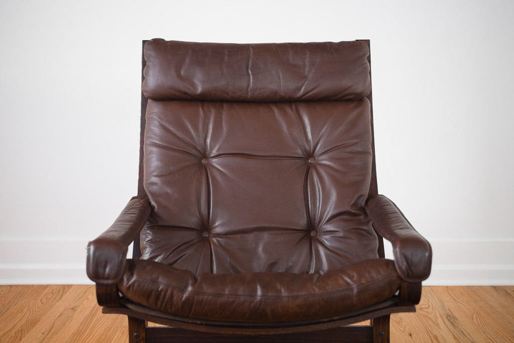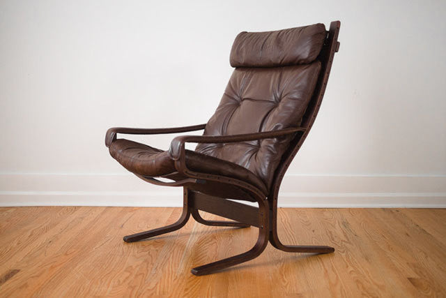 We have a vintage dark brown leather high back Siesta chair with arm rests in the shop. This chair was designed by Ingmar Relling and most likely made by Westnofa in the 1960s/70s. The leather is in very good condition for its age with some very light distressing and the wood (probably walnut) base has very minimal wear, but nothing that detracts. It has recently been re-stuffed, the wood was polished and leather conditioned.