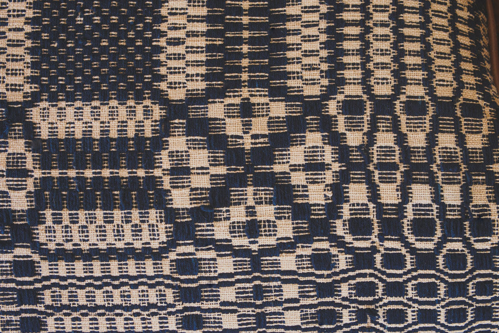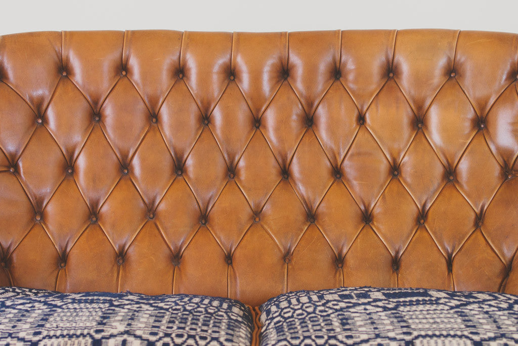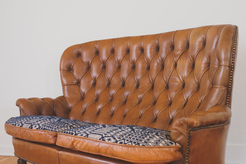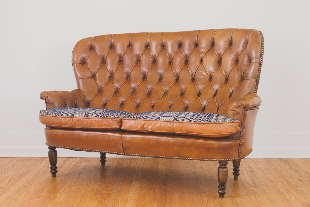 This antique leather settee is part of our HS Collection. It has a tufted chesterfield wingback frame, tan and navy woven down-filled cushions, brass nailhead trim and carved wood legs. It's very comfortable and in excellent shape with light age related wear. Please see pictures for detailed condition.