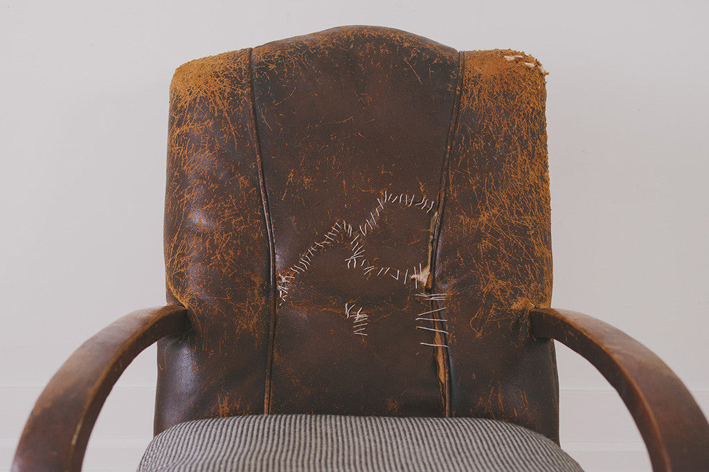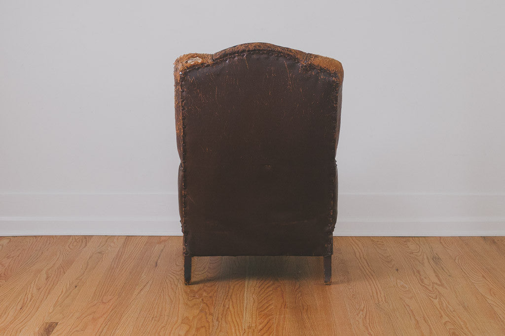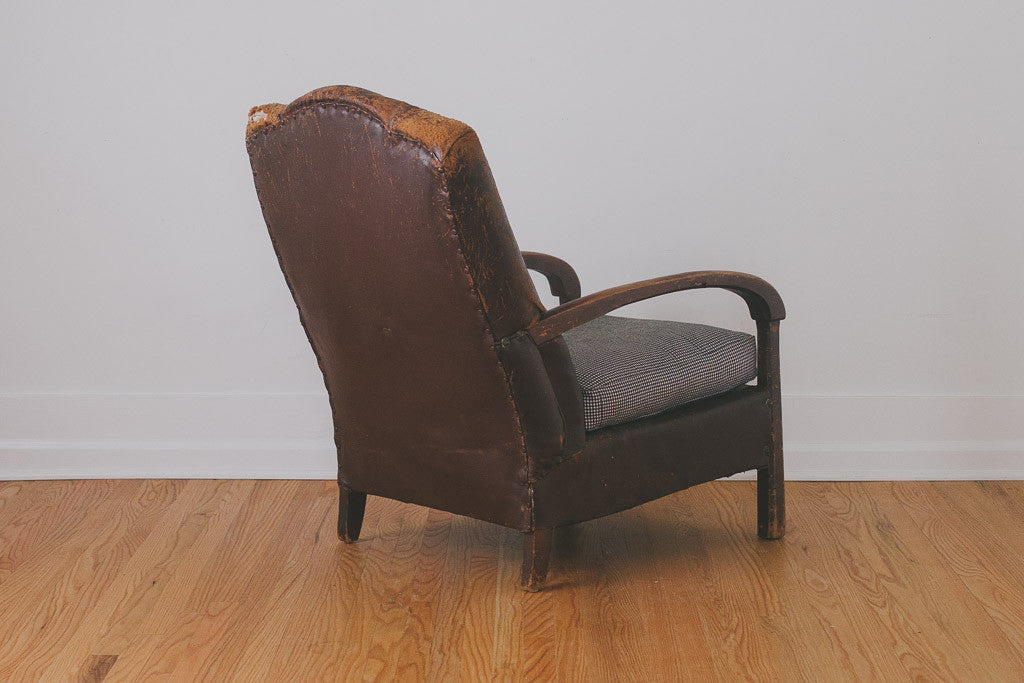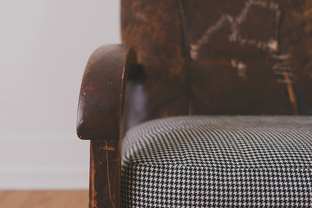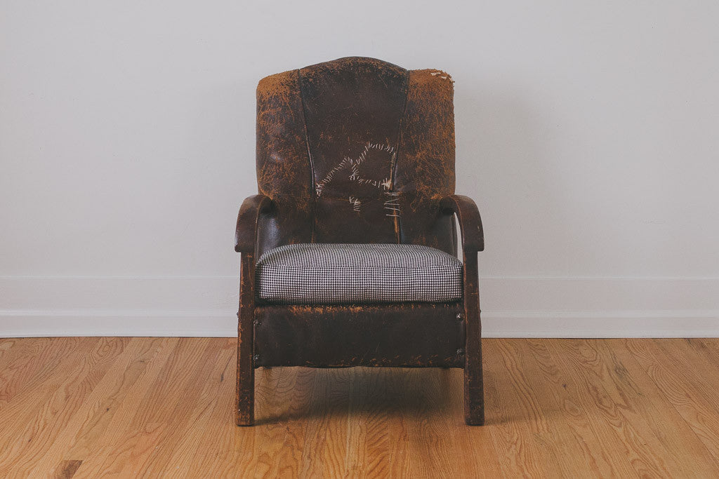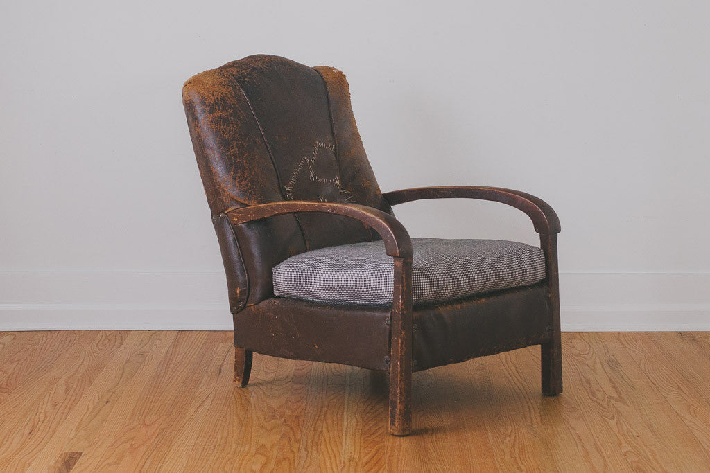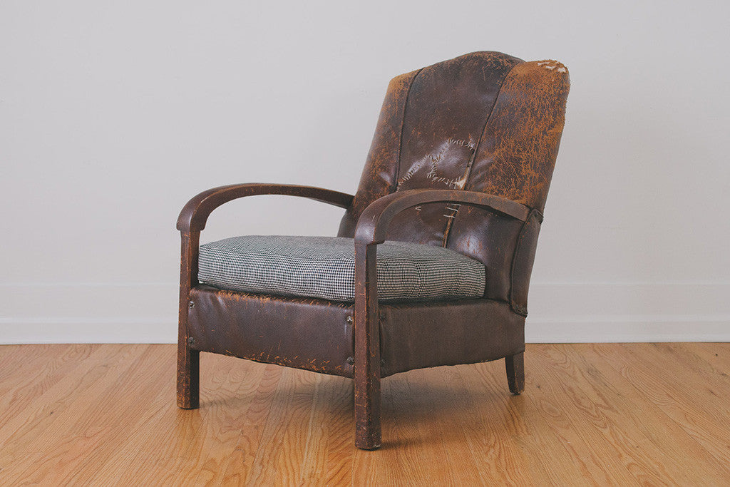 This vintage distressed leather chair is part of our HS Collection. It has heavily distressed and stitched brown leather upholstery, a solid wood frame with age related wear and a down-filled cushion that's upholstered in a black and white houndstooth fabric. This chair is extremely comfortable and long time personal favorite. Please see pictures for detailed condition.