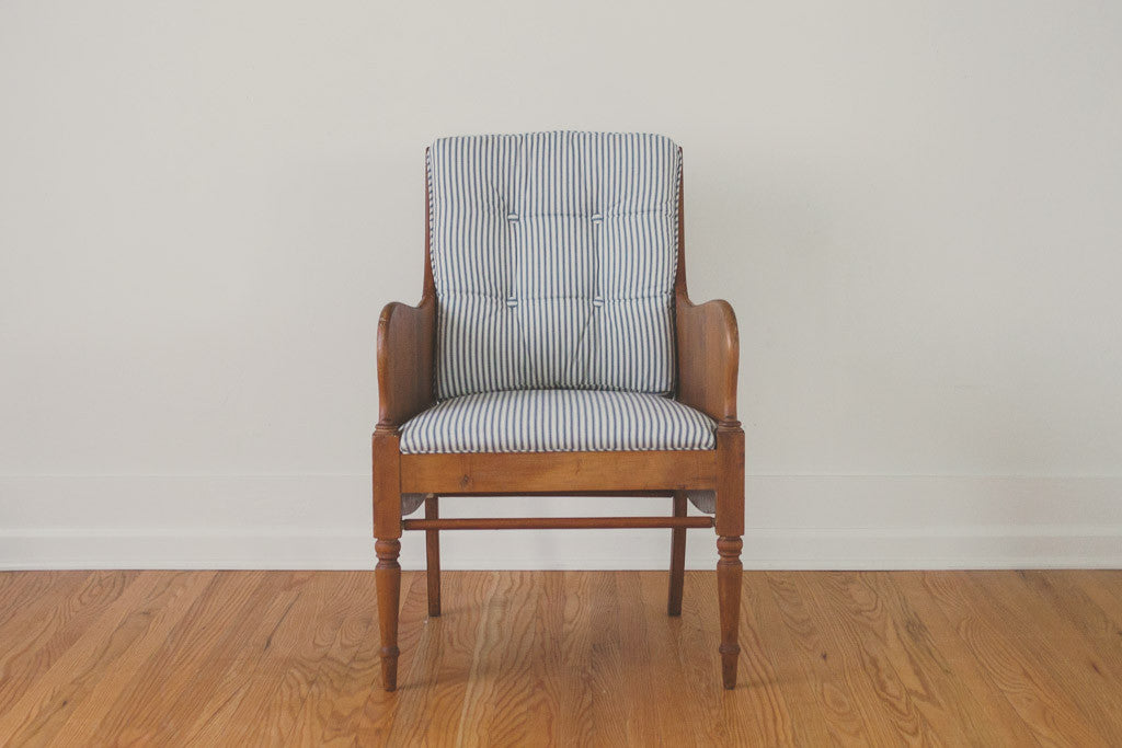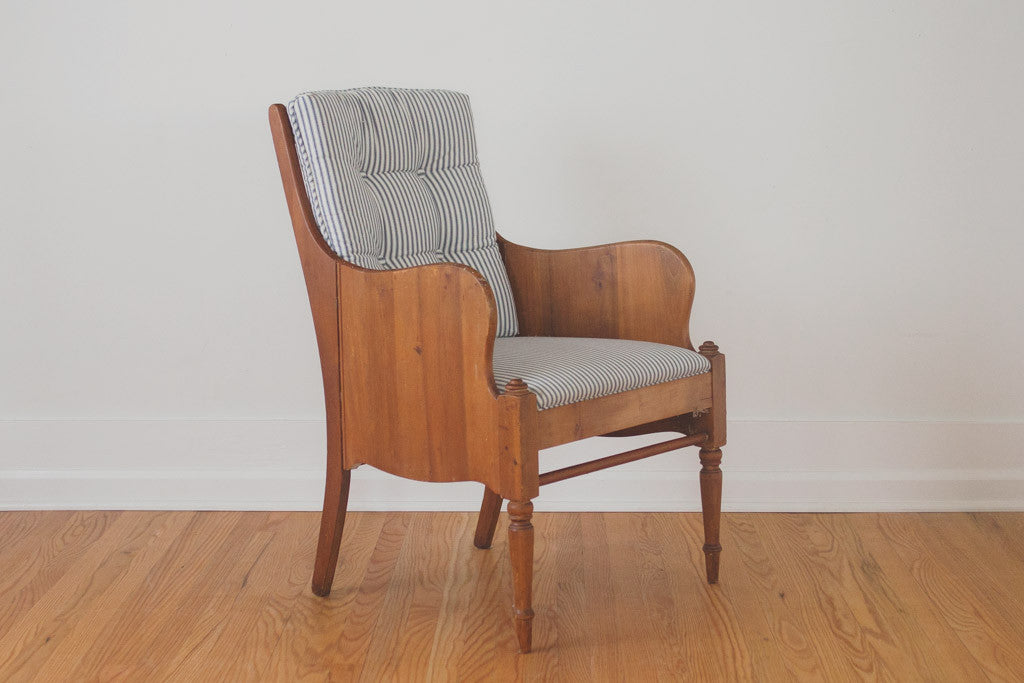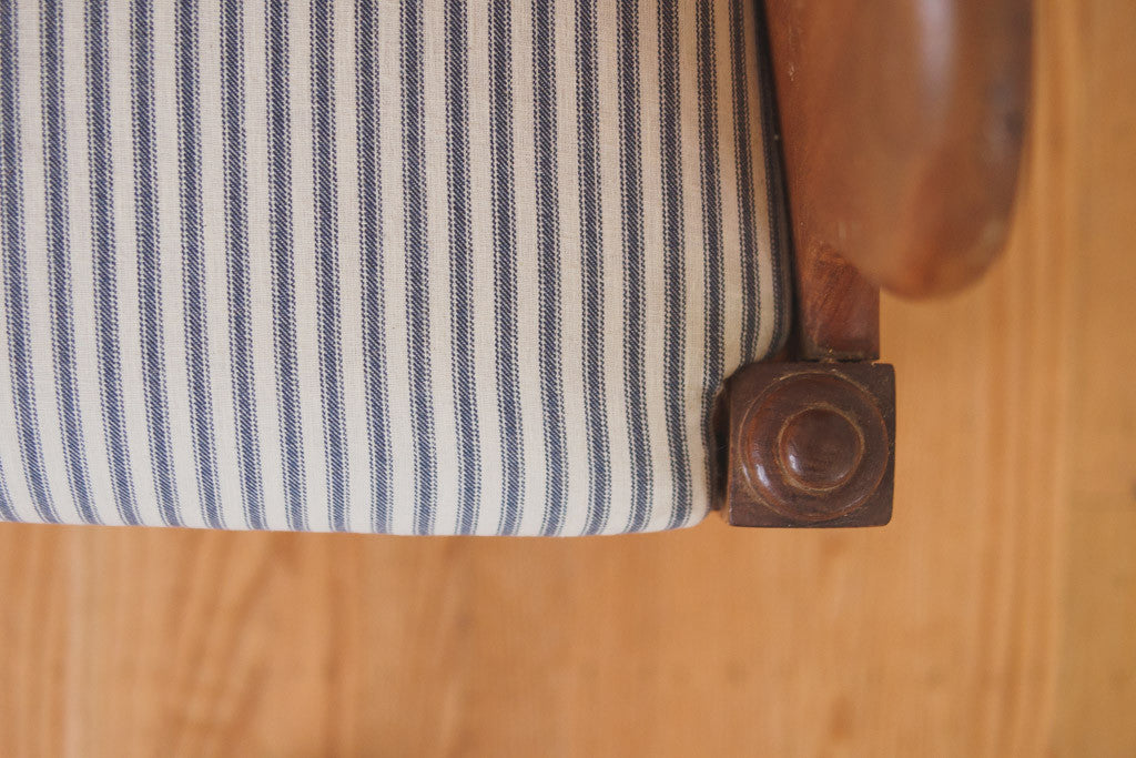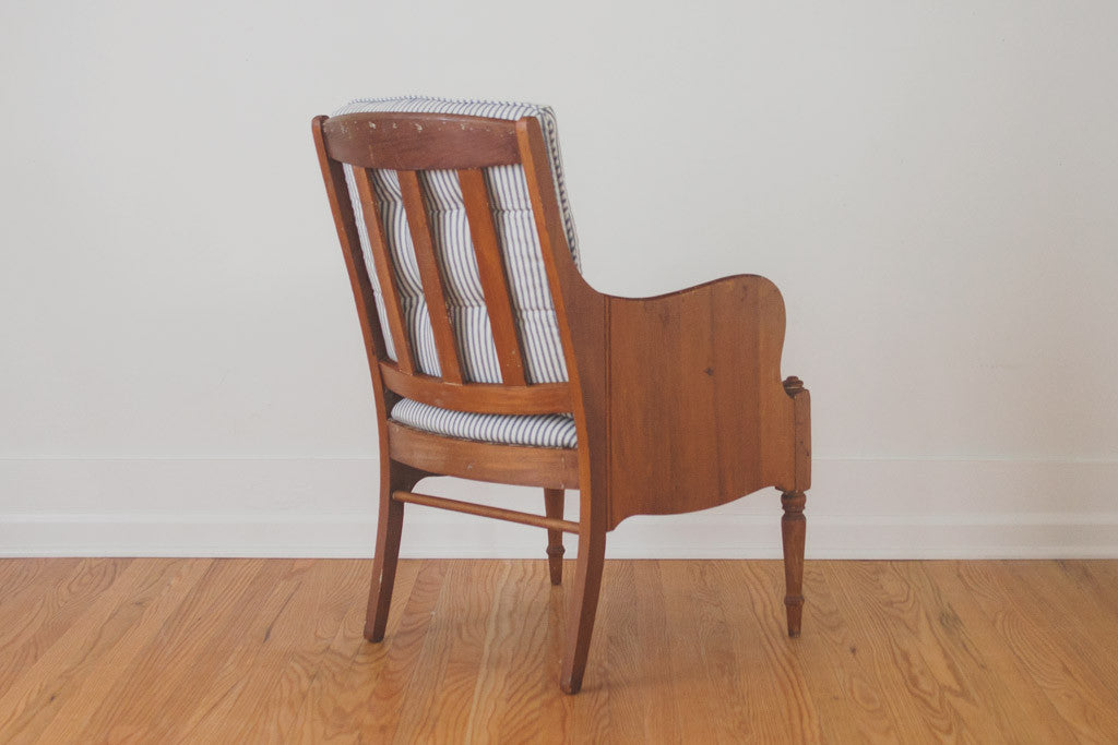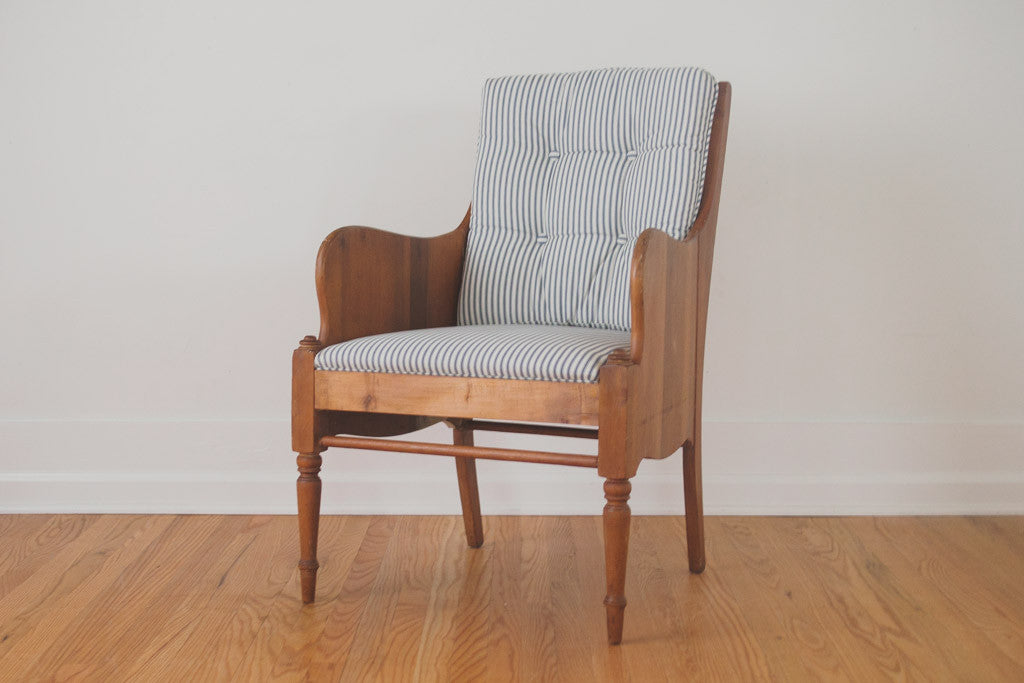 This antique maple chair has blue and white French ticking stripe upholstery, a loose tufted back cushion and a carved wood frame. It's very comfortable and in great shape with light age related wear. Please see pictures for detailed condition.