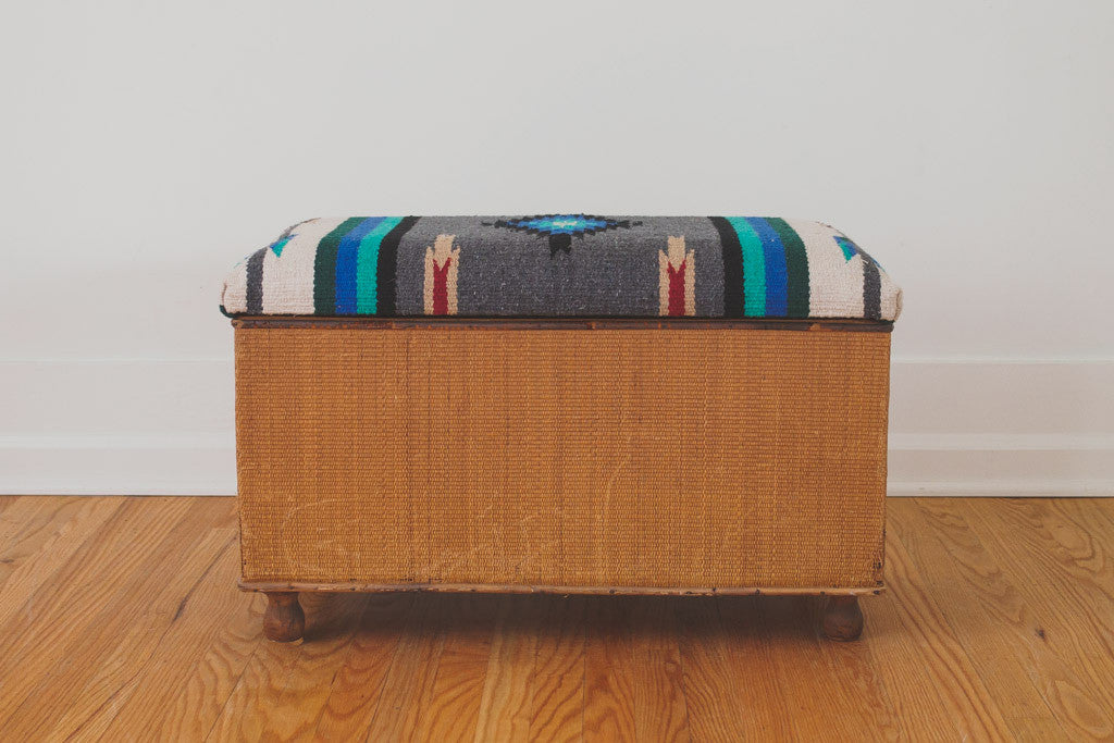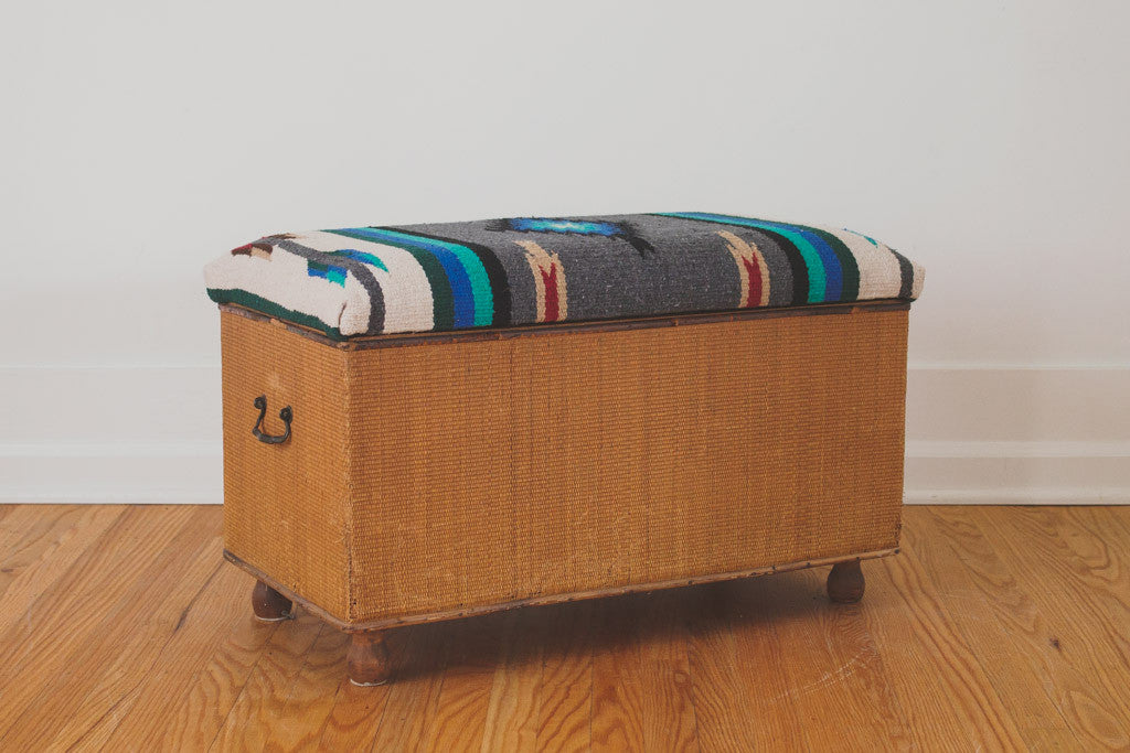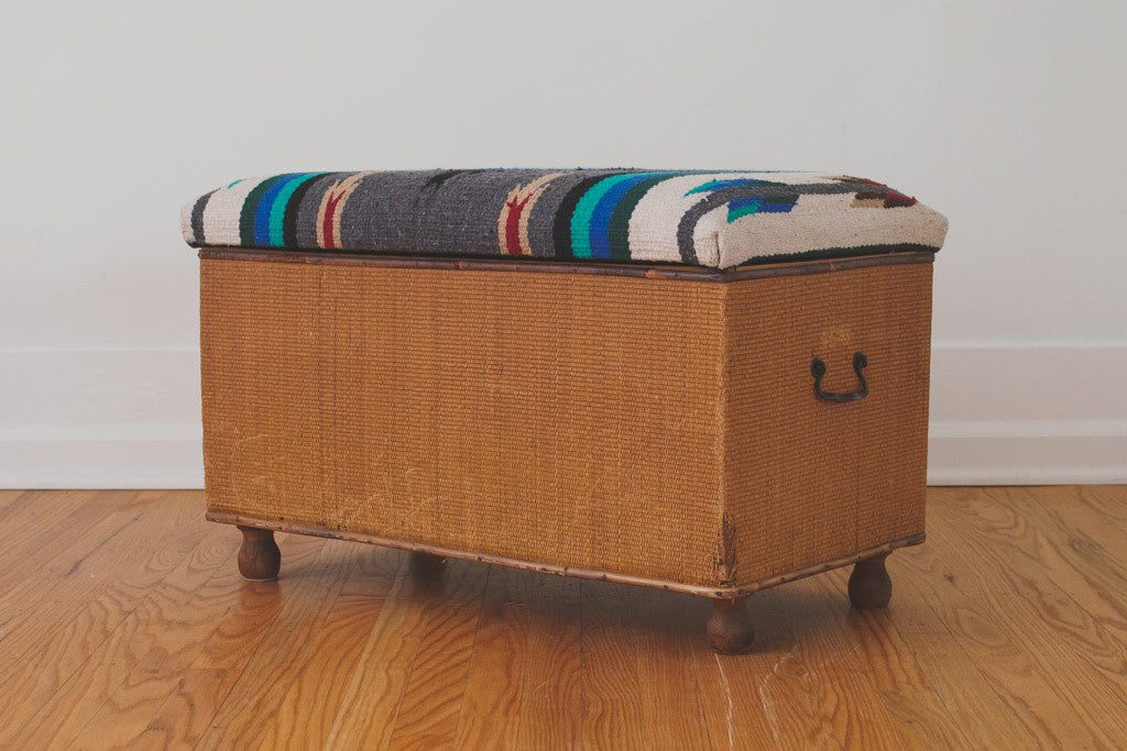 This vintage storage bench has a vibrant blue, black, gray, red and white kilim rug upholstered seat on a woven frame with bun feet. It's in good shape with some light age related wear. Please see pictures for condition.