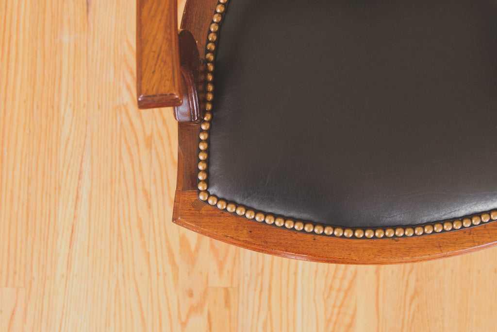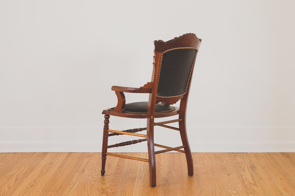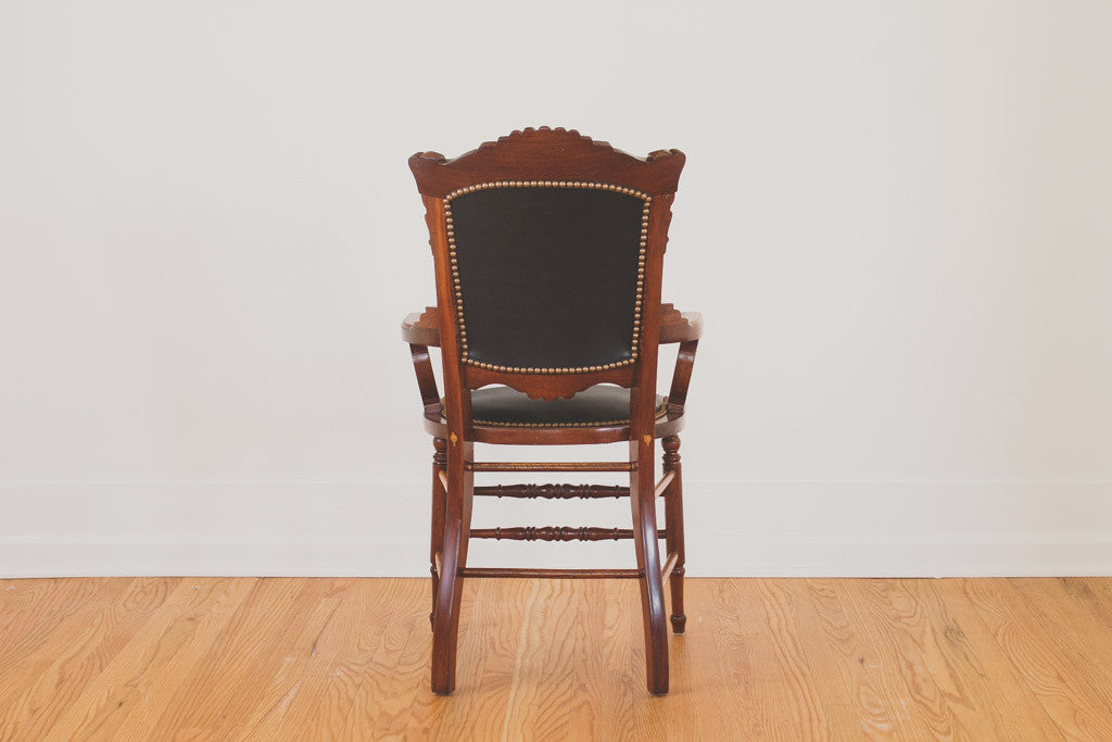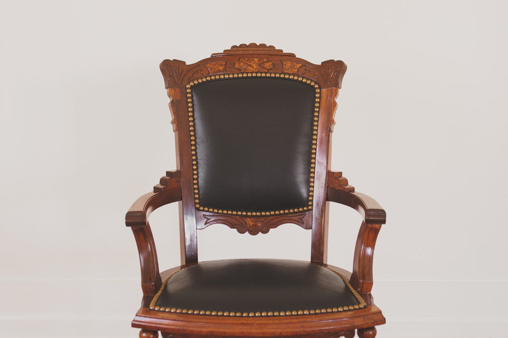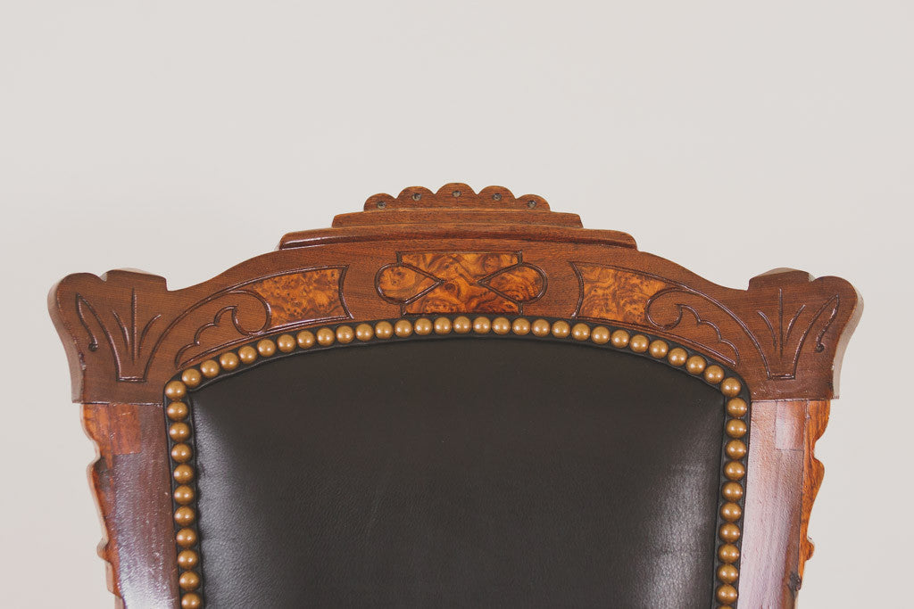 This antique carved wood chair is upholstered in black leather with brass nailhead trim. It's in excellent shape and would be a nice addition to any room as an accent chair or at a desk. Please see pictures for condition.